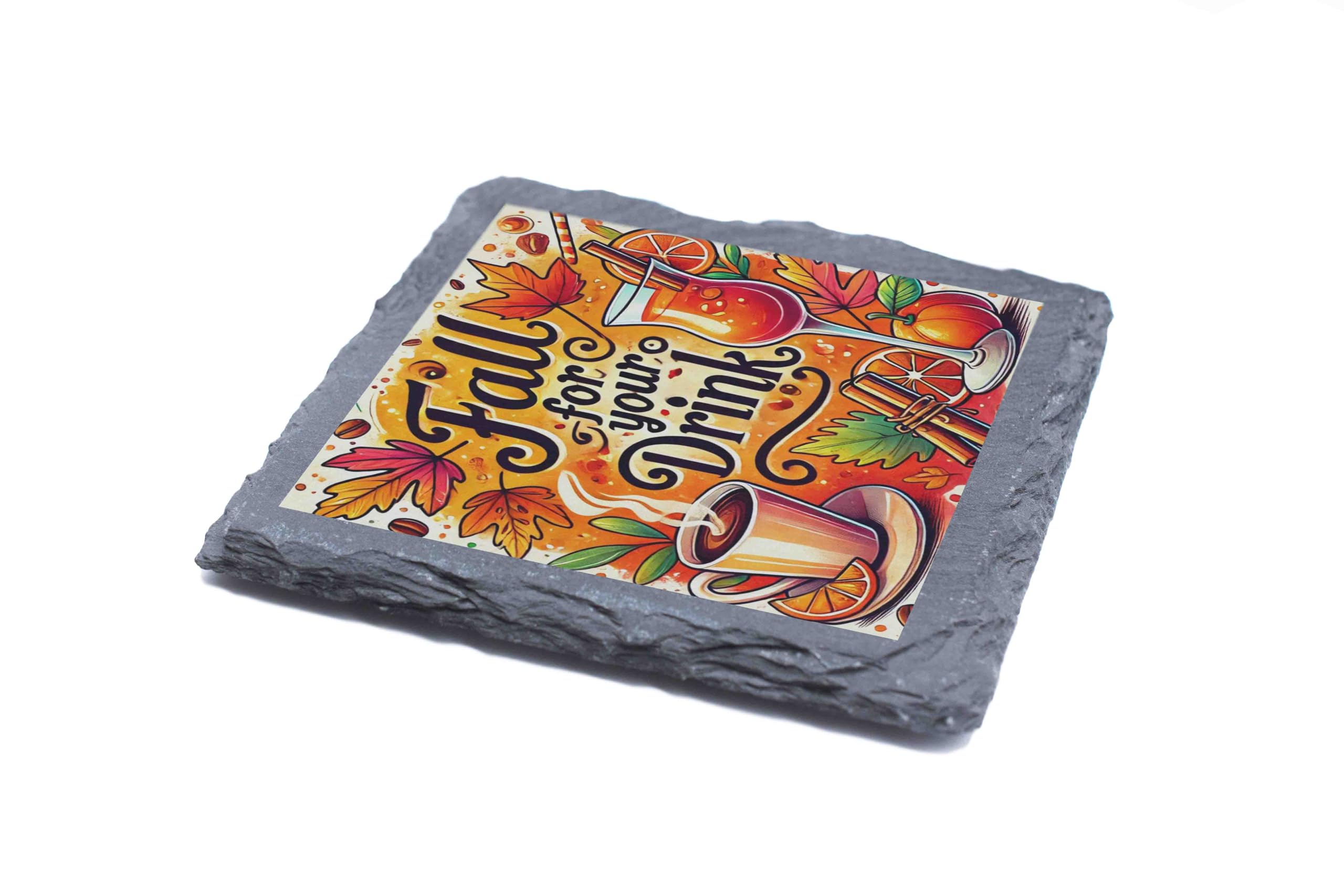 Celebrate the cozy vibes of autumn with the "Fall for Your Drink" slate coaster. This delightful coaster showcases a colorful design of fall leaves, spiced drinks, and warm hues, capturing the essence of the season. Made from premium natural slate, it combines durability with a rustic charm, making it a standout piece for your coffee table or bar setup. Designed with practicality in mind, it features a felt backing to protect your surfaces from scratches and slipping. Whether you're enjoying a pumpkin spice latte or a mulled cider, this coaster is the perfect companion. It also makes a wonderful gift for friends and family who adore the fall season. Add a touch of seasonal warmth to your home with this beautiful coaster!
