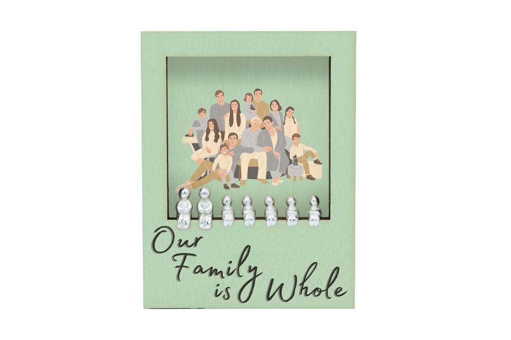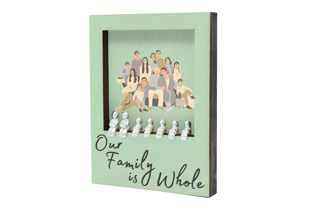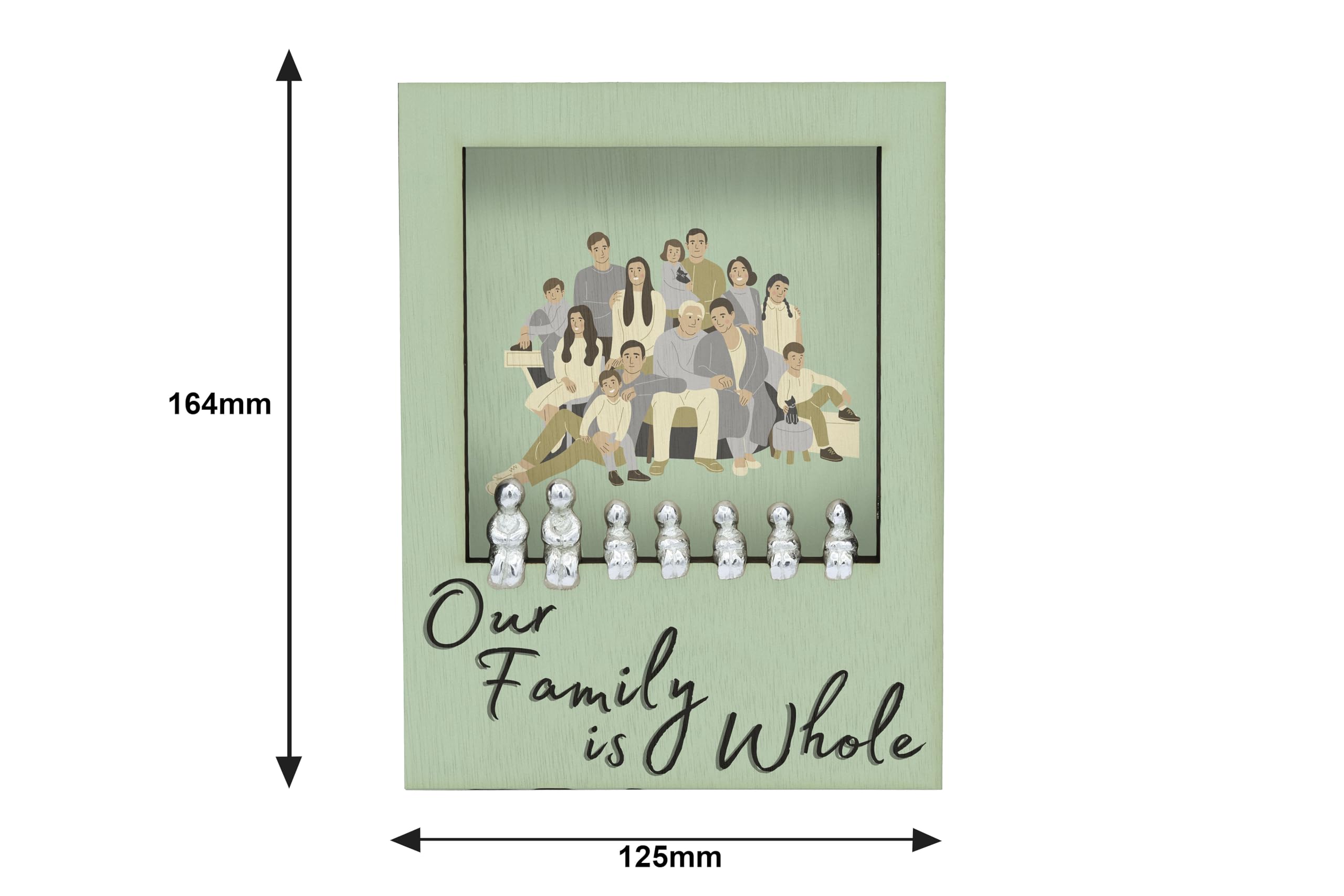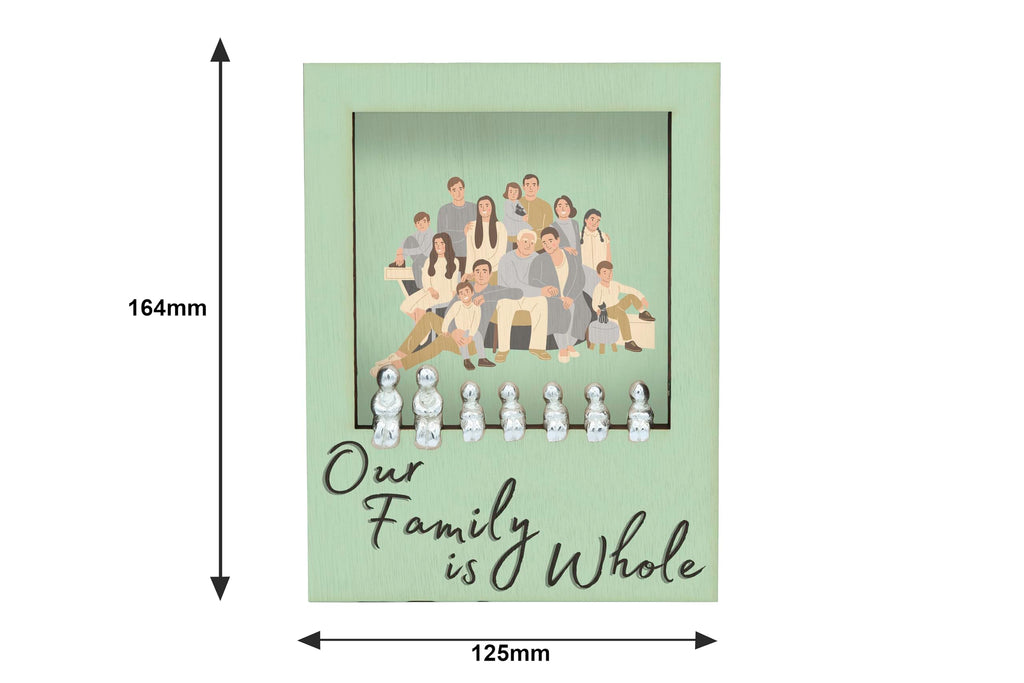 - Family love frame with a UV printed design that reads 'Our family is whole'