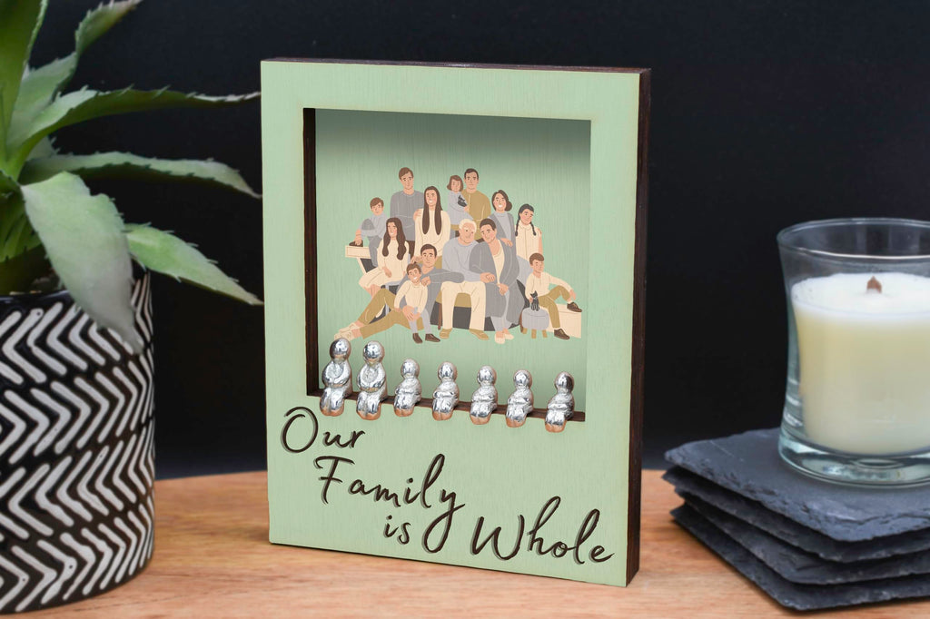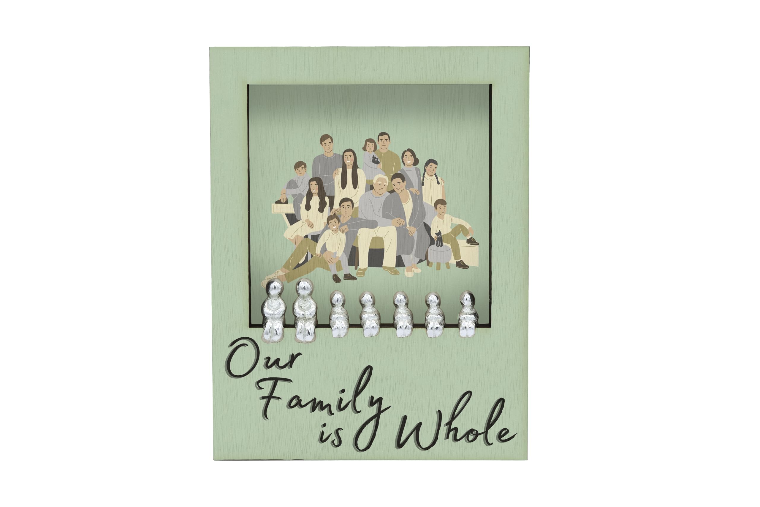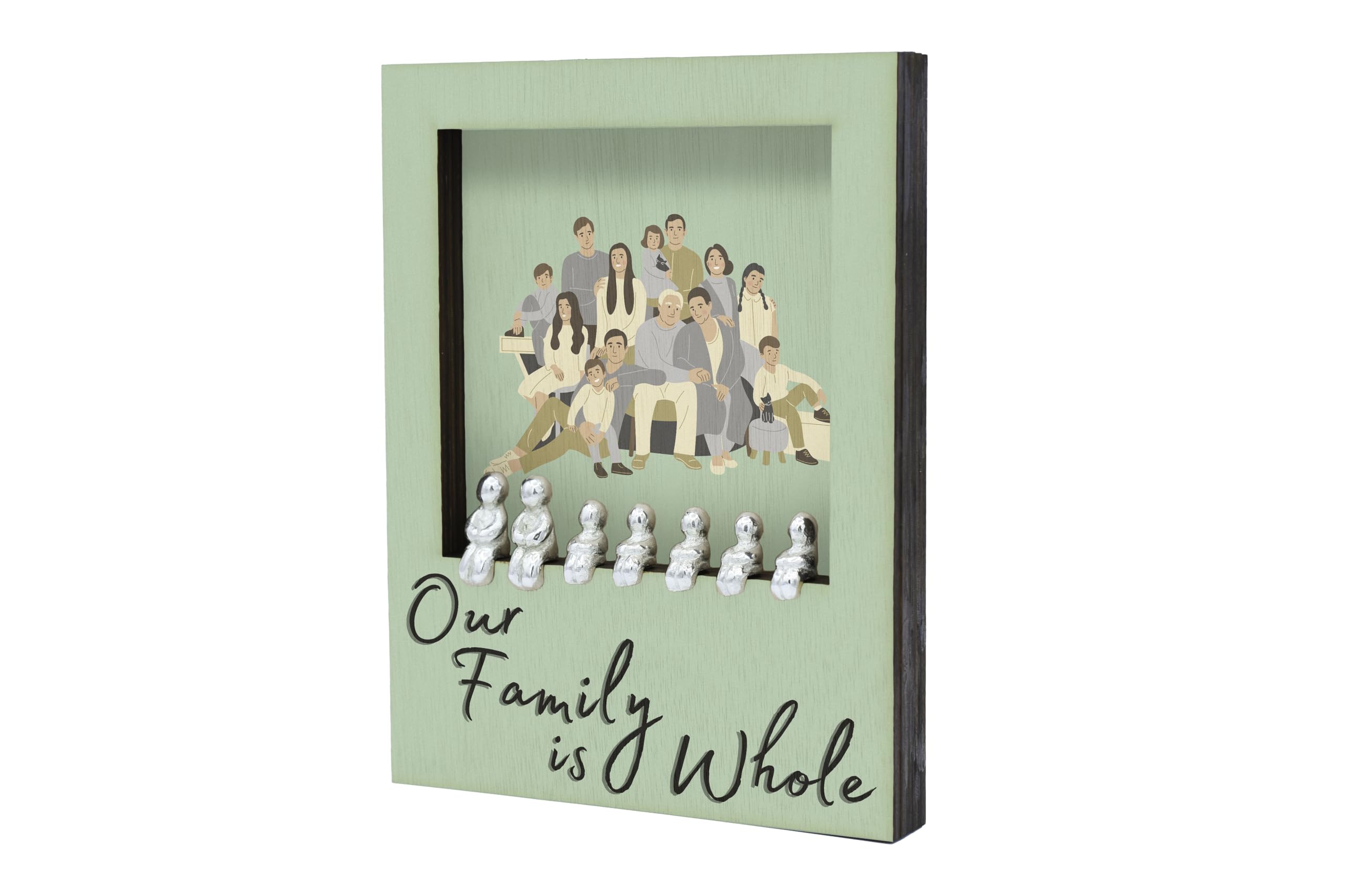 - Family love frame with a UV printed design that reads 'Our family is whole'