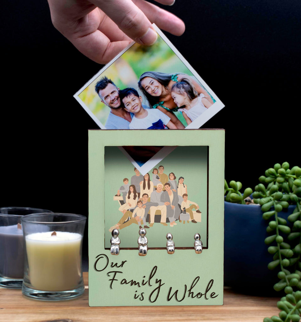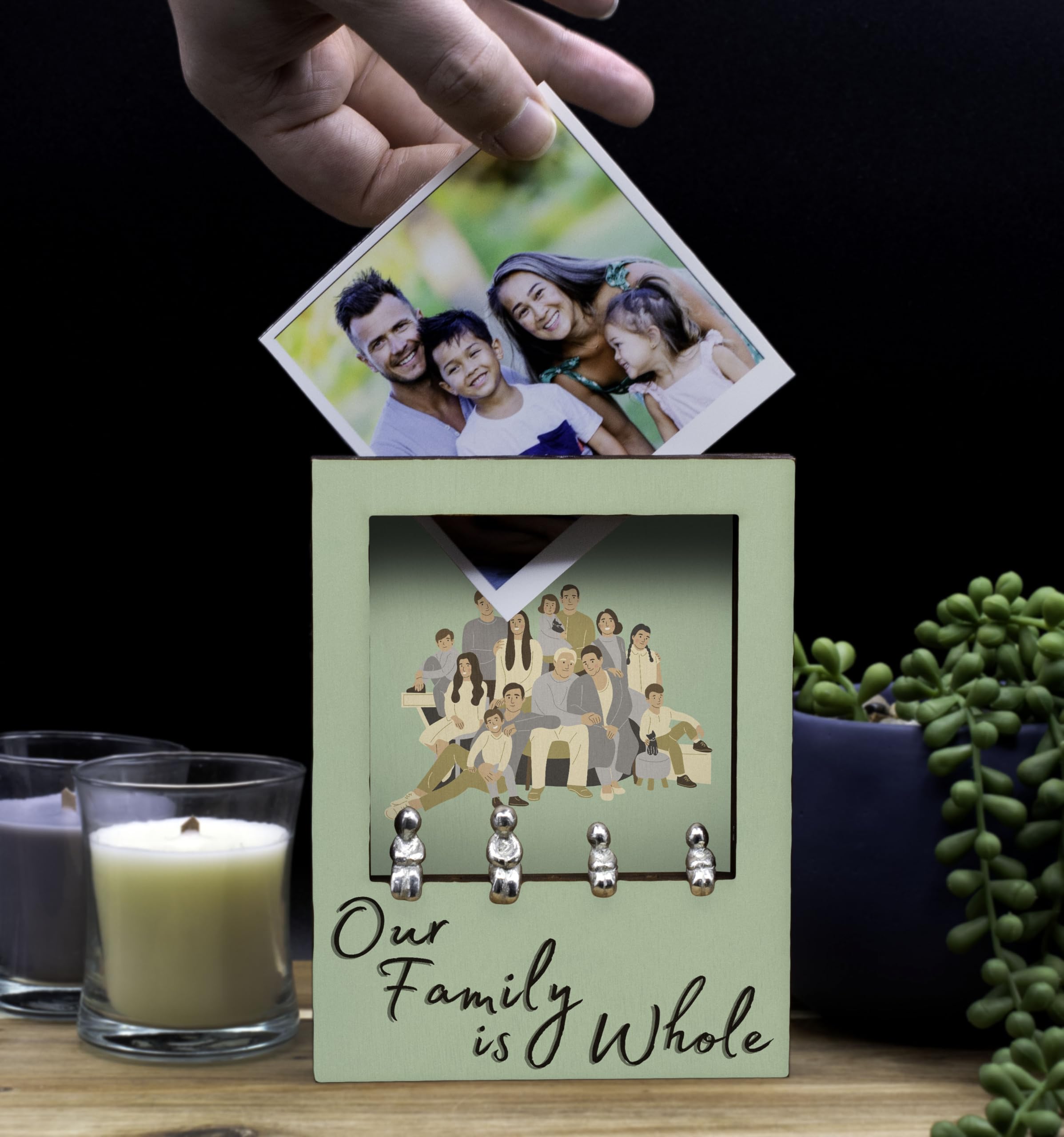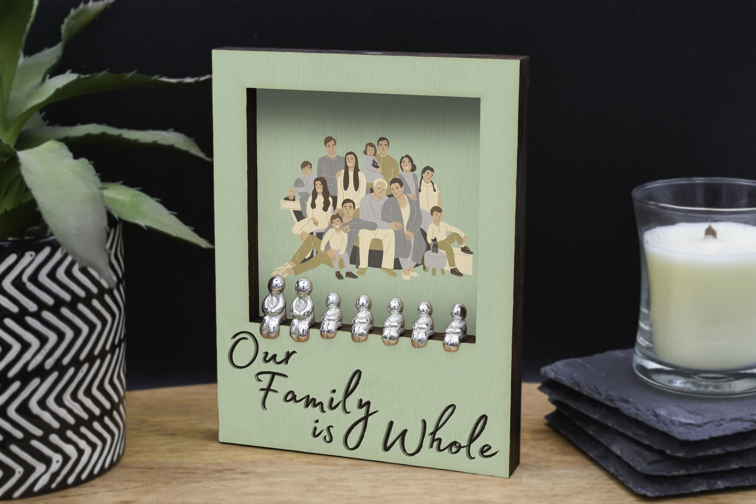 Add a touch of warmth and love to your home with our Handcrafted Family Love Frame with Handcrafted Wooden Display and Tin Figurines. This unique family decor piece is perfect for showcasing your favourite family photo in style. The handcrafted laser cut plywood photo frame features a UV printed design that reads 'Our family is whole'. The full colour printed frame shows a cute and family themed design that will bring a smile to your face every time you see it. The handmade tin figurines included add a special touch to this wholesome family decor. This family love frame makes for a perfect and unique family keepsake or a novelty family gift that will be cherished for years to come.
