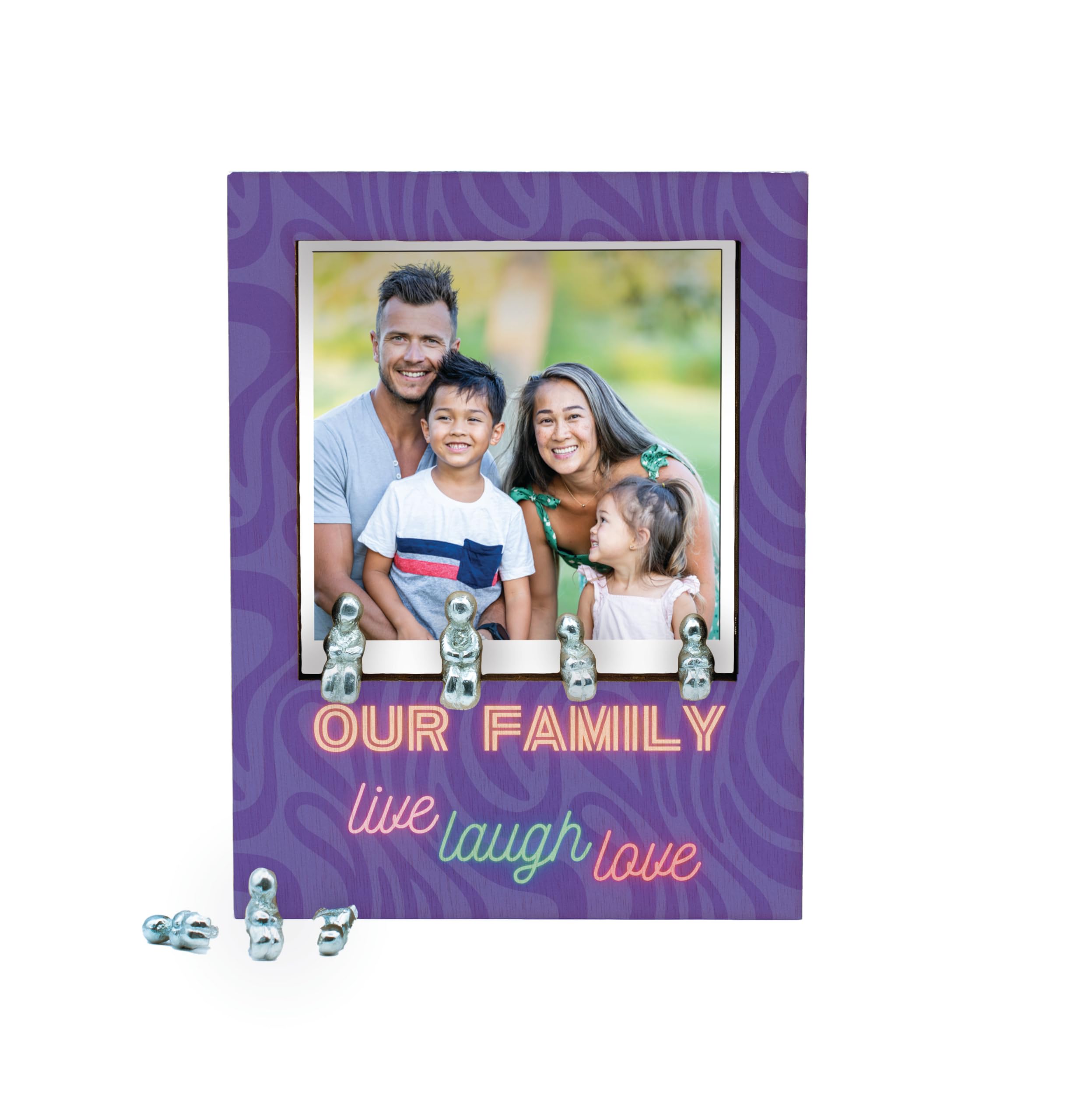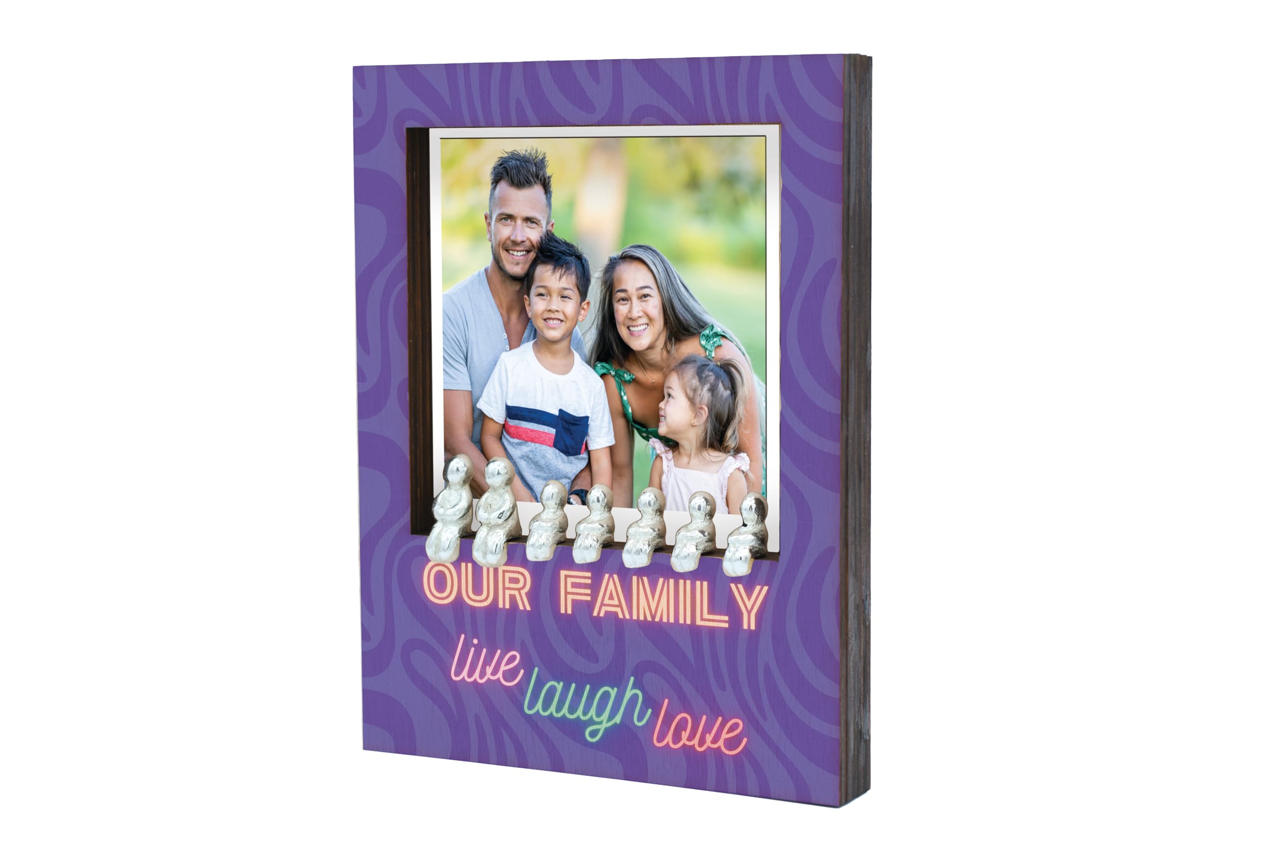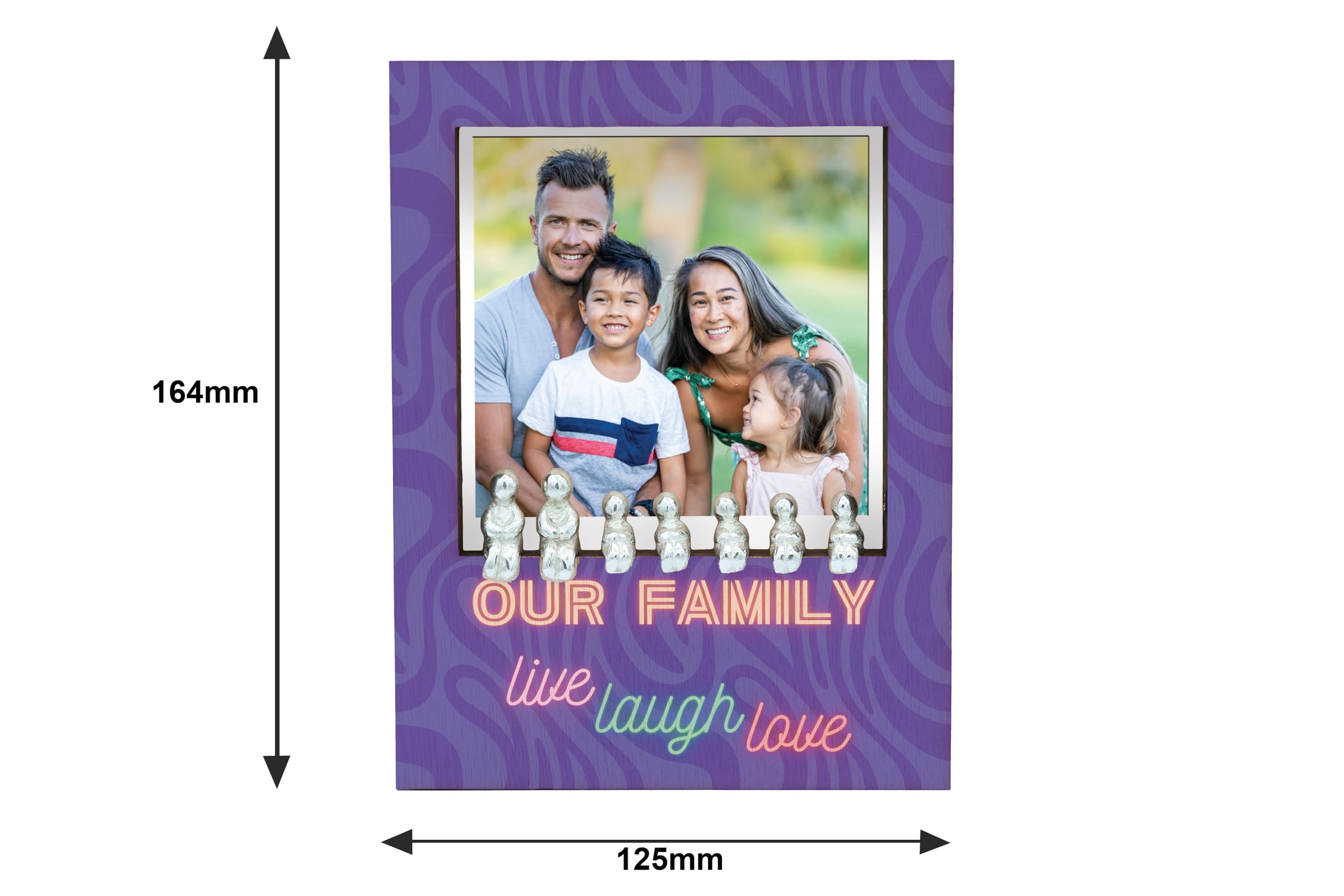 Add a touch of rustic charm to your home decor with this handcrafted laser cut plywood photo frame, featuring a tin figurine and a UV printed design that reads 'Our Family - Live Love Laugh'. The full colour printed frame showcases a cute purple disco themed design, making it an ideal piece for displaying your family's happy memories. This keepsake frame is a perfect gift idea for any occasion, and its colourful design will bring a cozy home theme to any room. Whether you're looking for a decorative frame for your own family photos or a thoughtful present for a loved one, this Family Love Laser Cut Plywood Photo Frame is sure to be a standout piece in any home.