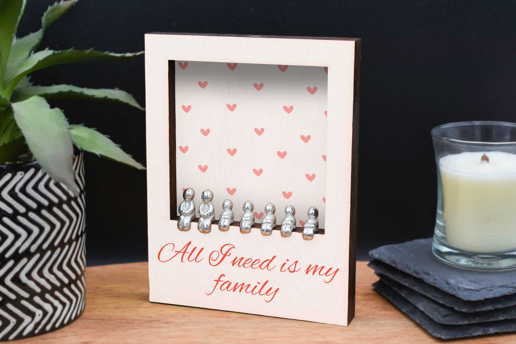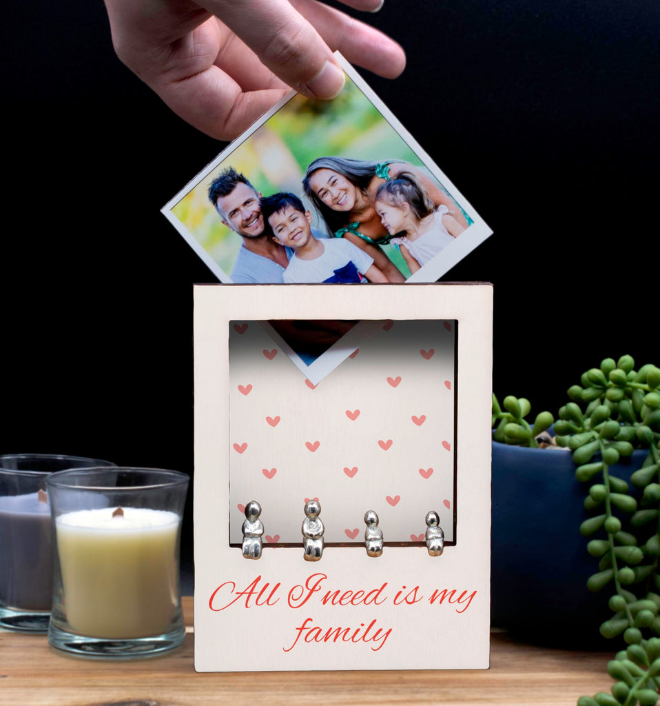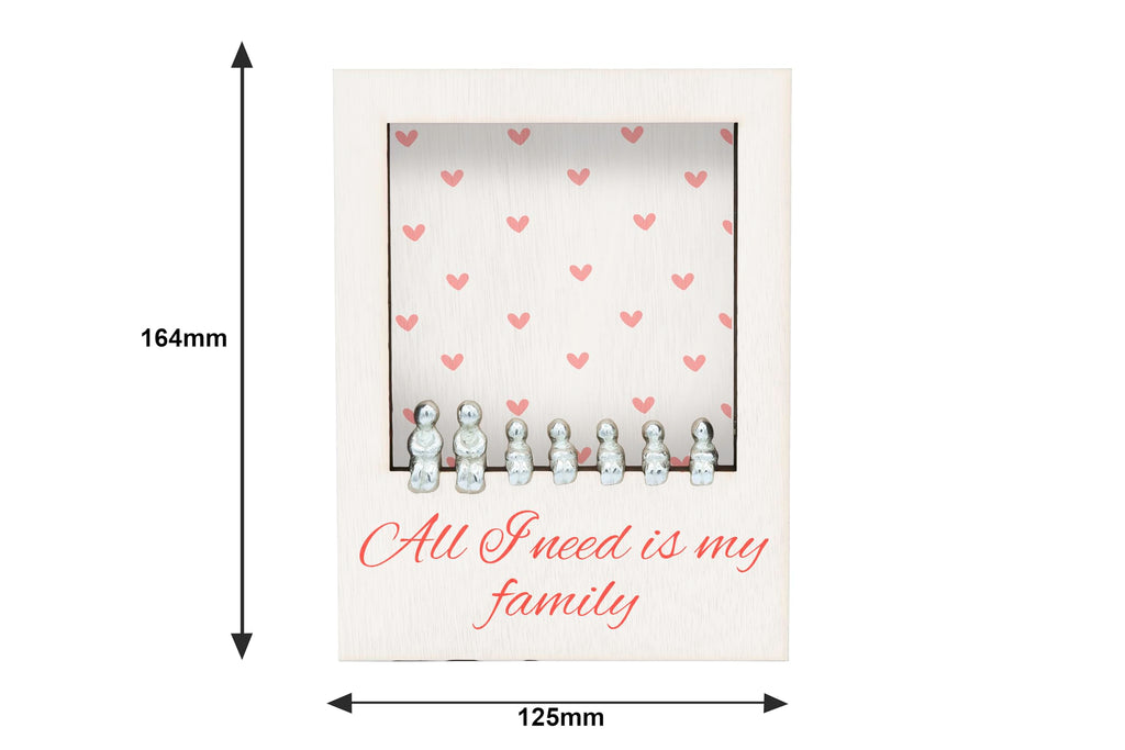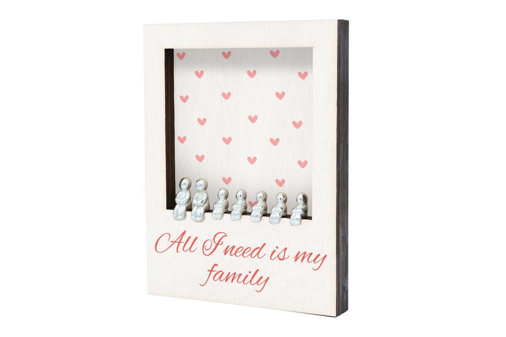 Add a touch of warmth and love to your home with our handcrafted Family Love Wooden Frame with Tin Figurines. This unique piece of tabletop decor is the perfect blend of novelty, ornamentation, and sentimentality. The heart pattern on the wooden frame and the sculpted tin figurines exude a family-themed charm that will tug at your heartstrings. The minimalist style and elegant design add a touch of sophistication to any room. This keepsake is a true work of artistic craftsmanship, with a rustic charm that is sure to impress. The handcrafted laser-cut plywood photo frame features a UV-printed design that reads 'all I need is my family'. The full-colour printed frame showcases a simple family-themed design, perfect for displaying your favourite memory.