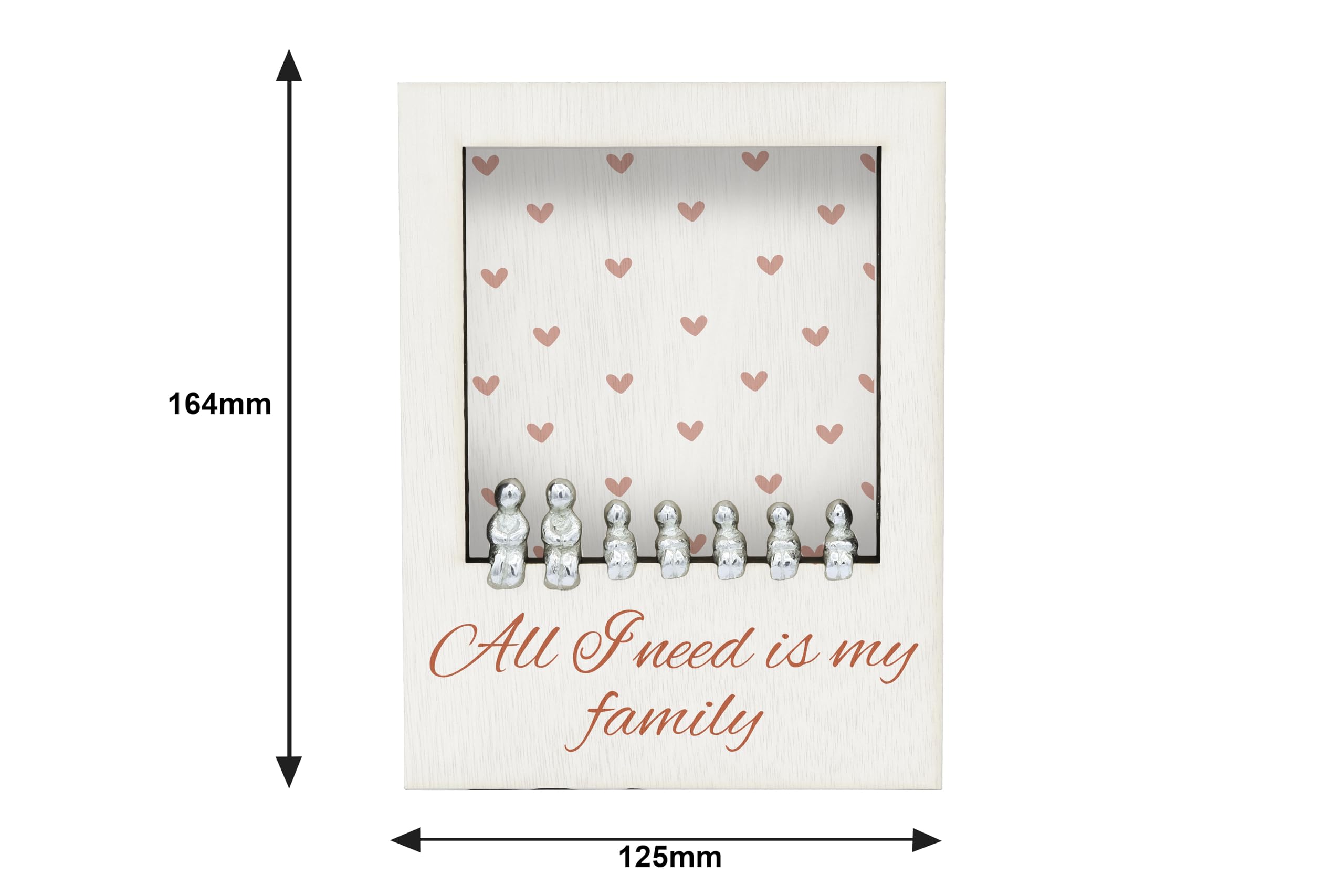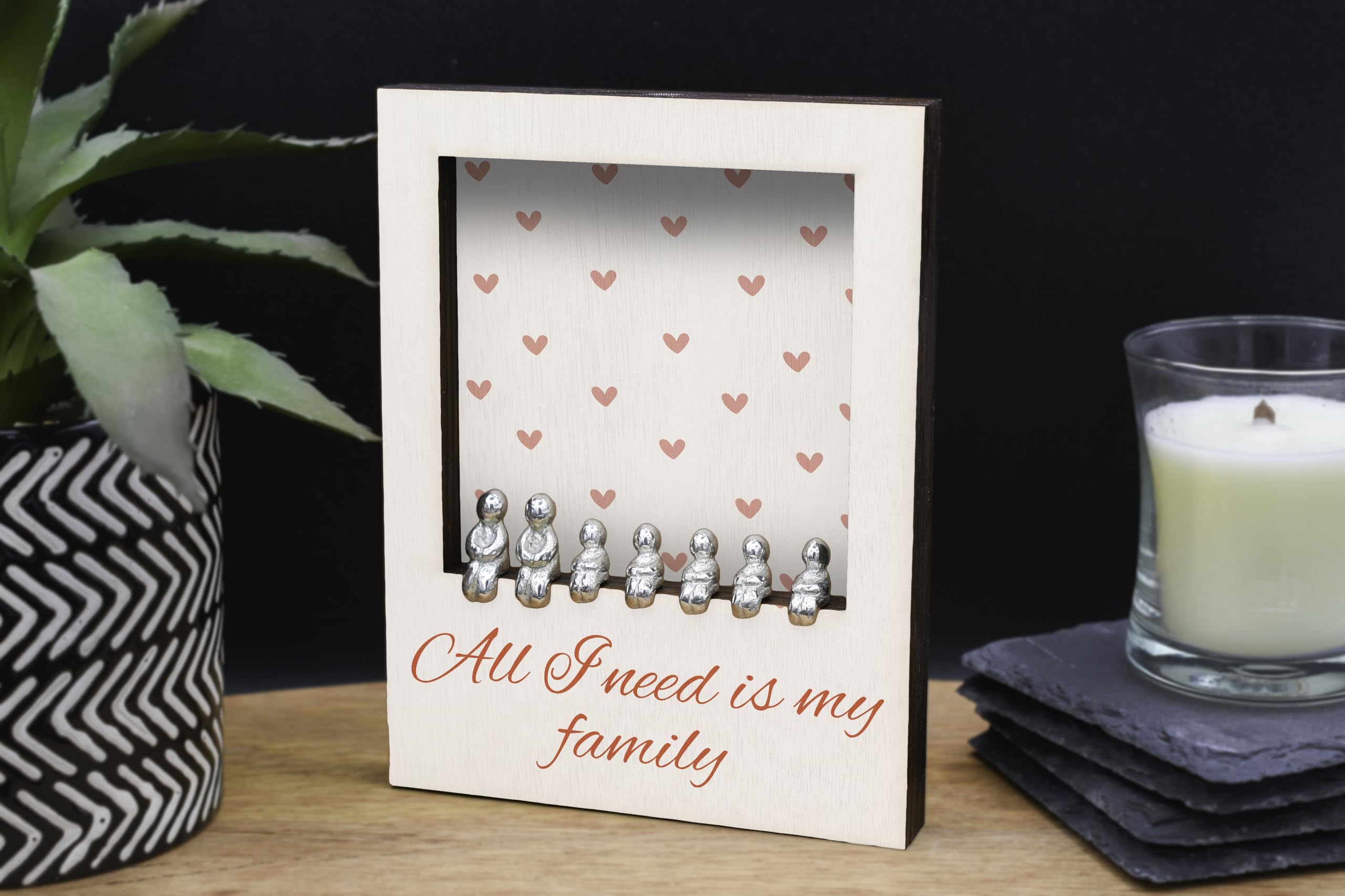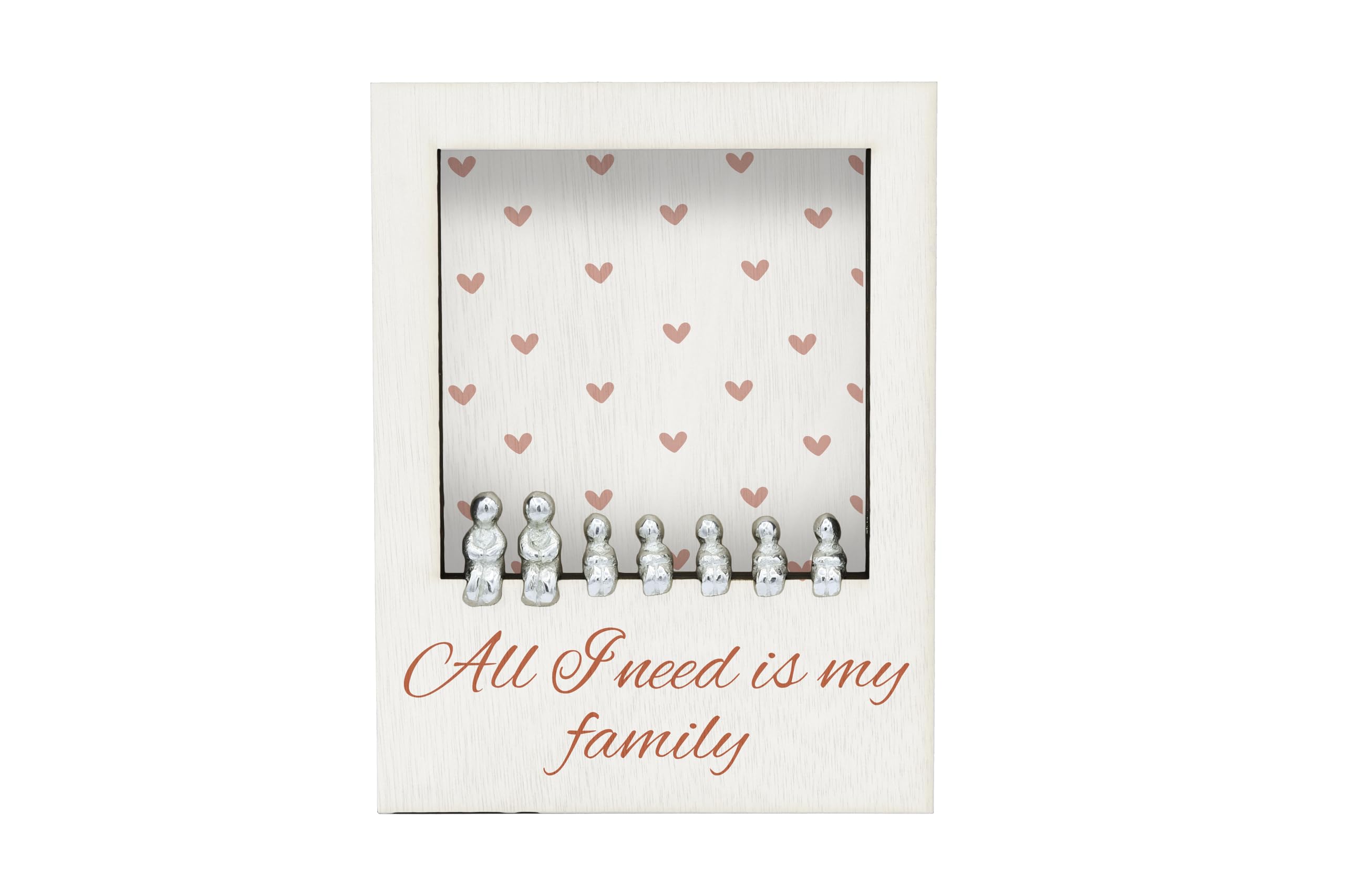 Add a touch of warmth and love to your home with our handcrafted Family Love Wooden Frame with Tin Figurines. This unique piece of tabletop decor is the perfect blend of novelty, ornamentation, and sentimentality. The heart pattern on the wooden frame and the sculpted tin figurines exude a family-themed charm that will tug at your heartstrings. The minimalist style and elegant design add a touch of sophistication to any room. This keepsake is a true work of artistic craftsmanship, with a rustic charm that is sure to impress. The handcrafted laser-cut plywood photo frame features a UV-printed design that reads 'all I need is my family'. The full-colour printed frame showcases a simple family-themed design, perfect for displaying your favourite memory.