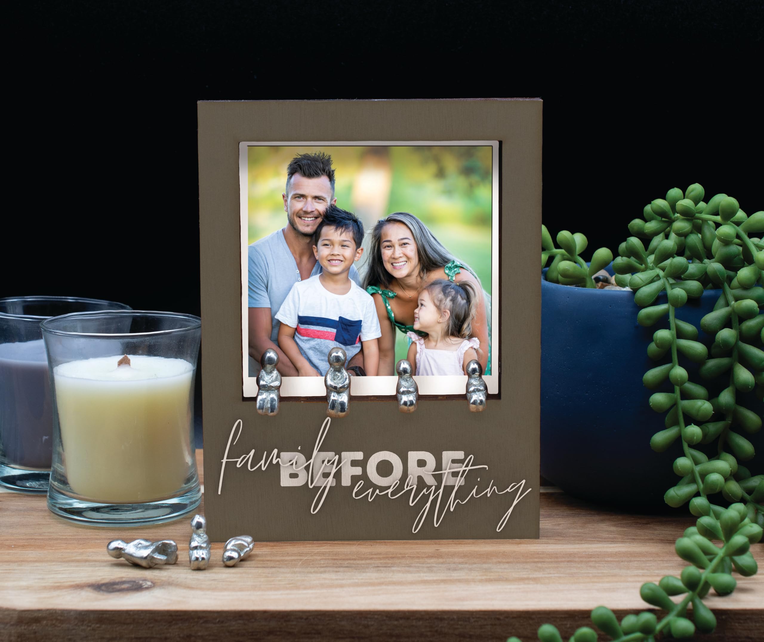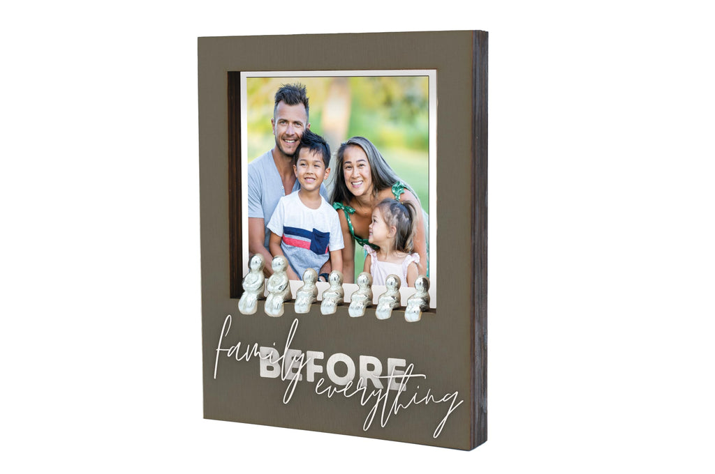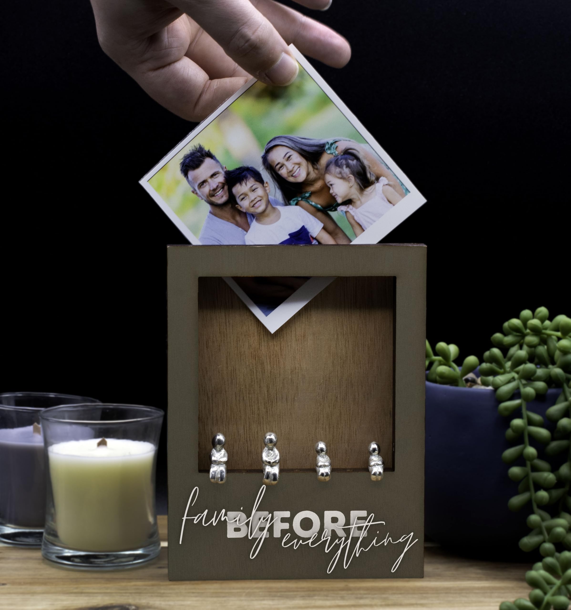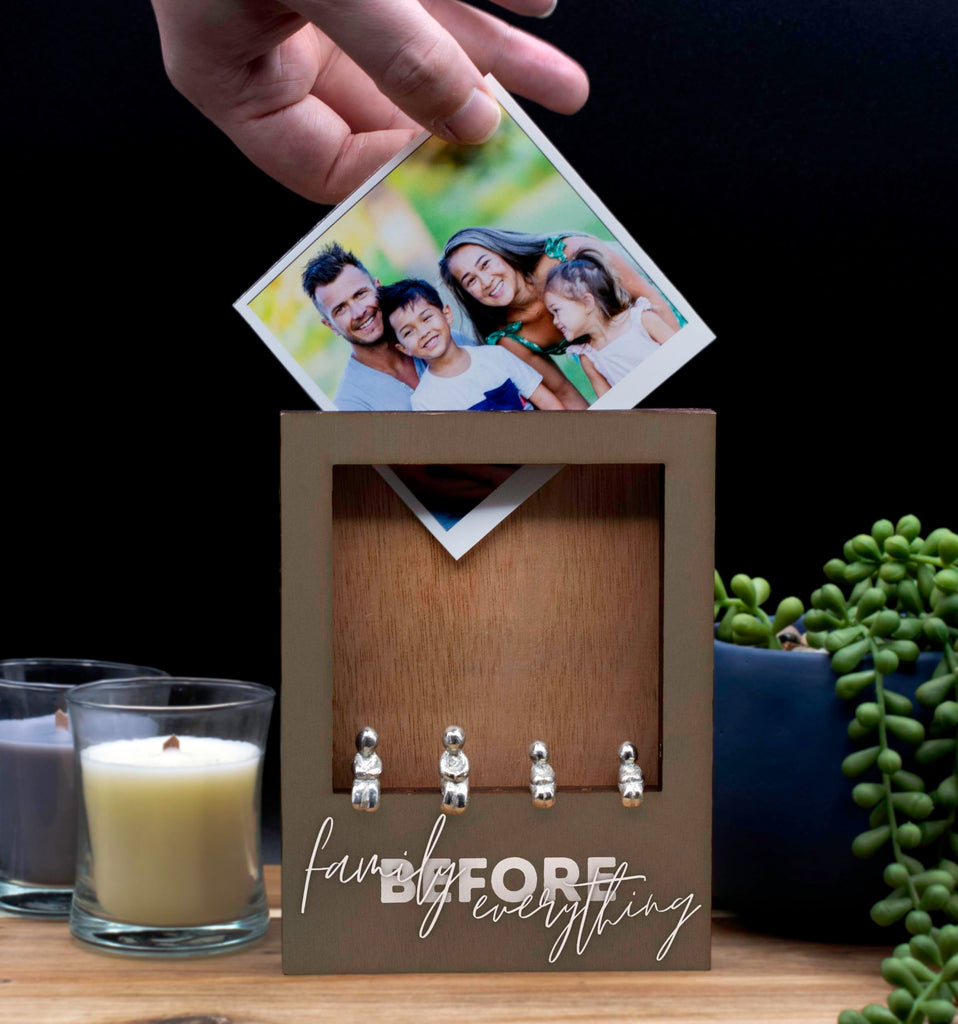 Add a touch of warmth and love to your home with our Family Love Wooden Photo Holder with Tin Figure Accents. This sentimental home decor piece is perfect for showcasing your favourite family moments in a rustic and charming way. The handcrafted laser cut plywood photo frame features tin figurines that add a unique touch to the design. The frame is UV printed with a heartfelt message that reads 'family before everything', making it the ideal decorative piece for any room in your home. Whether you choose to hang it on the wall or display it on a tabletop, this family-themed frame is sure to be a cherished addition to your decor. Give it as a thoughtful keepsake or heartfelt gift to a loved one to remind them of the importance of family love. Our Family Love Wooden Photo Holder with Tin Figure Accents is a beautiful and inspirational way to prioritise family in your home decor.