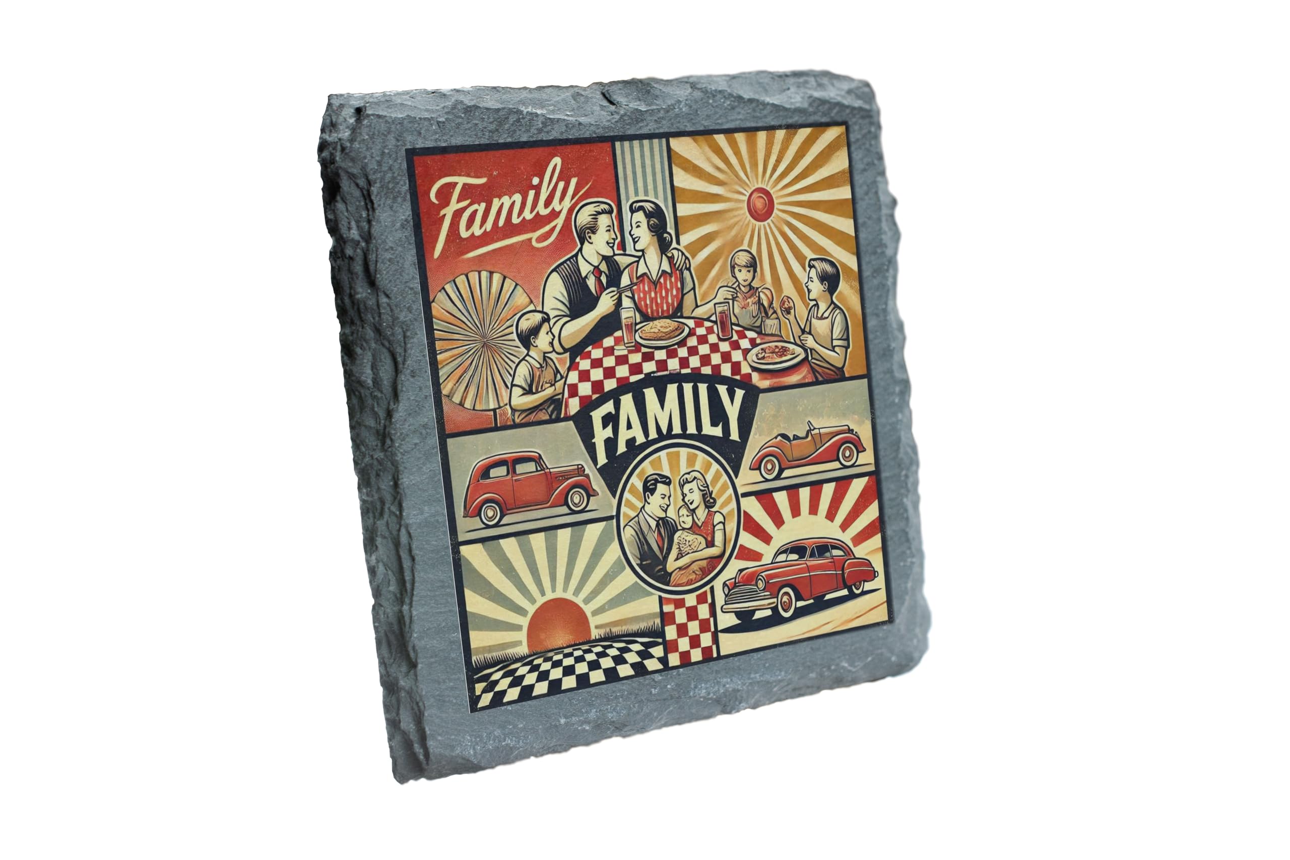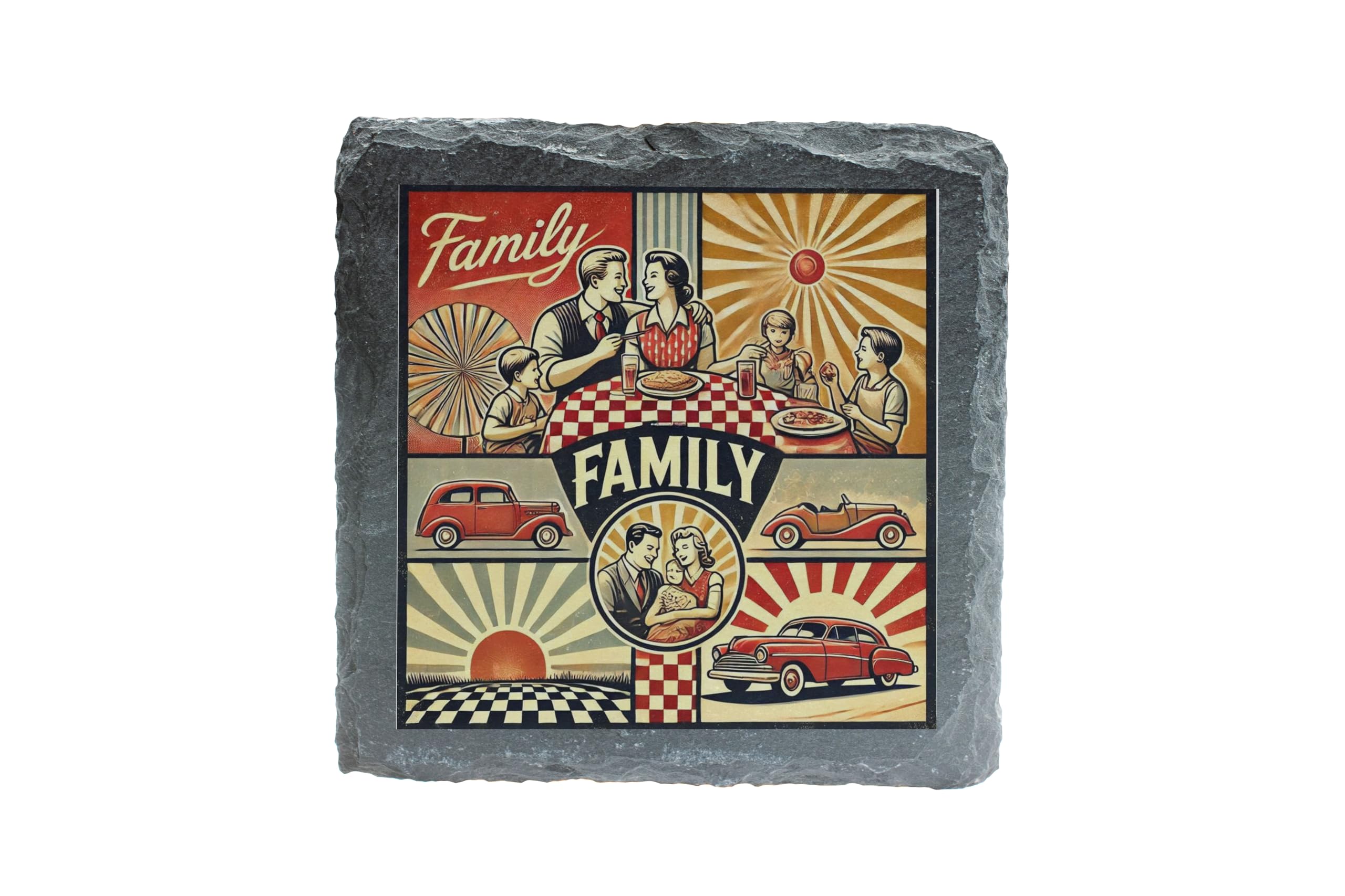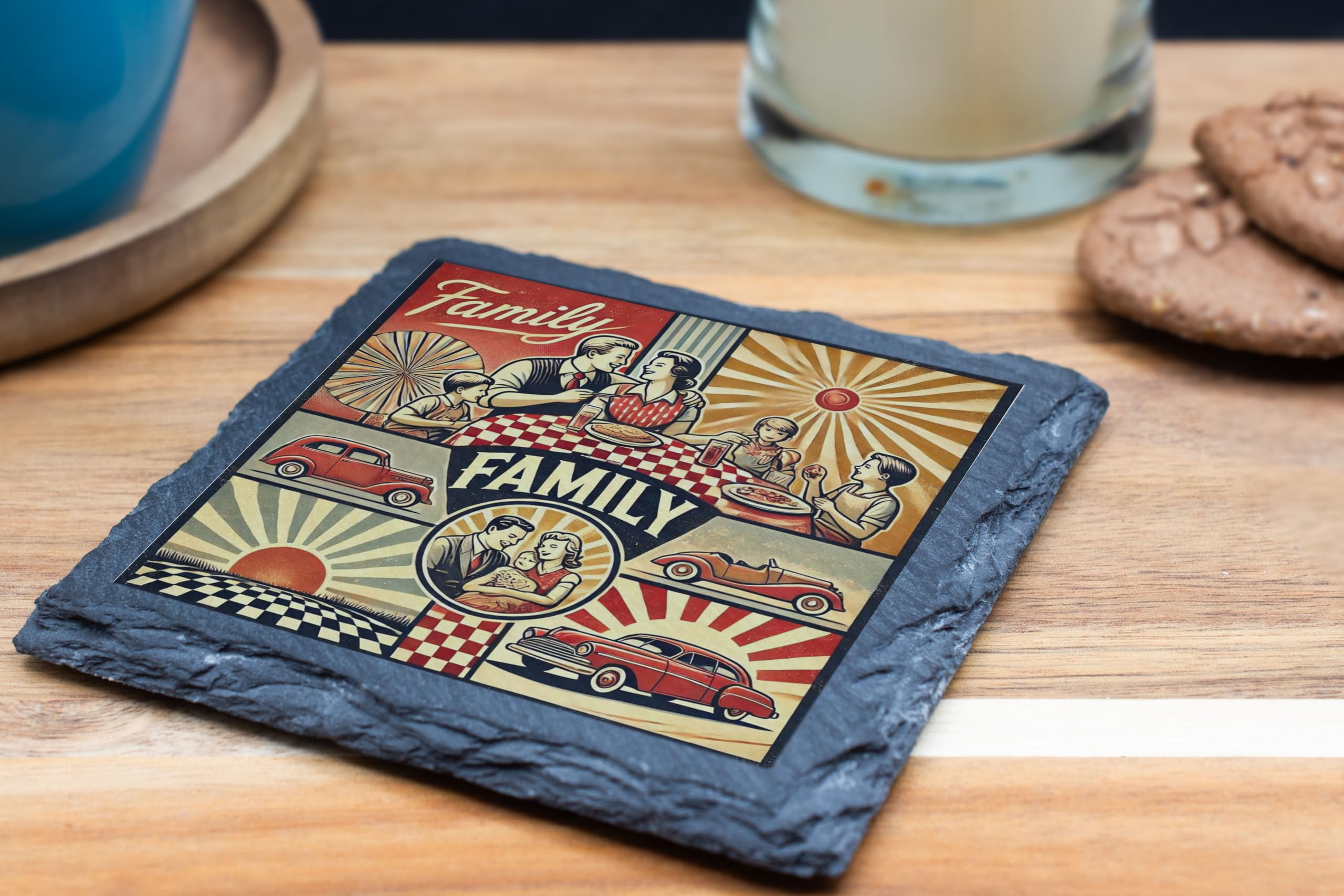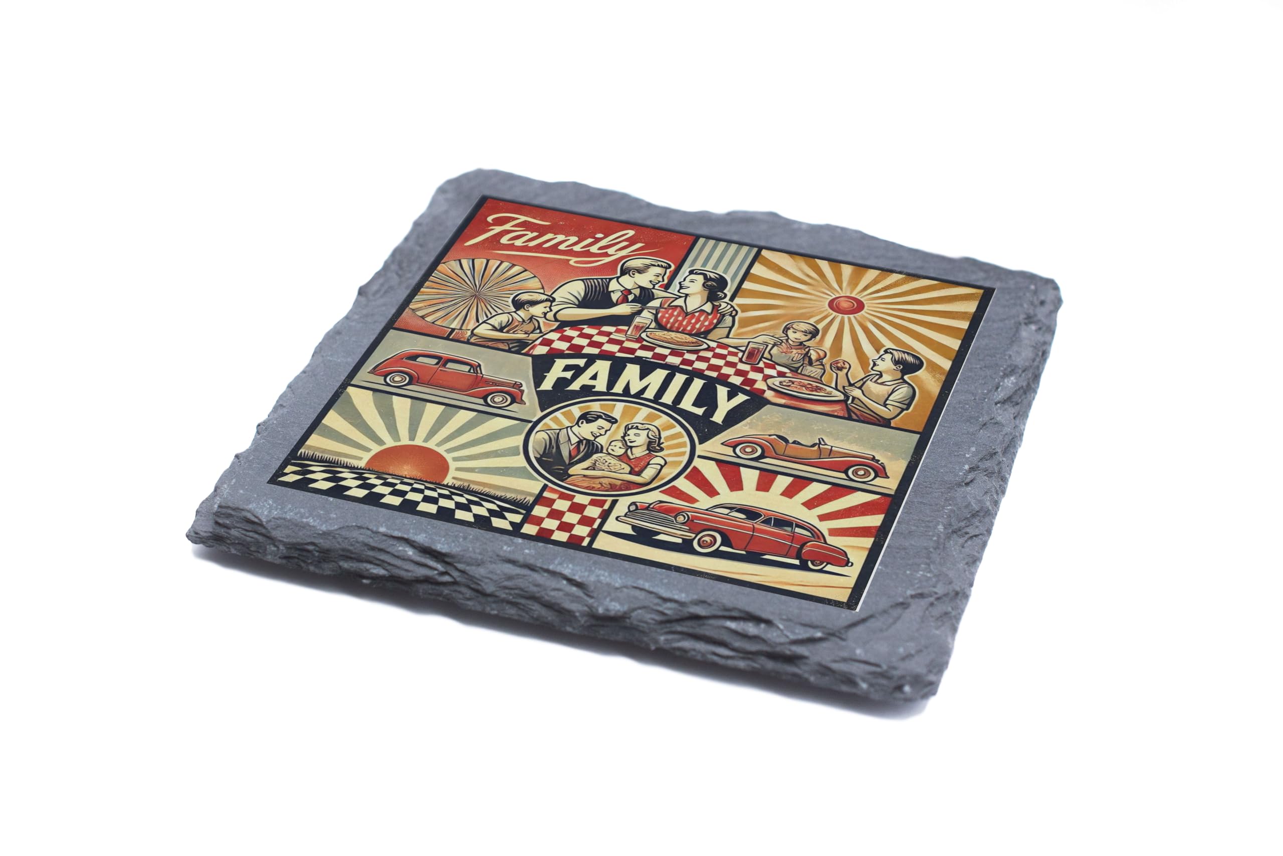 Relive the golden age of family dinners and Sunday drives with the "Family Moments" Retro-Style Slate Coaster. This charming piece showcases a delightful 1950s-inspired design that highlights the timeless value of family. Its bold vintage colors and artistic flair make it more than just a coaster ? it?s a piece of nostalgia for your home. Crafted from high-quality natural slate, this coaster not only enhances your table's aesthetics but also provides superior protection against heat and moisture. Its non-slip backing ensures it remains in place, making it a practical and stylish addition to any room. This unique coaster is a wonderful gift for vintage decor enthusiasts, family members, or anyone looking to add a touch of retro warmth to their home. Celebrate the beauty of family with this timeless design!