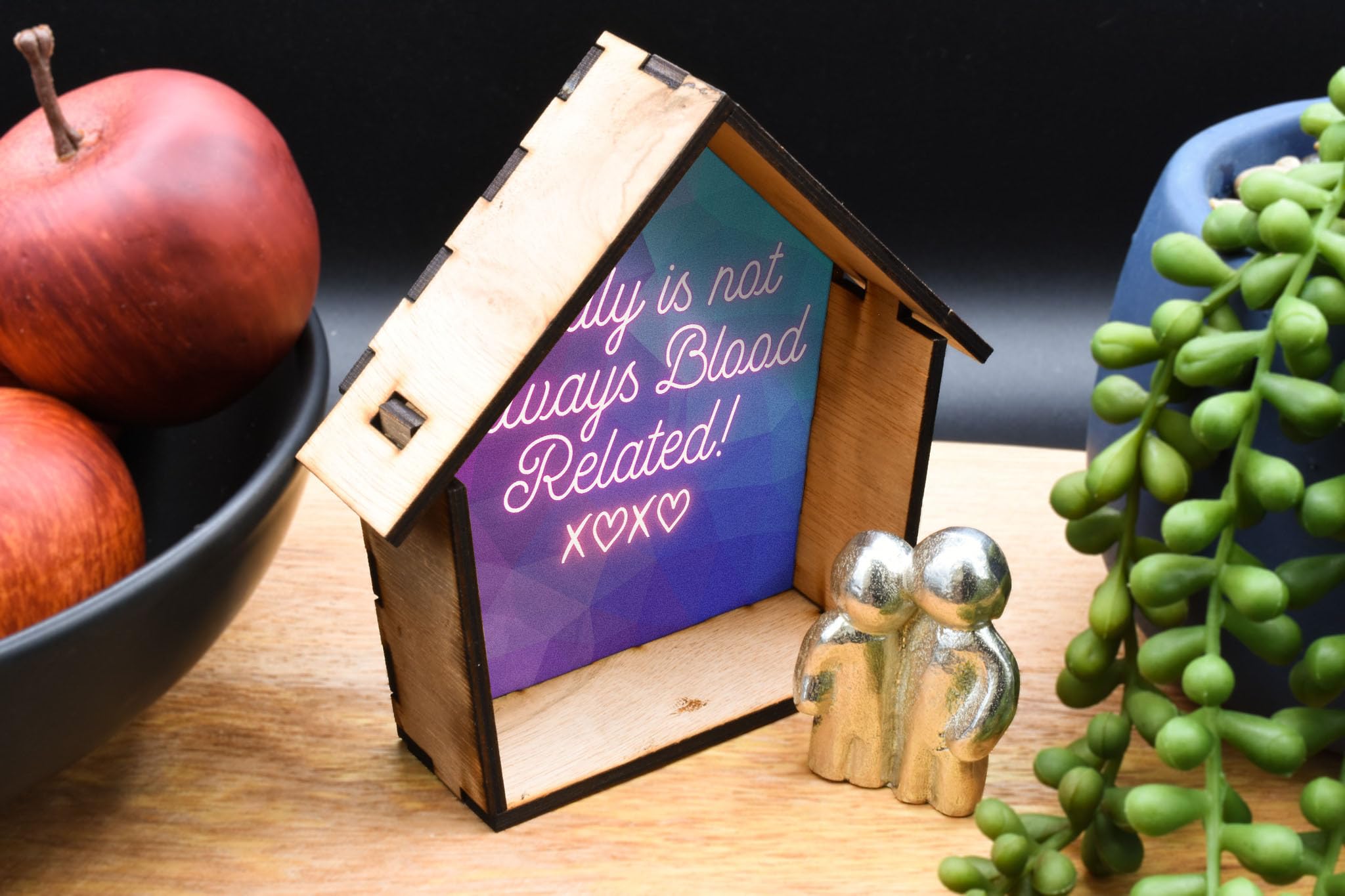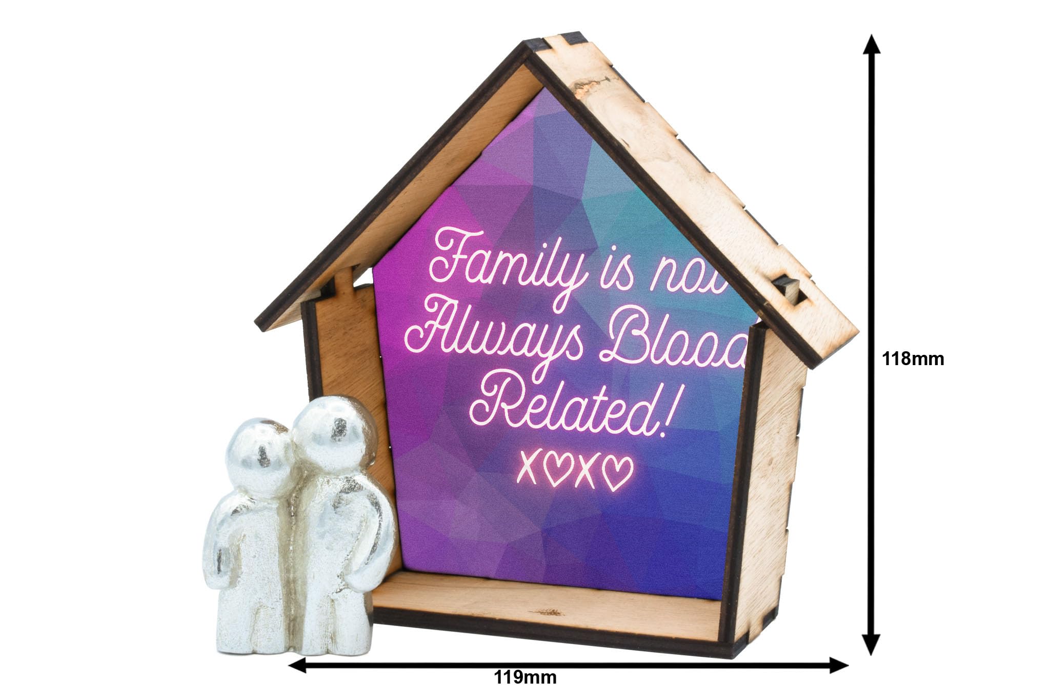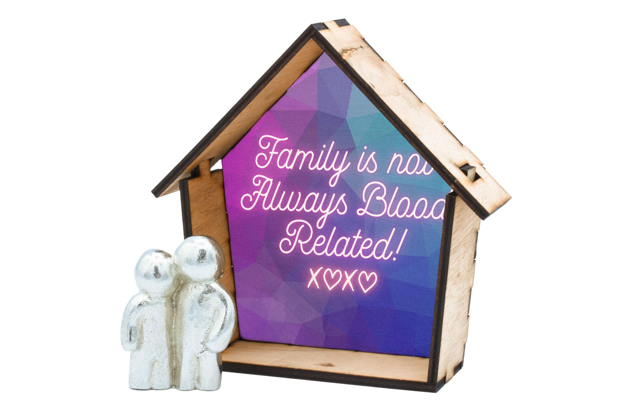 Family Quote Ornament - Handcrafted Wooden House Decor with Tin Figurine and Colourful UV Printed Design (house-ds23-xoxorg)