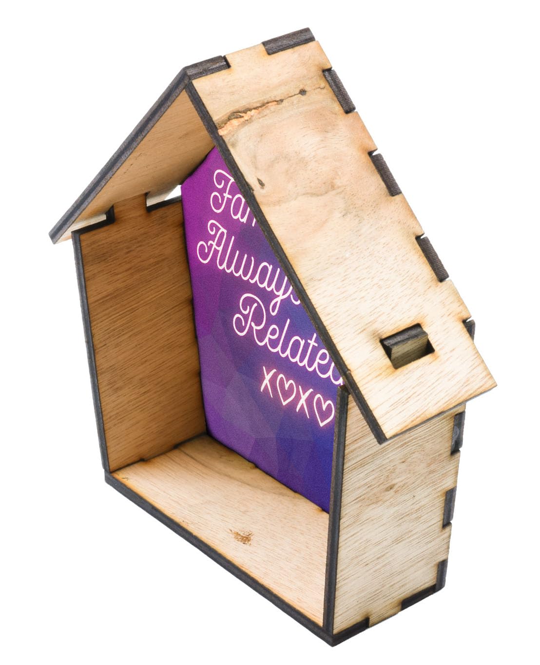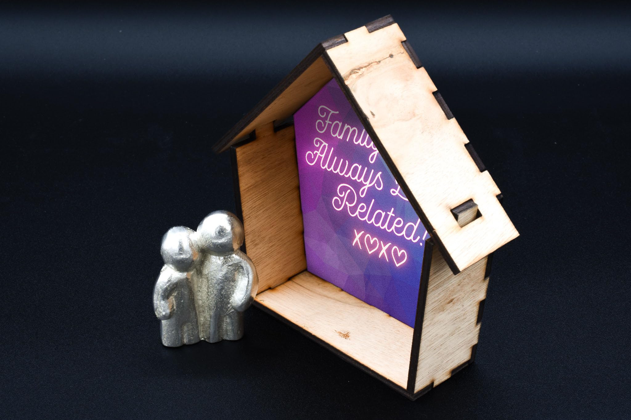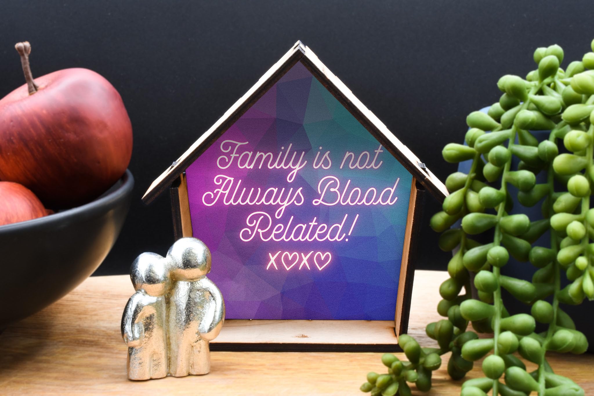Family Quote Ornament - Handcrafted Wooden House Decor with Tin Figurine and Colourful UV Printed Design (house-ds23-xoxorg)