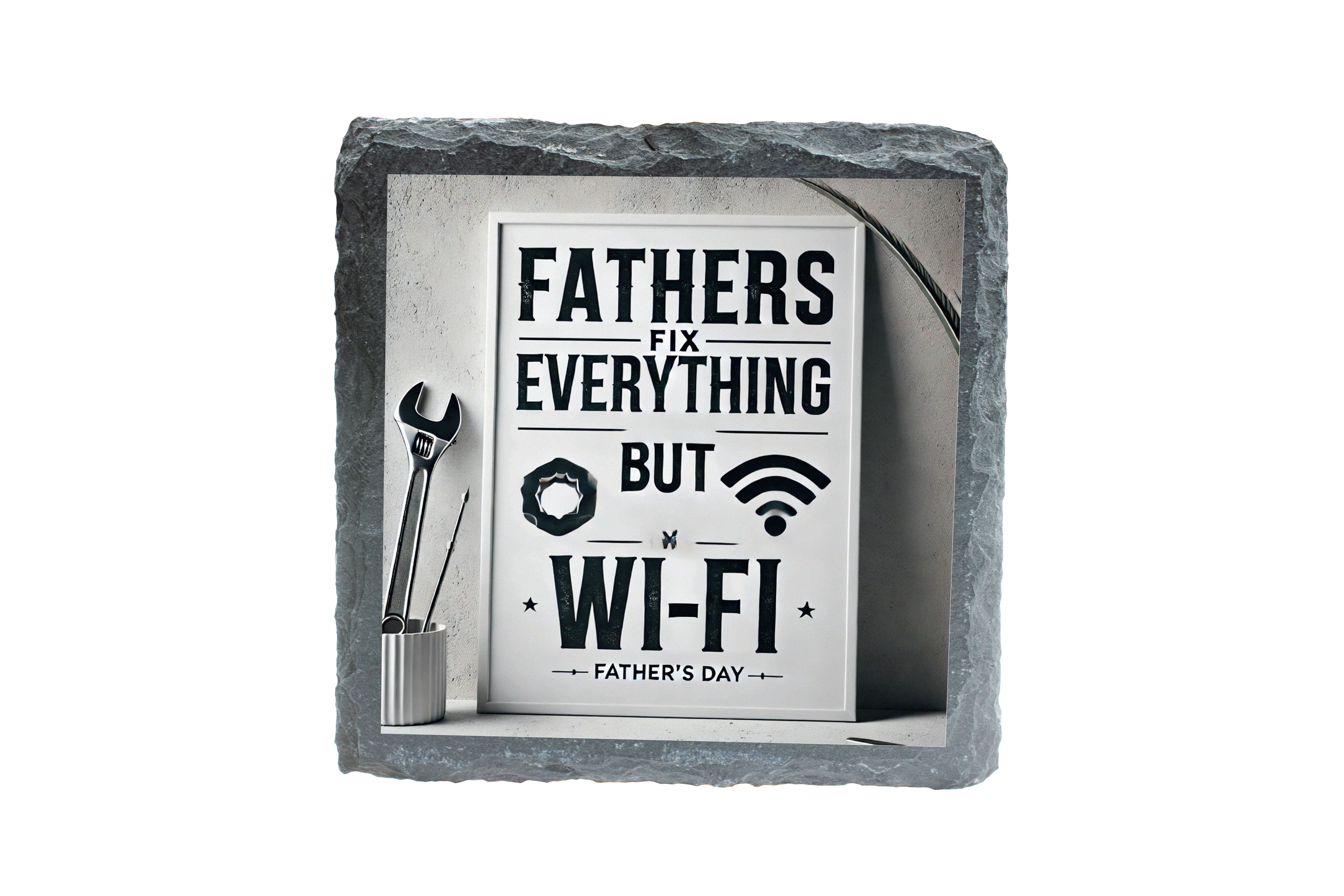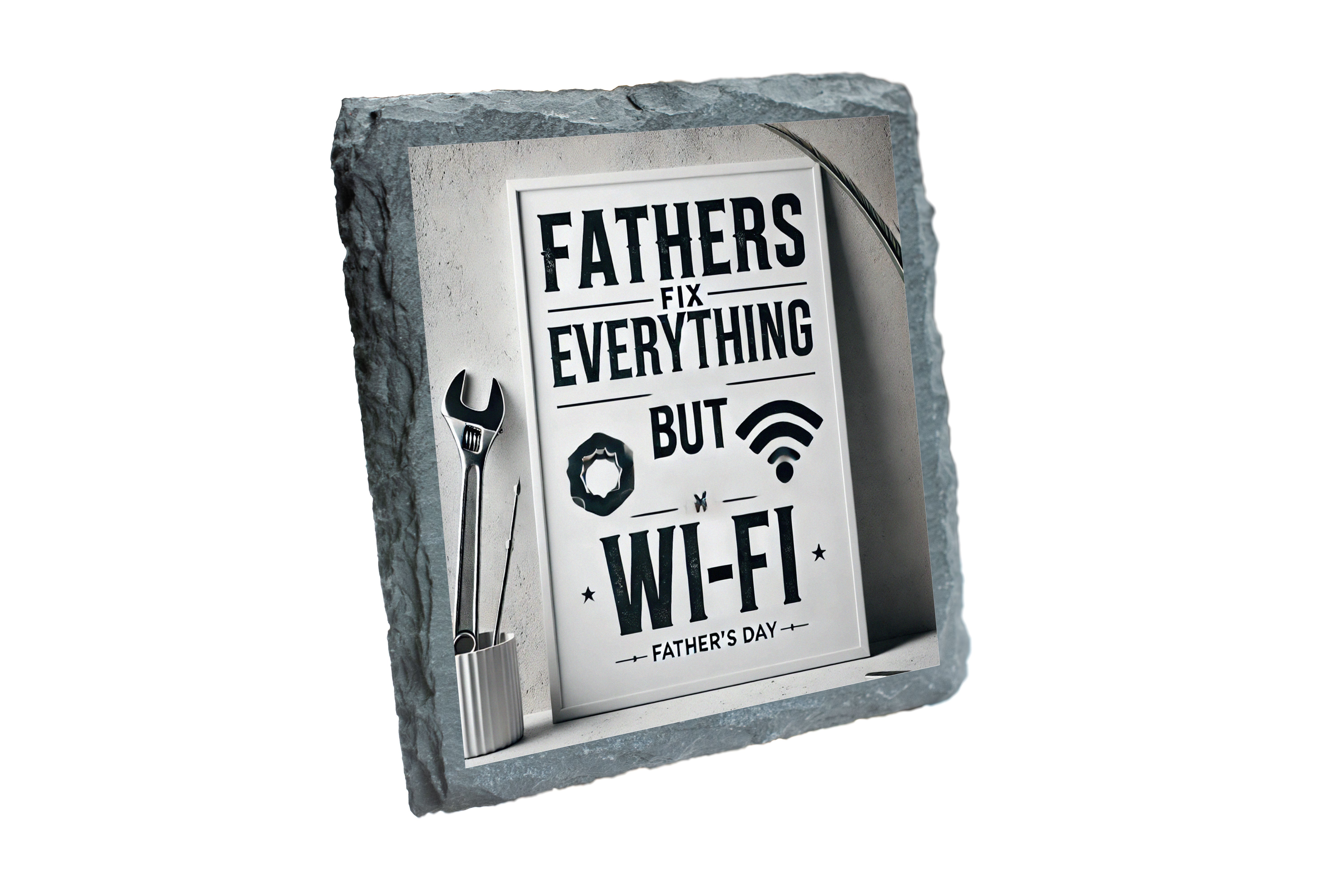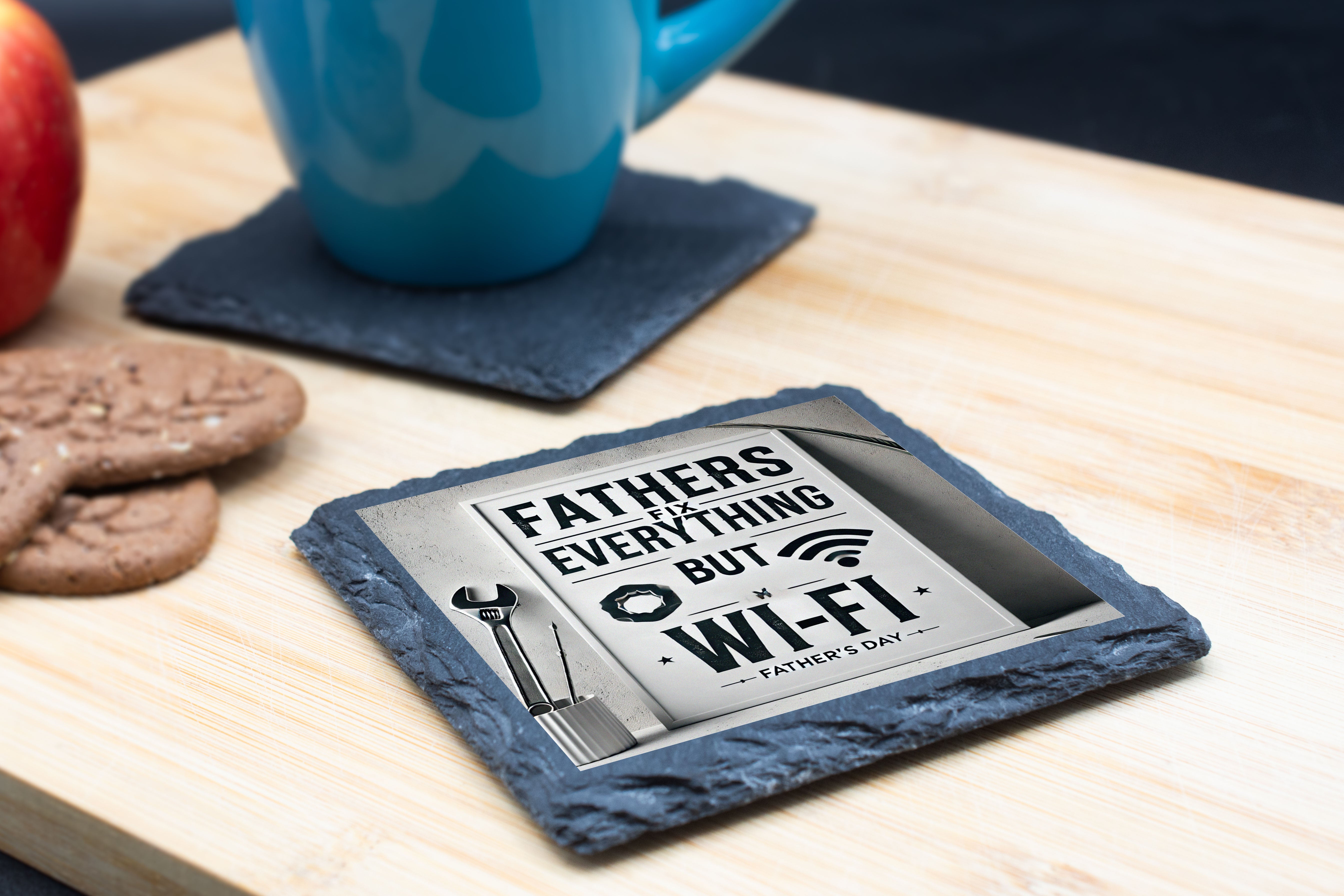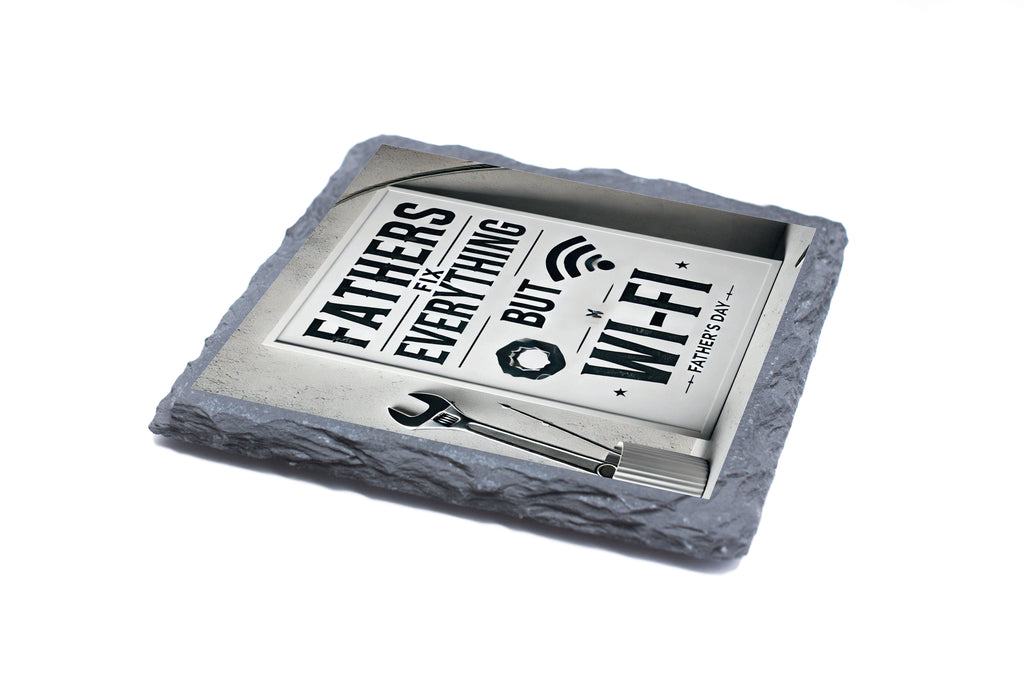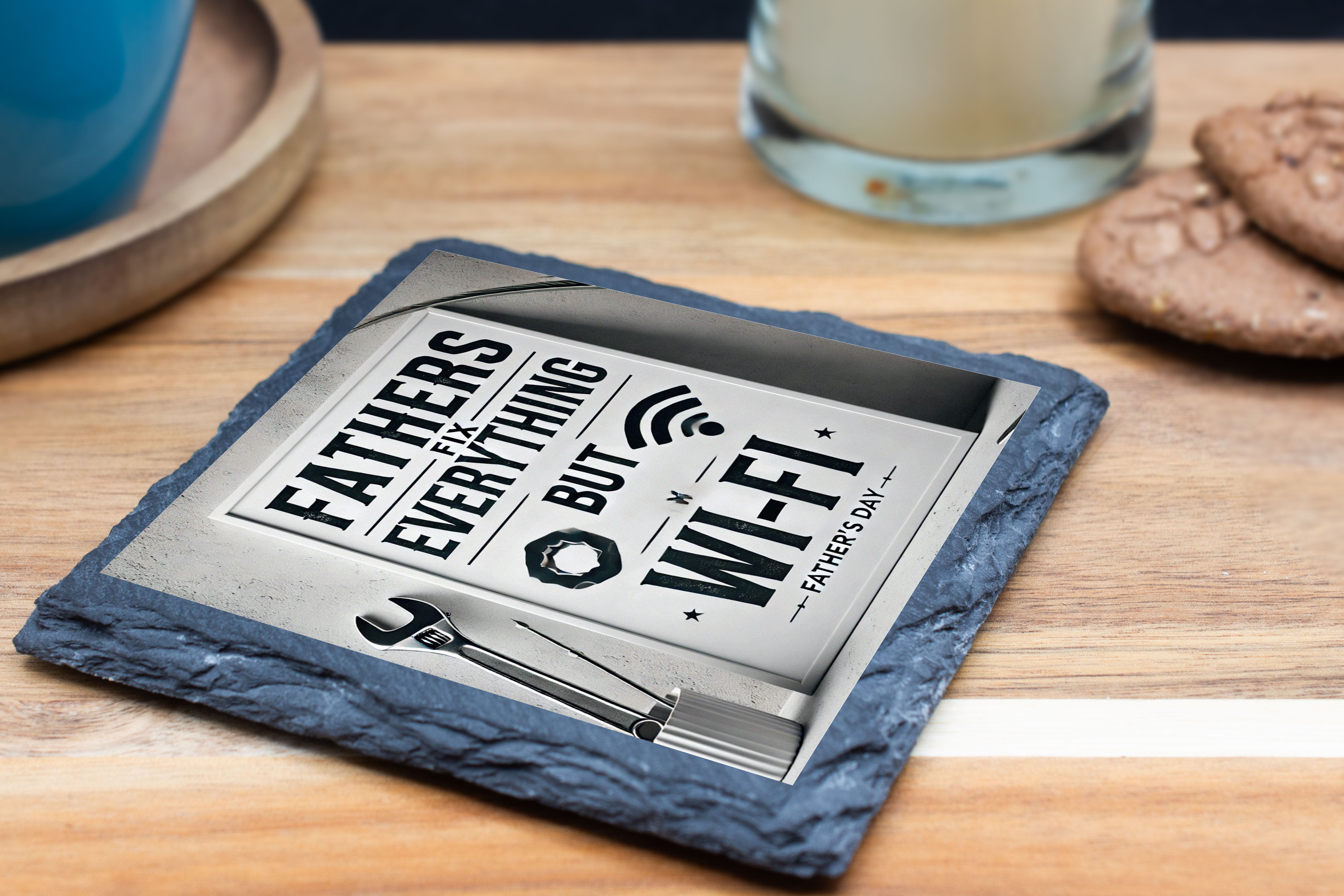This slate coaster makes a perfect Father's Day gift with its humorous design that reads "Fathers Fix Everything But Wi-Fi." Featuring a sturdy, natural slate material, it adds a touch of personality and fun to any desk or living space. Whether placed in the office or at home, this coaster will keep surfaces safe while providing a lighthearted conversation starter. Ideal for dads who appreciate a good laugh, it’s a great way to show appreciation with a practical yet amusing gift.