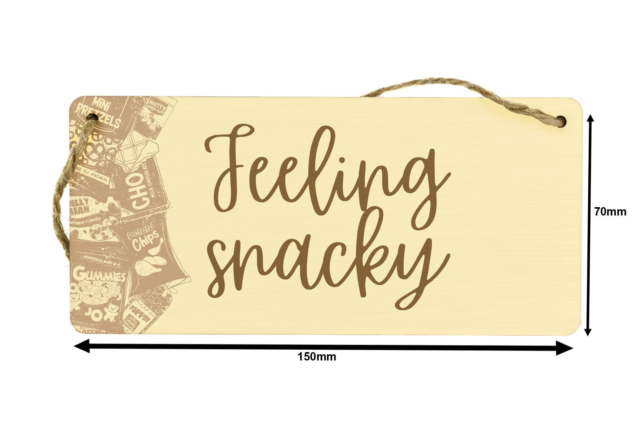 Add a touch of fun to your kitchen with the Feeling Snacky Hanging Snack Sign! Made from quality plywood, this colourful sign is perfect for adorning your snack cupboard. With its charming design and playful message that reads 'feeling snacky', it's sure to make your kitchen a cheerful and inviting space. Hang it on your kitchen wall or cupboard door to create a focal point that will delight both guests and family members alike. This unique sign also makes a great kitchen gift for snack lovers and food enthusiasts. Bring some humour and style into your kitchen with this fun and eye-catching snack sign.
