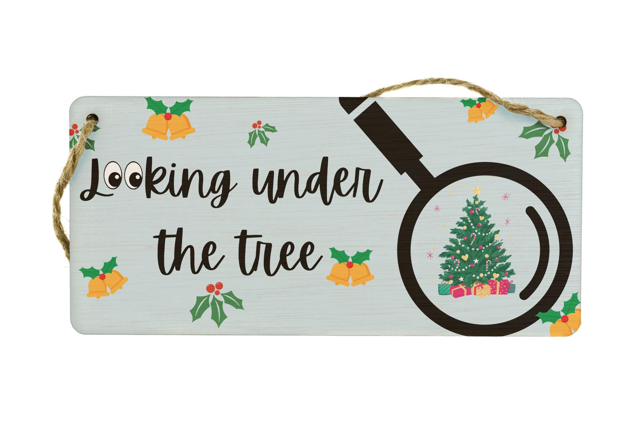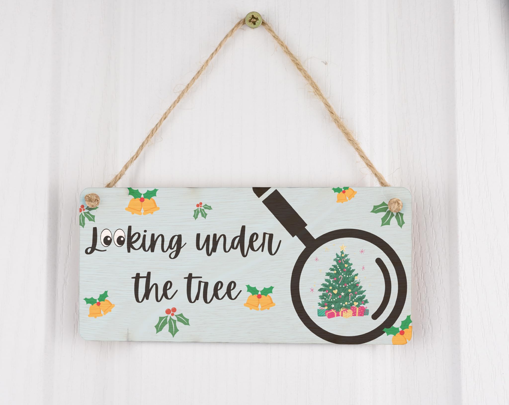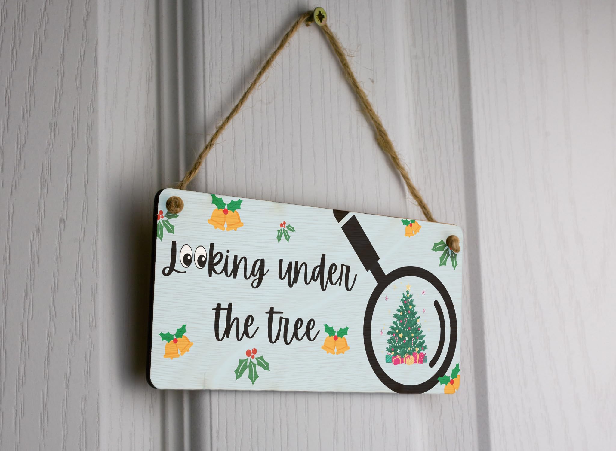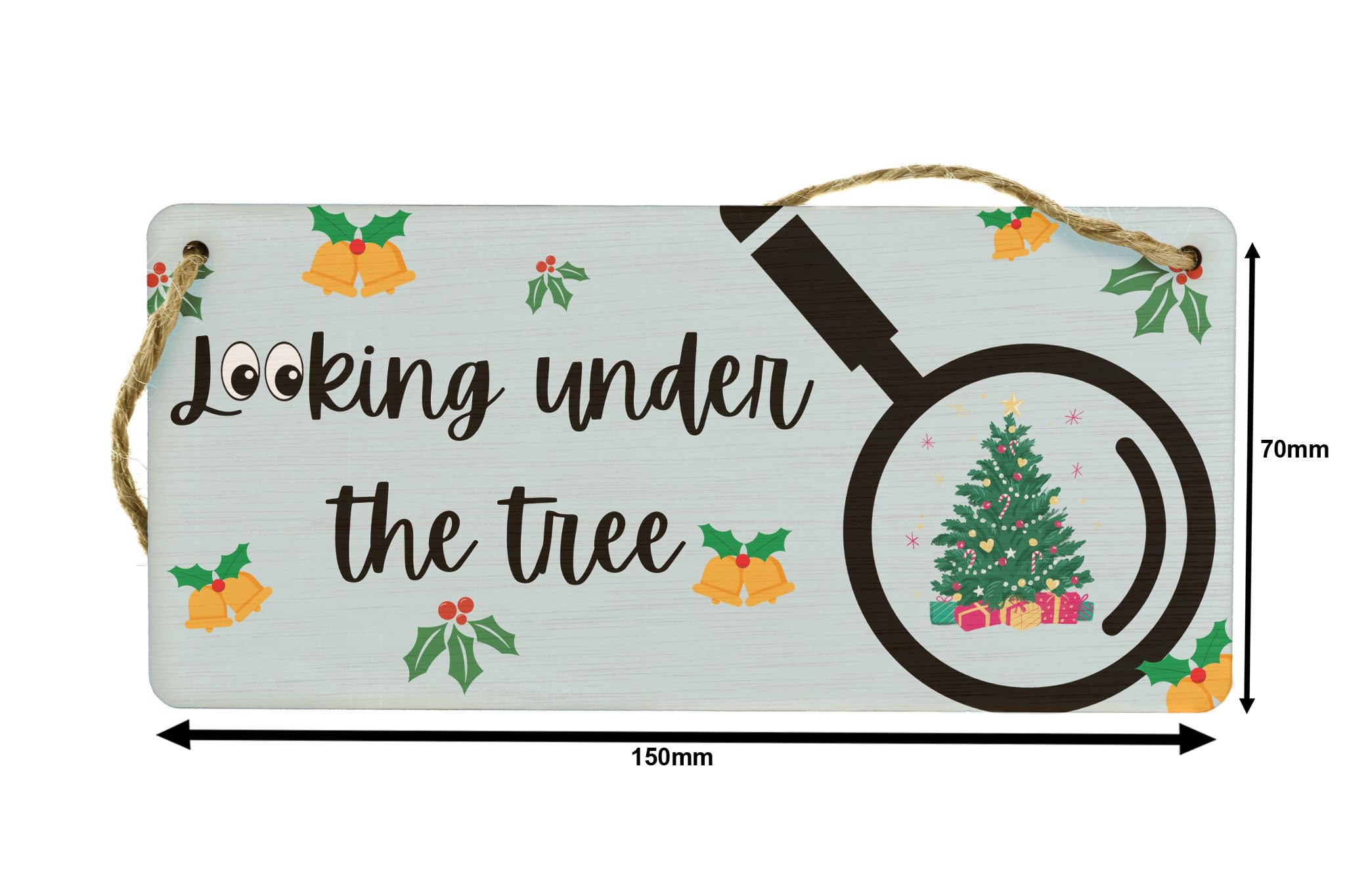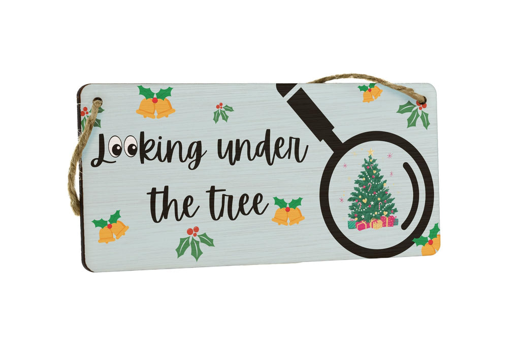 Bring the festive spirit to your home with this unique Festive Plywood Hanging Sign. Made from quality plywood, this sign is a perfect addition to your Christmas decor. Hang it up in your living room or any other room to add a touch of holiday cheer. The sign features a full-colour design with the text 'Looking Under the Tree', accompanied by a detailed image of a Christmas tree and a magnifying glass. It makes for a great novelty gift for Mum, Dad, Grandparents, and Kids, and will bring joy to everyone in the family. Get ready to create lasting memories this Christmas with this beautiful hanging sign.