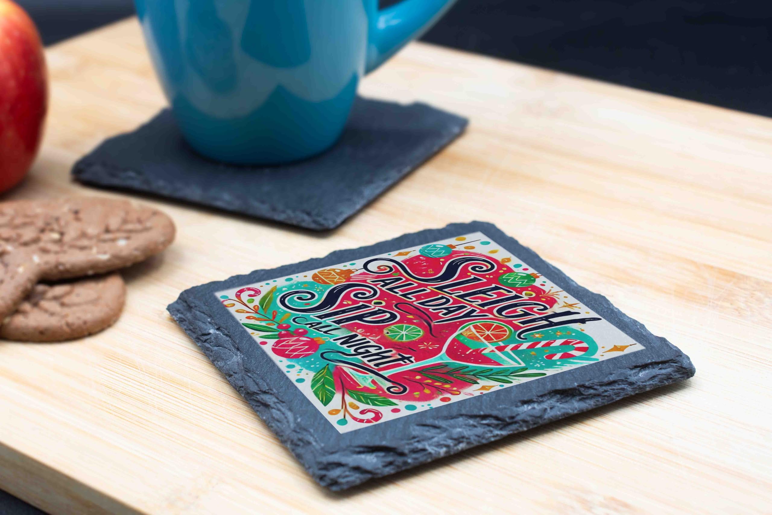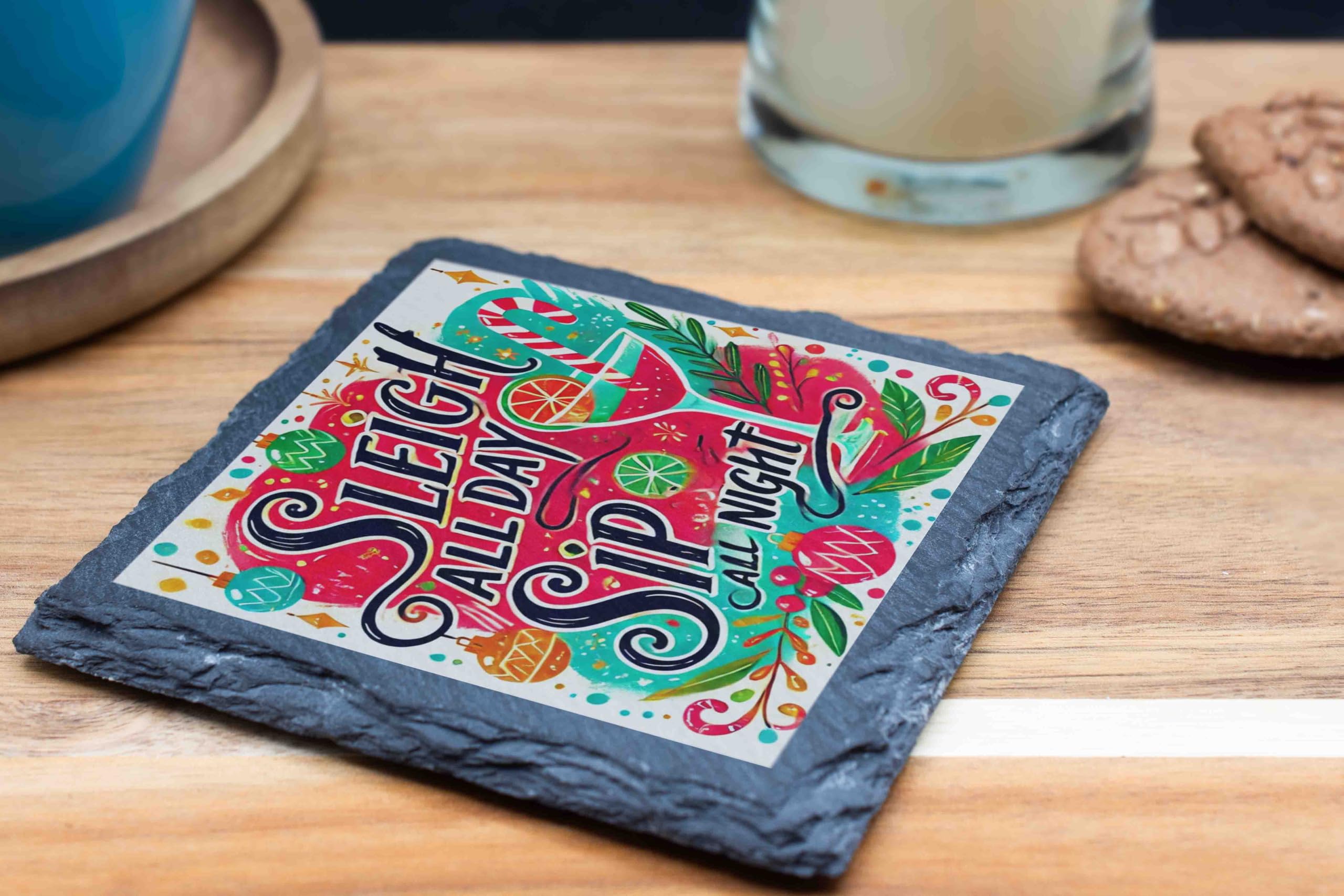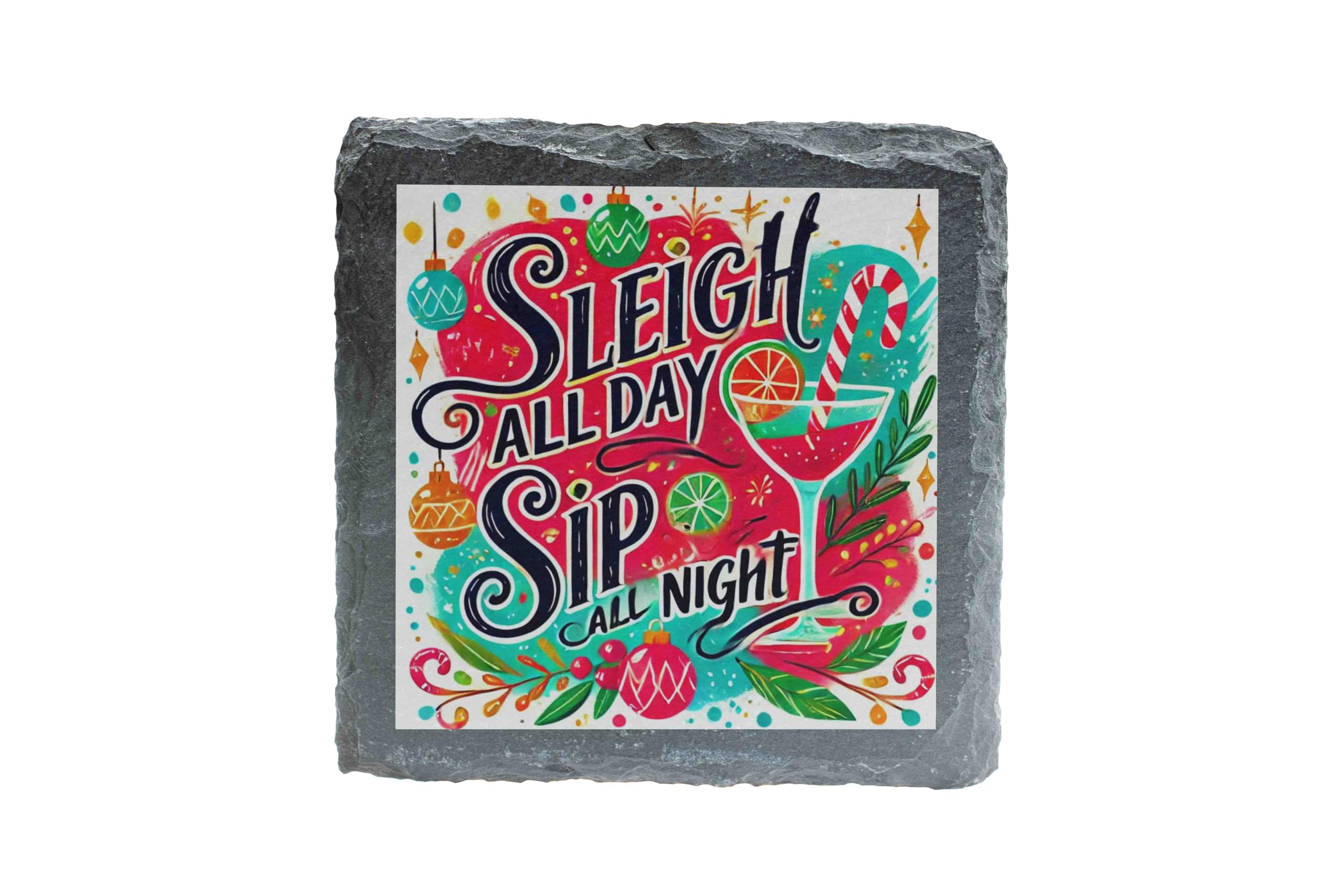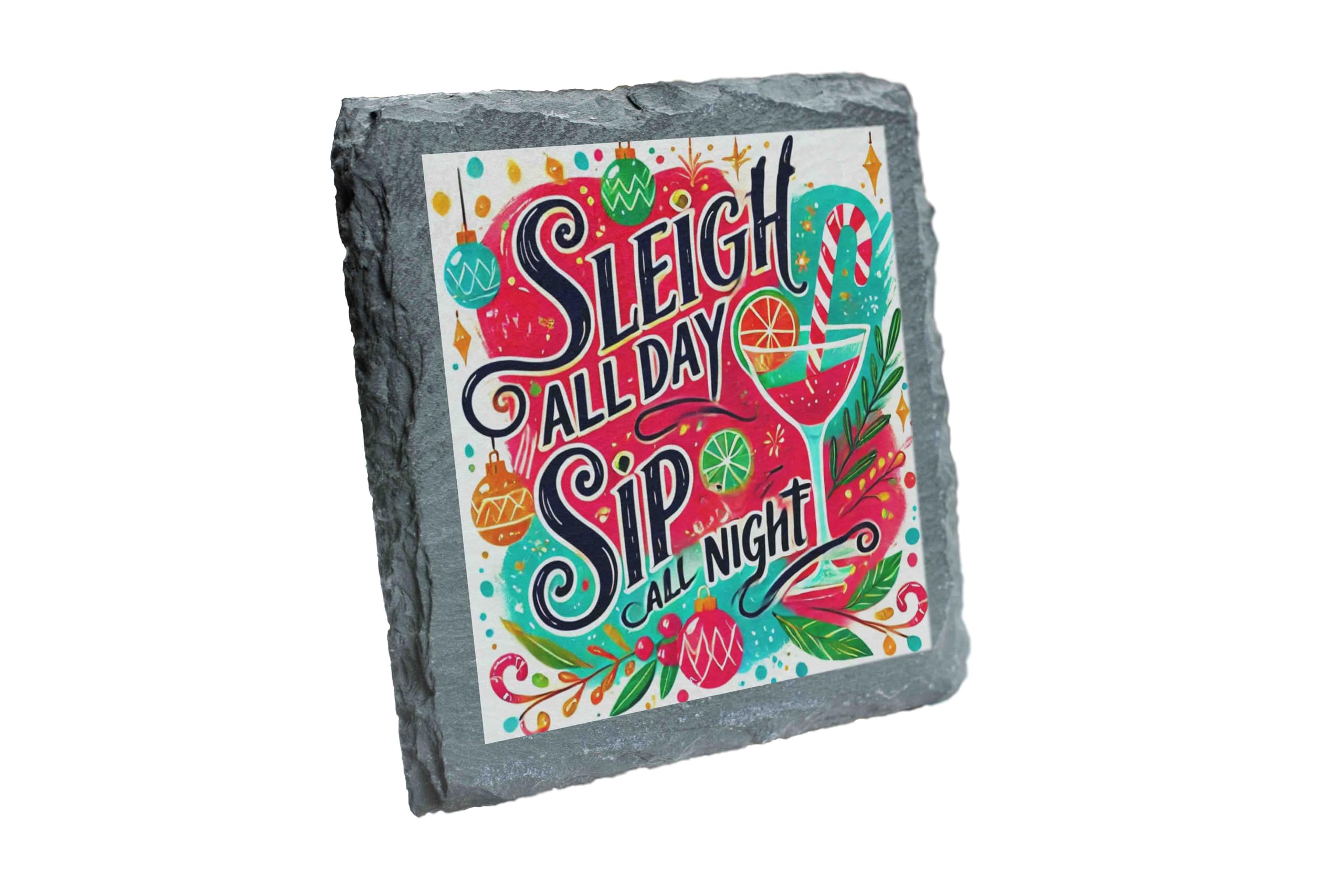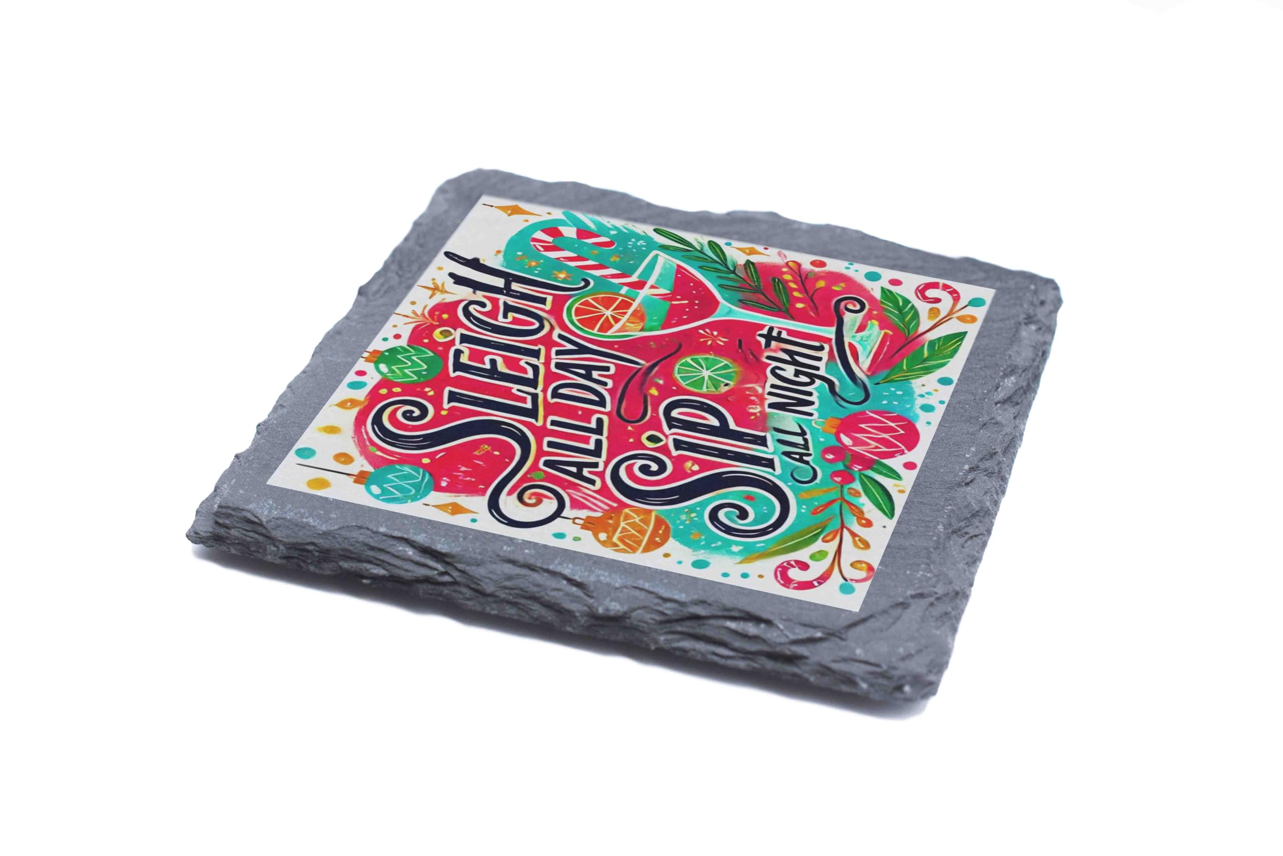 Celebrate the holiday season in style with this festive slate coaster featuring the playful phrase "Sleigh All Day, Sip All Night." Crafted from high-quality natural slate, this coaster is perfect for adding a touch of holiday cheer to your home or party decor. The vibrant design is adorned with colorful ornaments, candy canes, and cocktail motifs, making it an eye-catching addition to your coffee table or bar. With protective felt pads on the bottom, it ensures your surfaces stay scratch-free while you sip and celebrate. A perfect gift for holiday enthusiasts, this coaster combines functionality with festive fun, making it a must-have for the season.