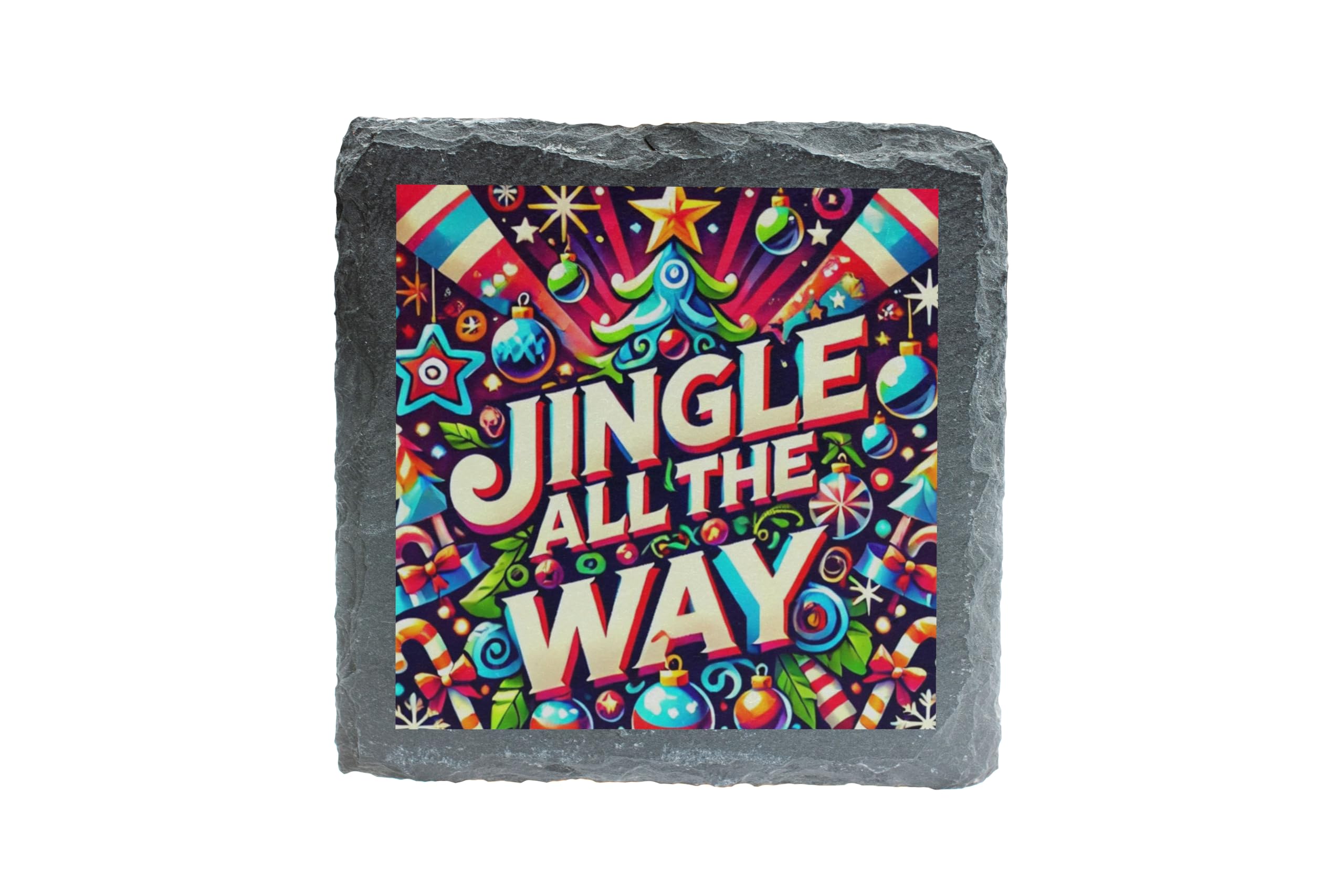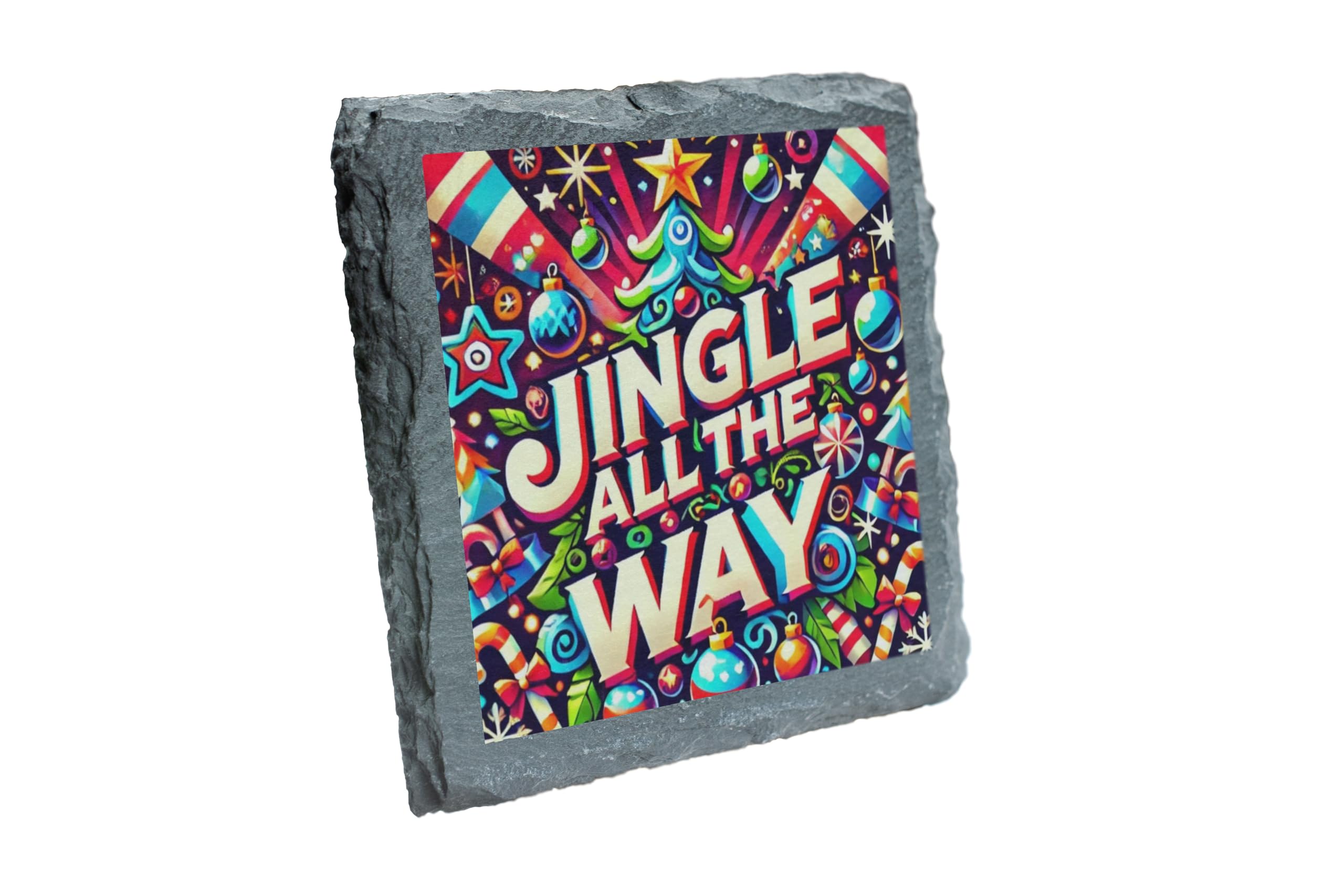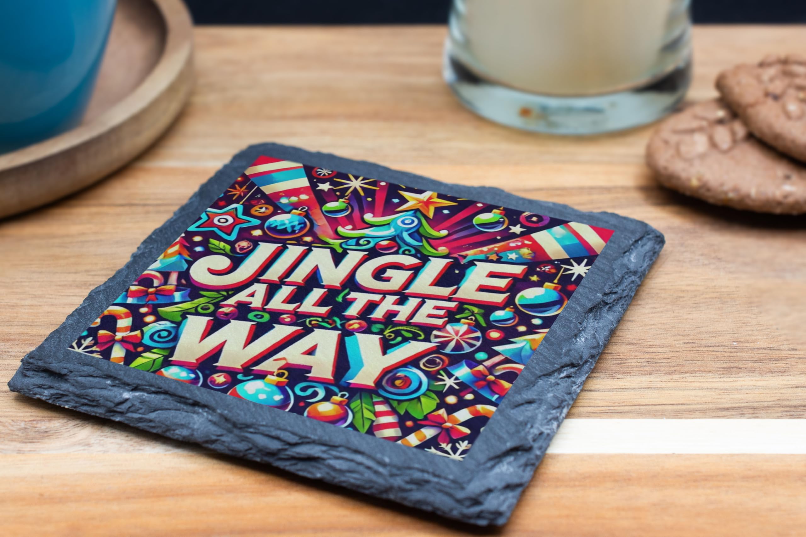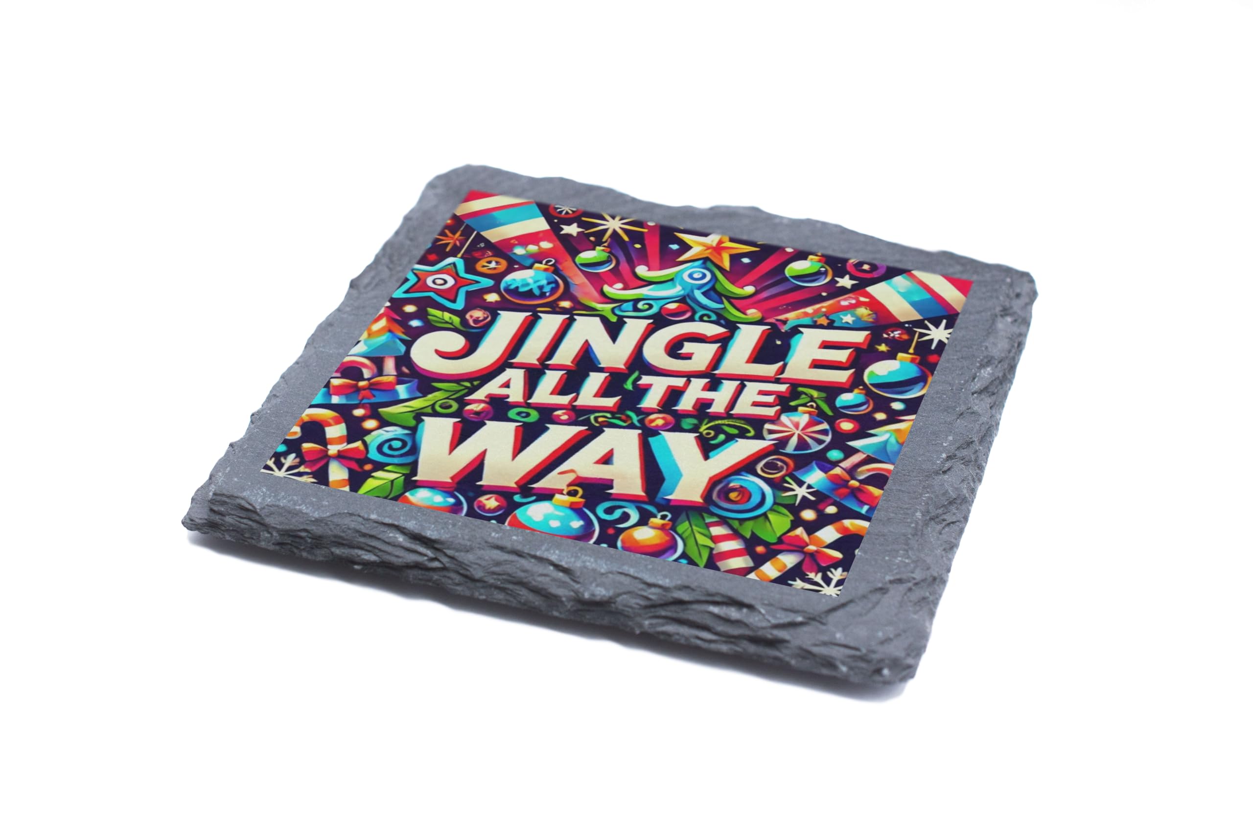 Celebrate the holiday season in style with this festive slate drink coaster featuring a vibrant "Jingle All The Way" design. Bursting with colorful holiday elements like candy canes, stars, and ornaments, this coaster brings instant cheer to any space. Crafted from premium natural slate, it combines practicality and festive aesthetics. The durable material ensures long-lasting use while protecting your surfaces from heat, moisture, and scratches. Its rustic edges add a unique, handmade feel, making it a standout piece of holiday decor. Perfect for your home, office, or holiday gatherings, this coaster is versatile enough to complement any setting. It also makes a delightful Christmas gift for loved ones, spreading warmth and joy wherever it goes. Add this festive slate coaster to your holiday collection and let it brighten up your celebrations!
