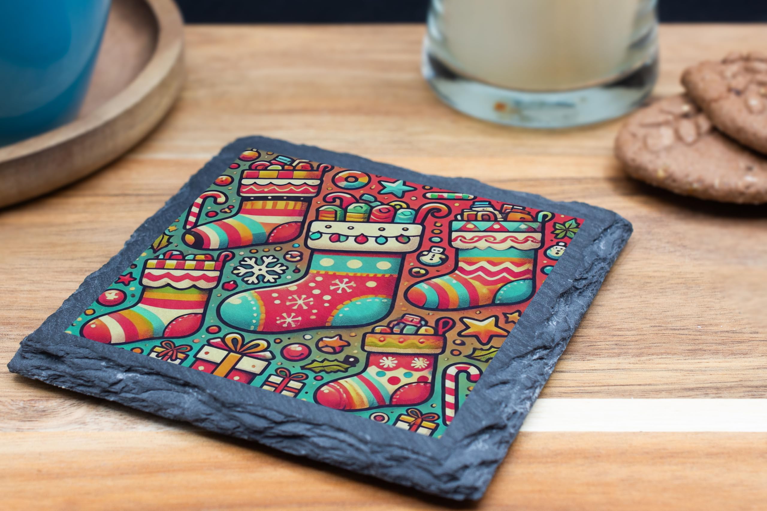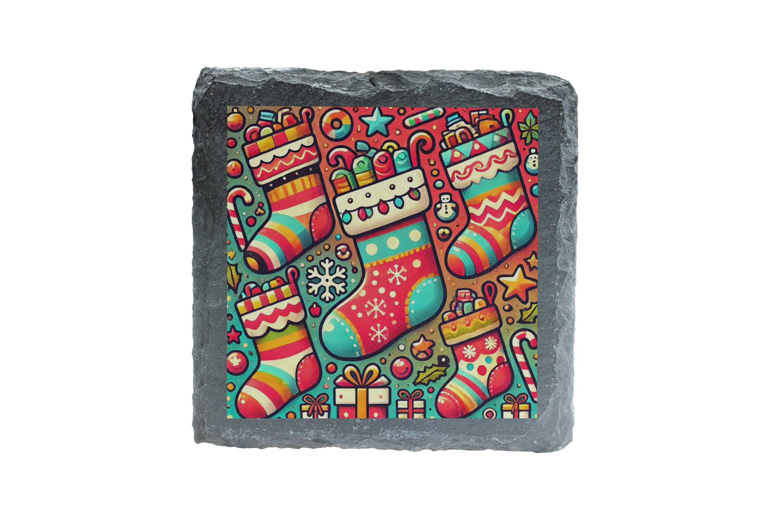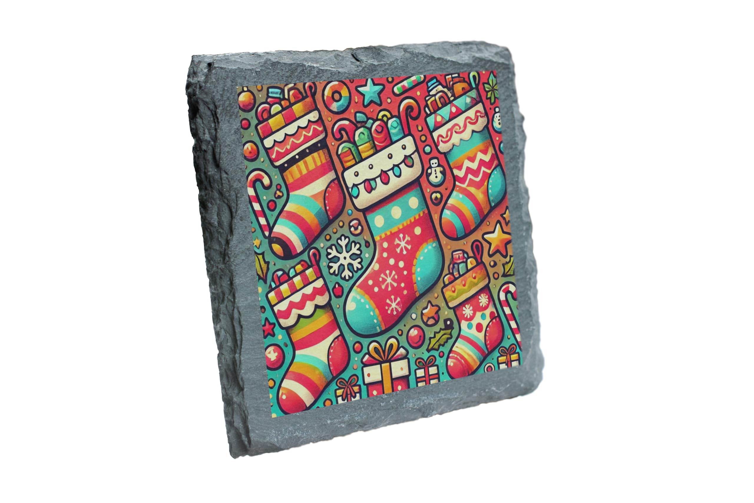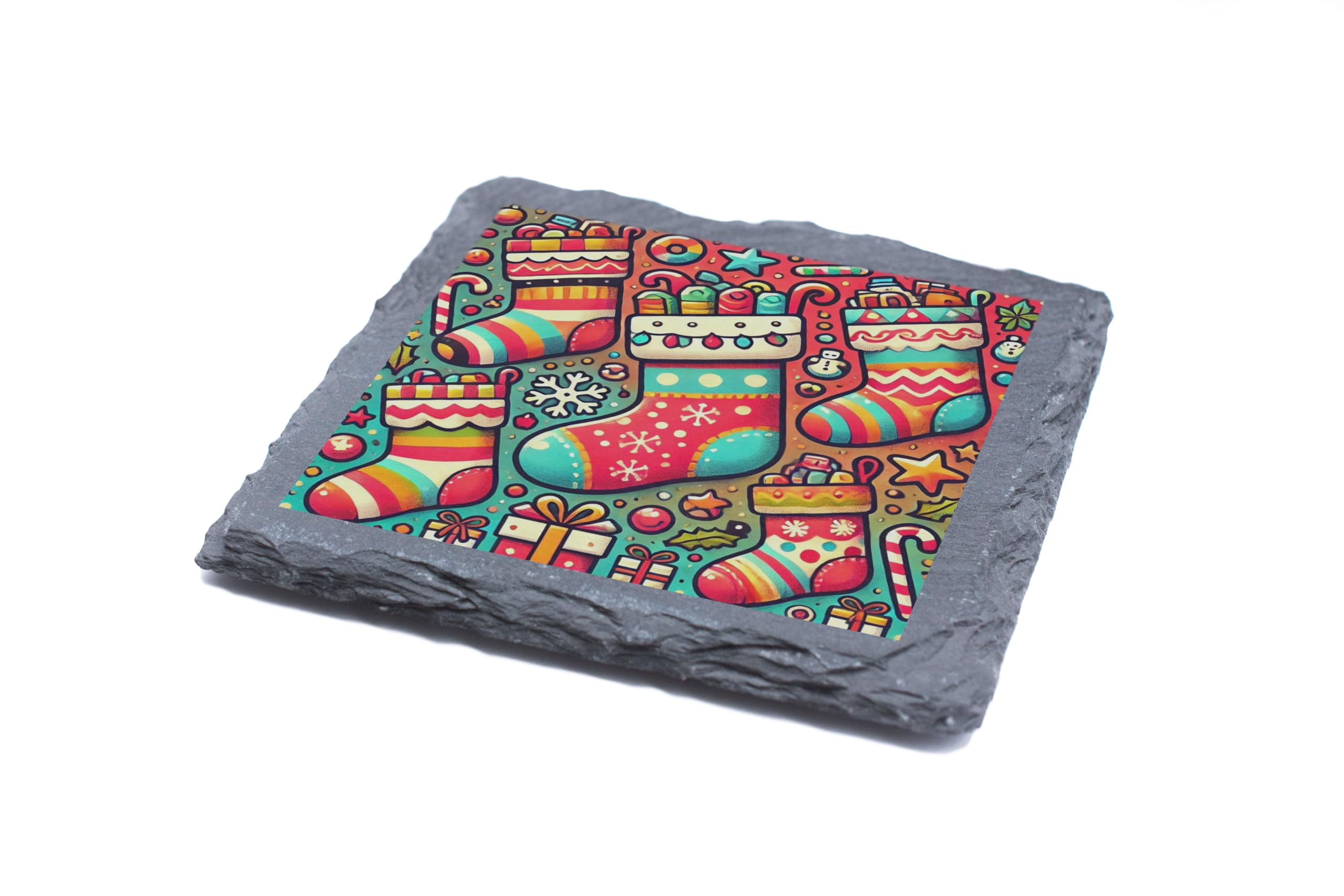 Bring a pop of festive color to your home this holiday season with this vibrant slate coaster. Decorated with a playful and colorful Christmas stockings design, this coaster is a delightful addition to your holiday decor. Its lively pattern spreads cheer, making every sip feel like a celebration. Crafted from premium-quality natural slate, this coaster not only looks great but also protects your surfaces from drink stains and water rings. The rustic edges add a touch of elegance, blending modern design with traditional materials. Whether used during family gatherings or as a thoughtful Christmas gift, this coaster will brighten up any festive occasion. Celebrate the season in style!