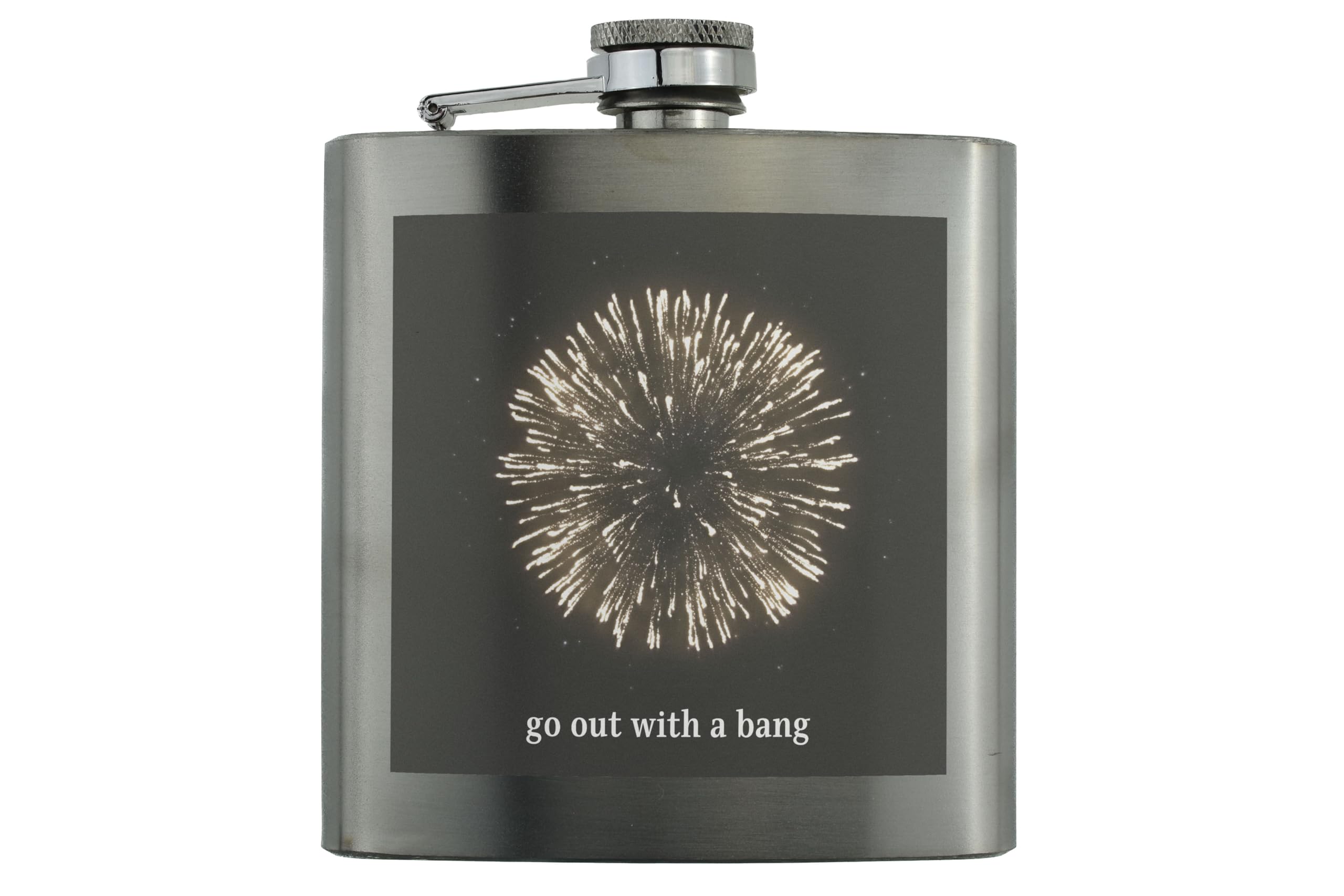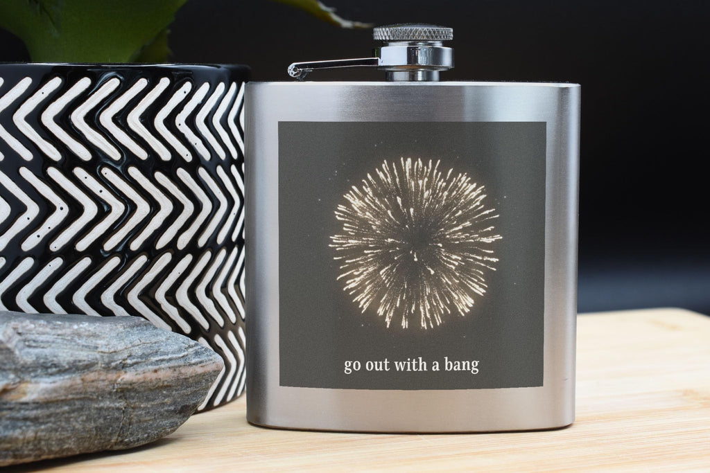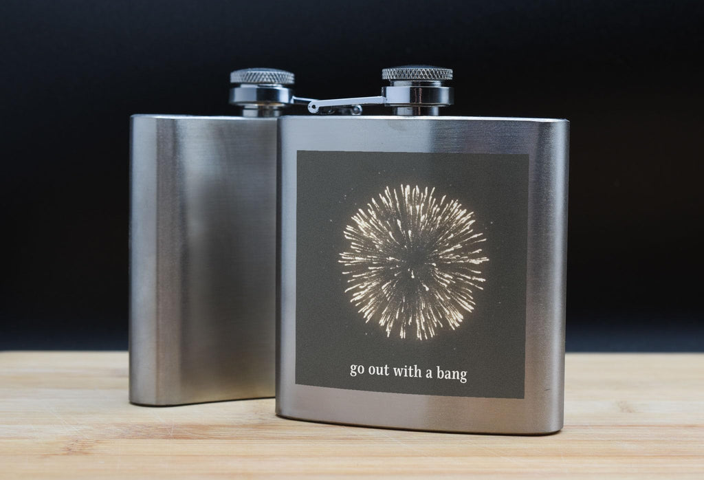 Introducing our Fireworks Celebration Stainless Steel Flask with 'Go Out with a Bang' UV Printed Design! This bold and eye-catching flask is the perfect accessory for any party or night out. The unique full-colour fireworks design is sure to make a statement and add flair to your drinkware collection. Whether you're celebrating New Year's Eve, a special occasion, or just having a fun night out, this festive hip flask is a must-have party essential. Made from quality stainless steel, this durable flask is not only stylish but also practical. It makes for a memorable gift for friends, family, or yourself. With its 'Go Out with a Bang' slogan, this flask is ready to help you start the party and keep the celebration going all night long.
