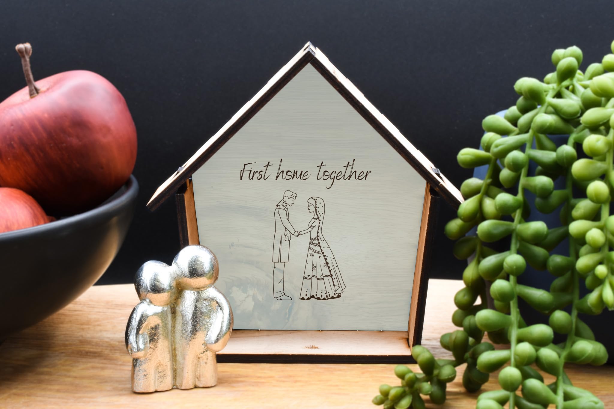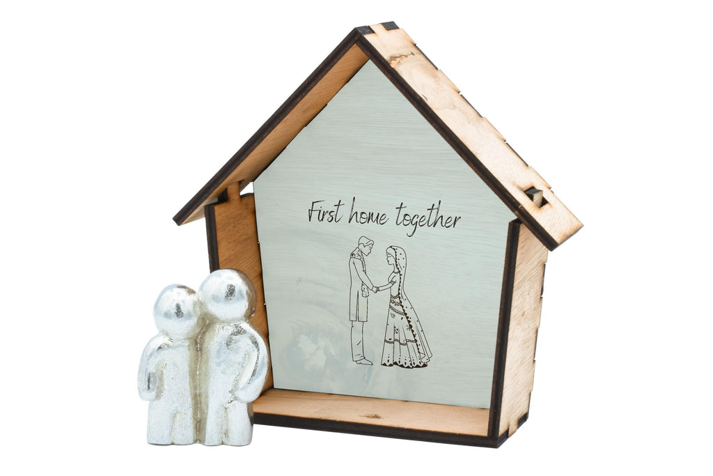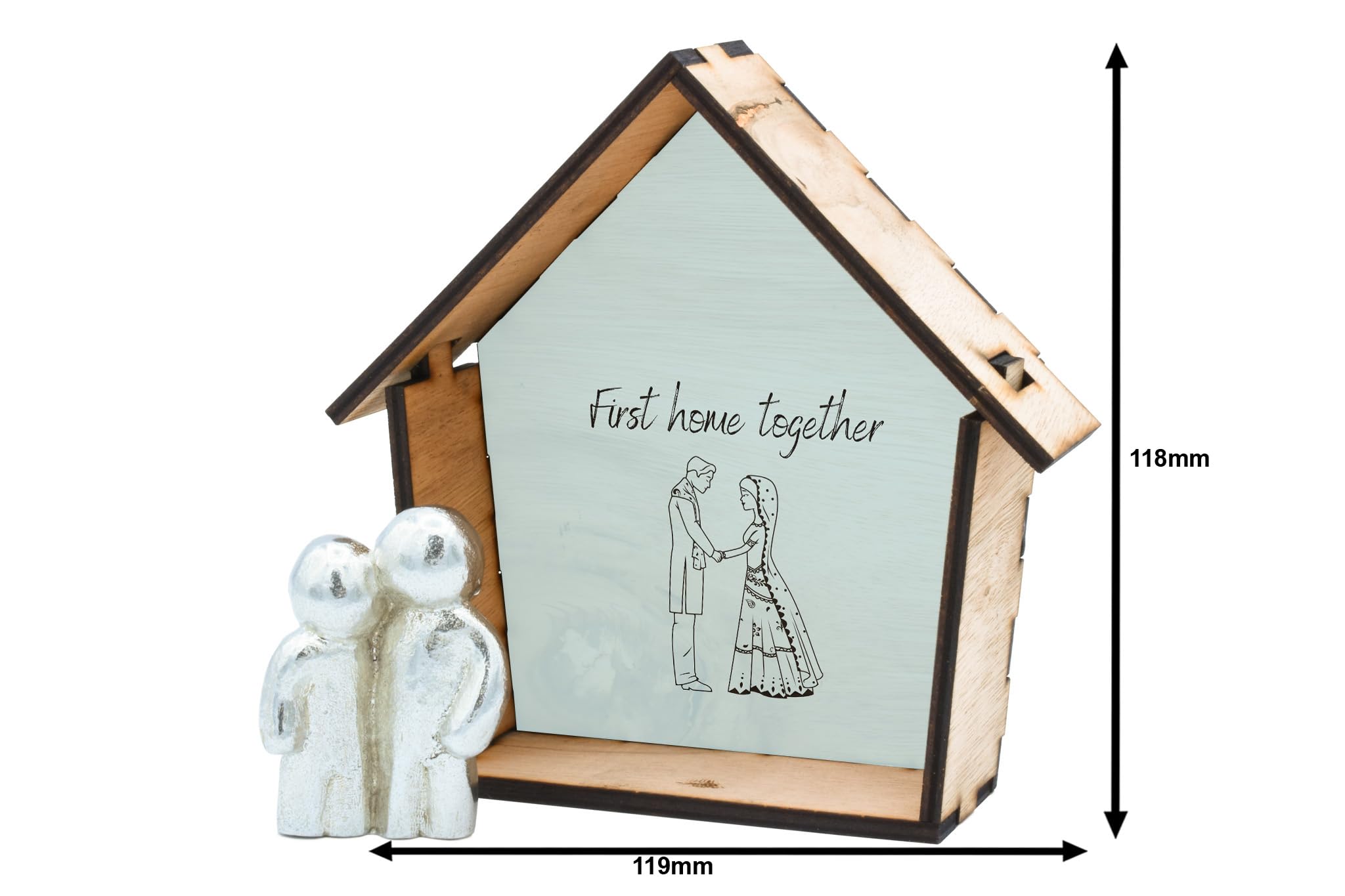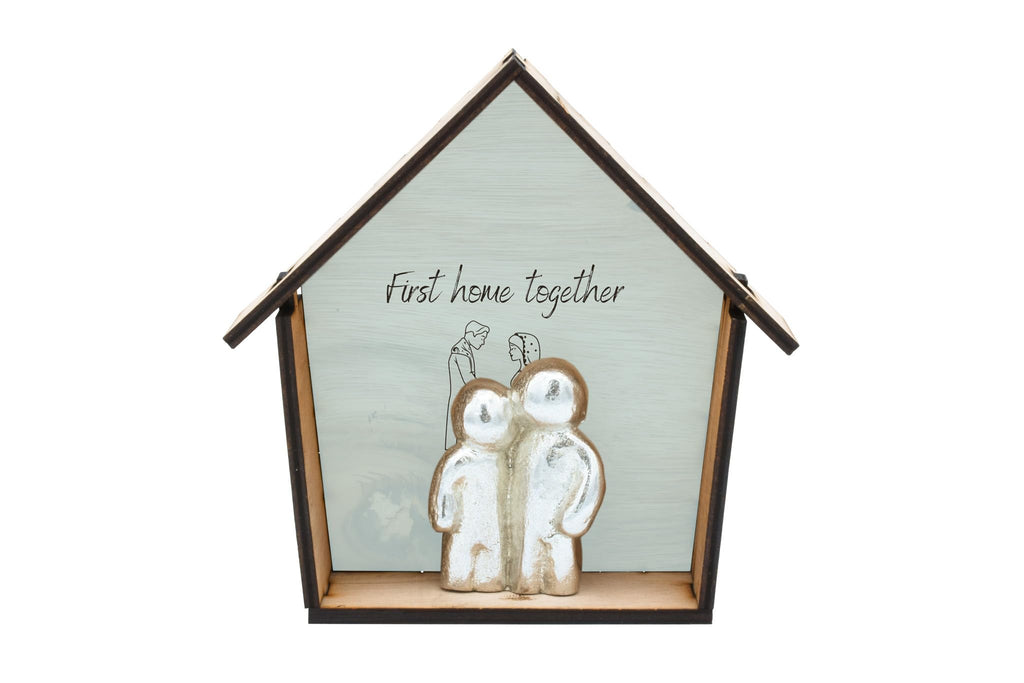 First Home Together Gift: Wooden House Ornament with Full Colour Print and Metal Hugging Couple Stand for Couples, Husband, Wife, (house-ha23-firsthome)