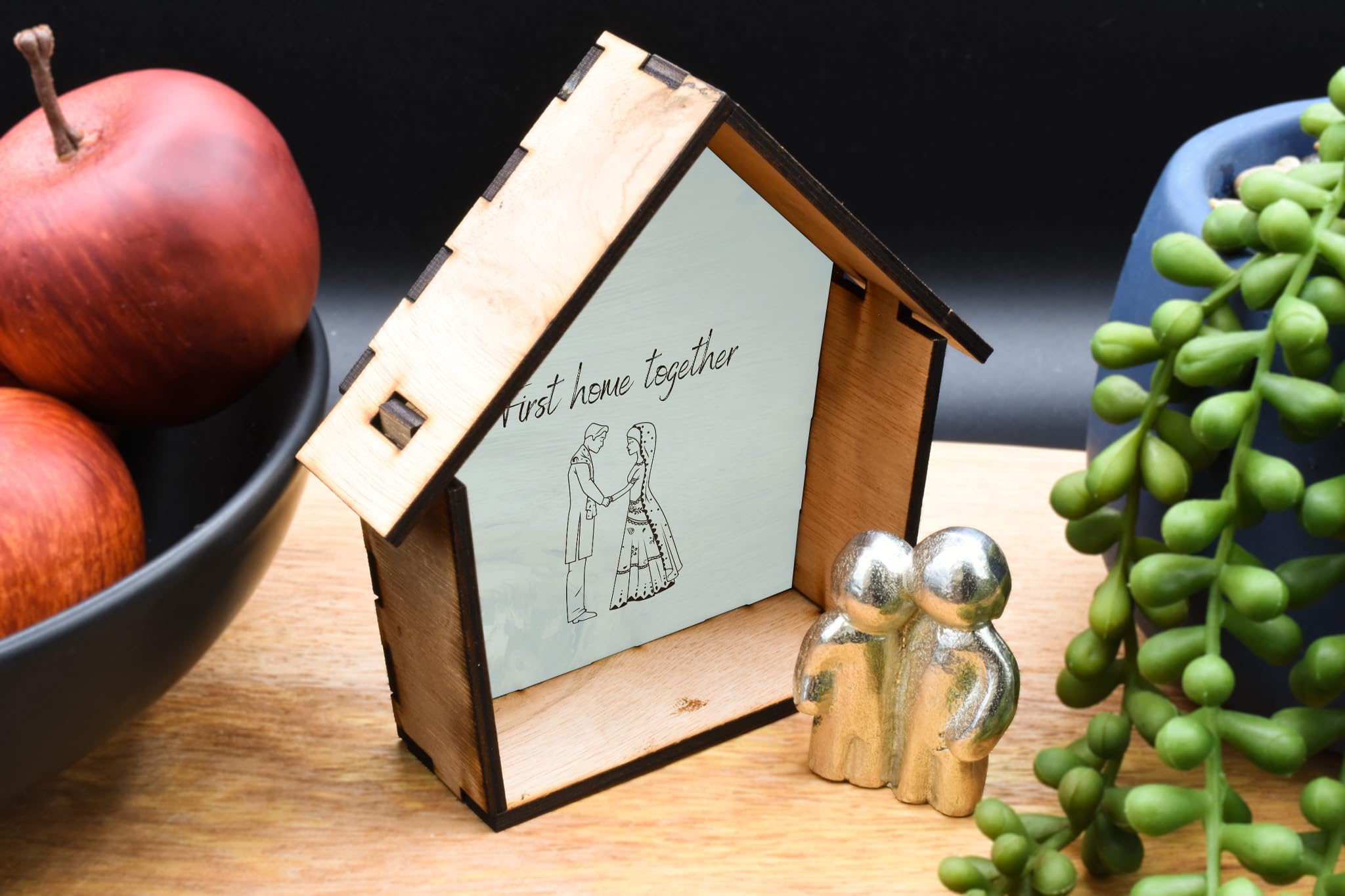 Celebrate the joyous occasion of a first home together with our exquisite Wooden House Ornament. This beautifully designed ornament is a perfect gift for couples, whether they are newlyweds, newly engaged, or simply starting their journey together. Crafted from quality plywood, this ornament features a vibrant full colour print that showcases a charming house design, symbolising the special place they now call home. The ornament also includes a unique metal hugging couple stand, elegantly displayed inside the ornament, representing the love and strong bond between the couple. This gift is not only ideal for Christmas but also for housewarming events, anniversaries, and any occasion that celebrates love and togetherness.