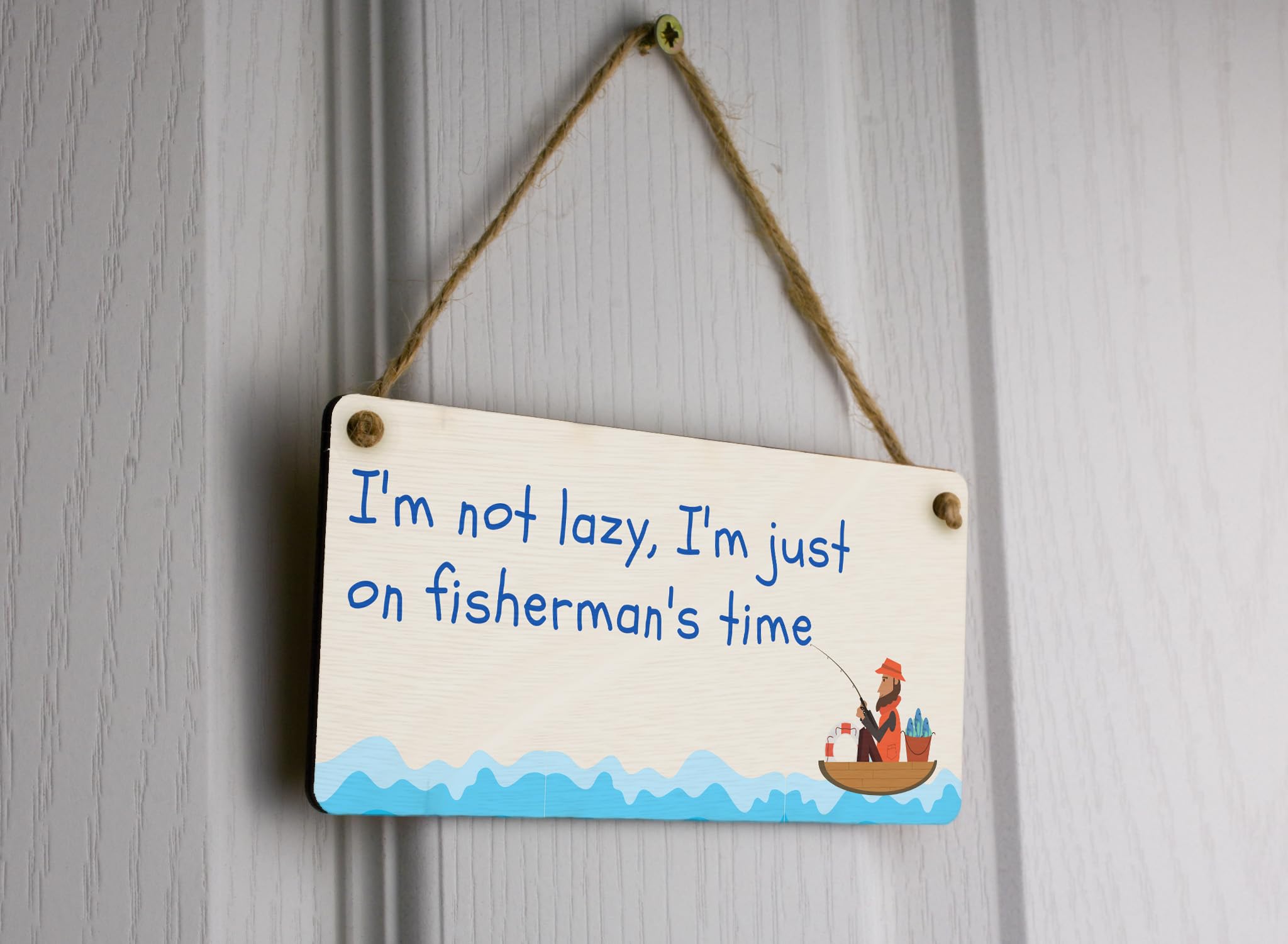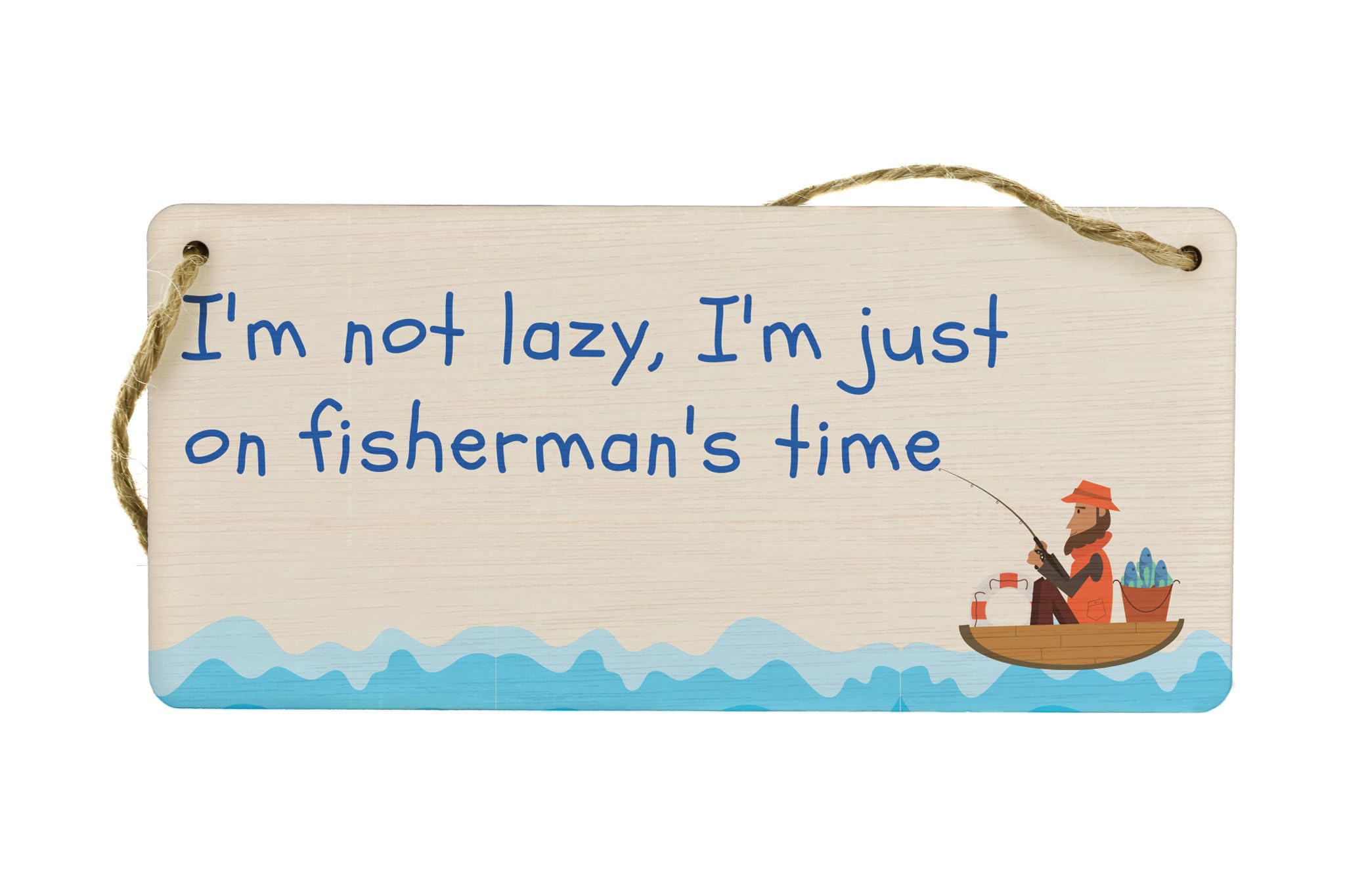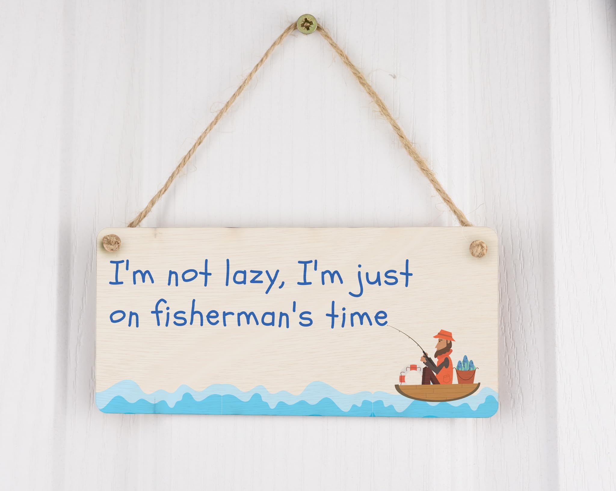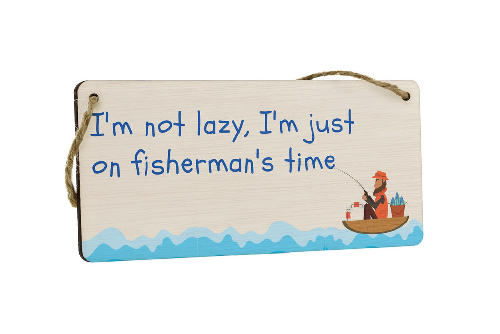 Add a touch of humor to any space with this hilarious Plywood Hanging Sign for Funny Fishing Enthusiasts. Made from high-quality plywood, this sign is designed to hang on walls and bring a smile to your face. The sign reads 'I'm not lazy, I'm just on Fisherman's time', a perfect representation of every fishing enthusiast's mindset. With its full-color design and funny fishing quotes, this sign is not only a great addition to your home decor but also a unique and thoughtful gift for him or Dad. Whether it's for a man cave, a fishing cabin, or simply a fishing lover's room, this funny fishing wall sign is sure to be a conversation starter and make everyone chuckle.