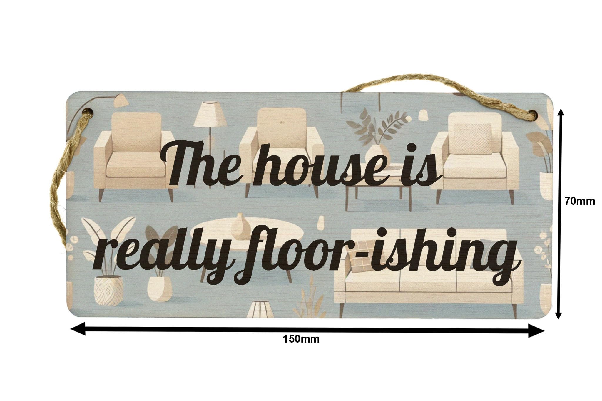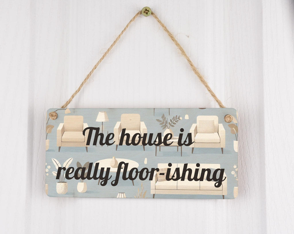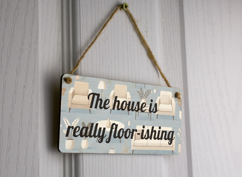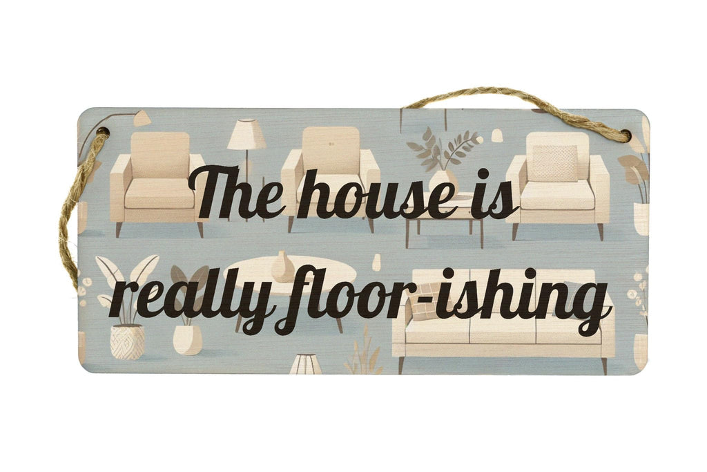 Add a touch of playful charm to your living room decor with our 'Floorishing Living Room Decor Plywood Hanging Sign'. This unique piece of hanging decoration is perfect for anyone who loves a good floor pun and wants to create a cosy atmosphere in their home. The modern furniture and interior design enthusiast will appreciate the minimalist style and light-hearted quote displayed on this decorative wall art. The full colour design features a cute living room illustration on a blue background, making it the ideal addition to a contemporary home theme. Made from handcrafted laser cut plywood, this hanging sign is UV printed with an AI generated art, ensuring a quality finish. Whether you're looking to spruce up your own space or searching for the perfect housewarming gift, this 'Floorishing' sign is sure to bring a smile to anyone's face. Twine is included for easy hanging.