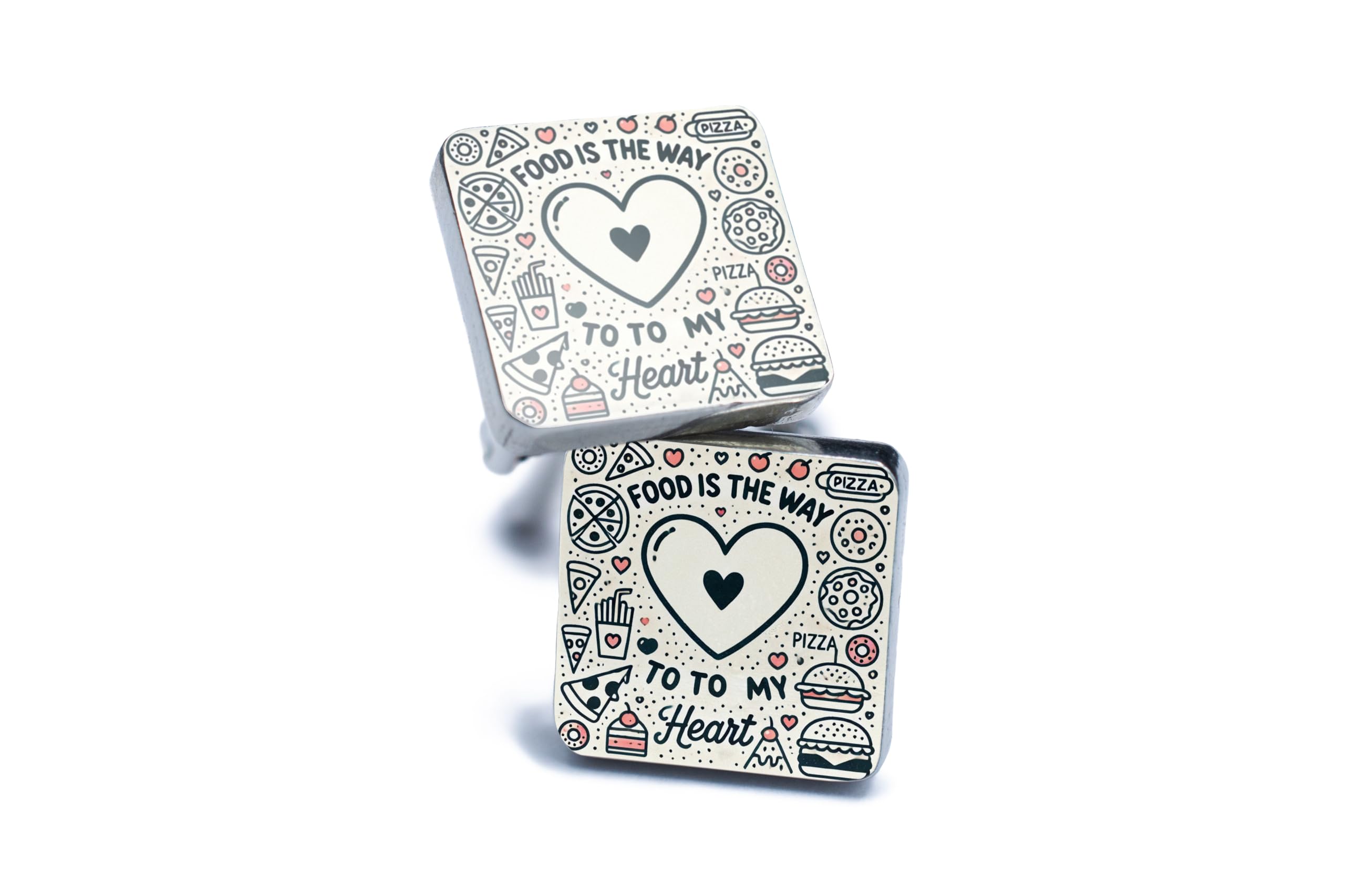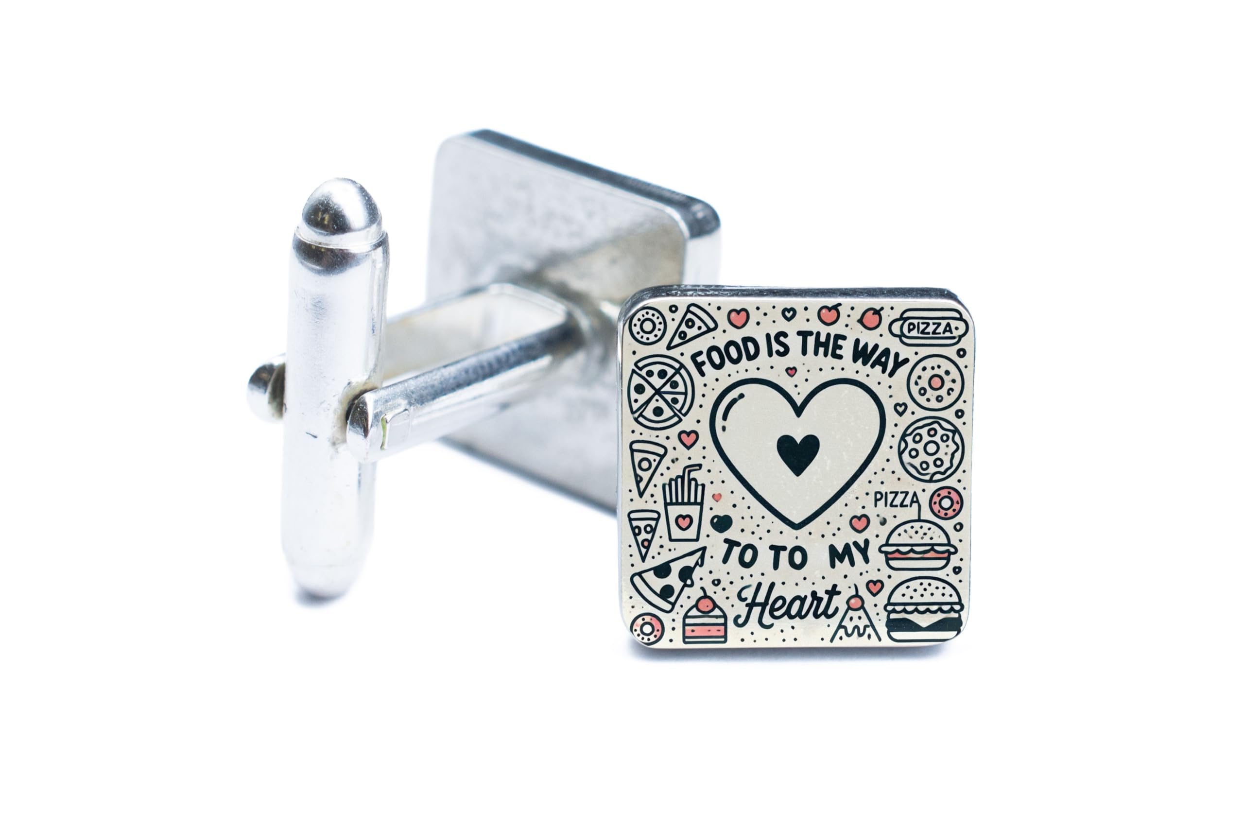 Show off your love for food with these quirky and stylish "Food is the Way to My Heart" Cufflinks. Perfect for food enthusiasts, these cufflinks combine humor and charm with their playful design featuring a heart and delicious illustrations like pizza, burgers, and fries. Crafted with attention to detail, these cufflinks boast a high-quality finish that ensures durability and vibrant graphics. The secure toggle back closure makes them easy to wear while keeping them in place throughout the day. Packaged in a gift-ready box, these cufflinks are the perfect gift for anyone who loves to share their passion for food, whether it's for a birthday, anniversary, or just because. Add a touch of fun and personality to your formalwear with this unique accessory.