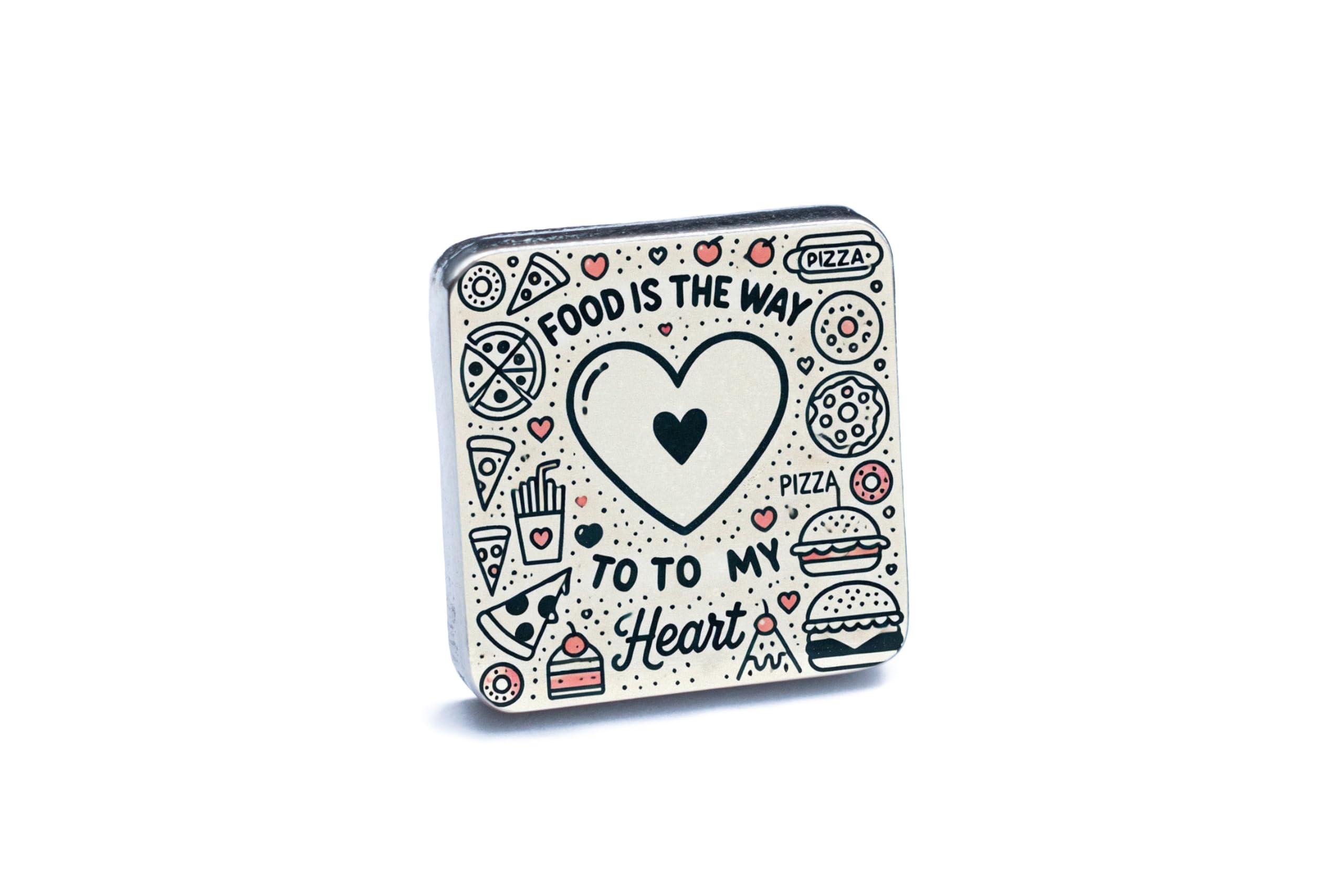 - Playful Design: Features a heartwarming and humorous quote, âFood is the Way to My Heart,â surrounded by illustrations of pizza, burgers, and other delicious treats.