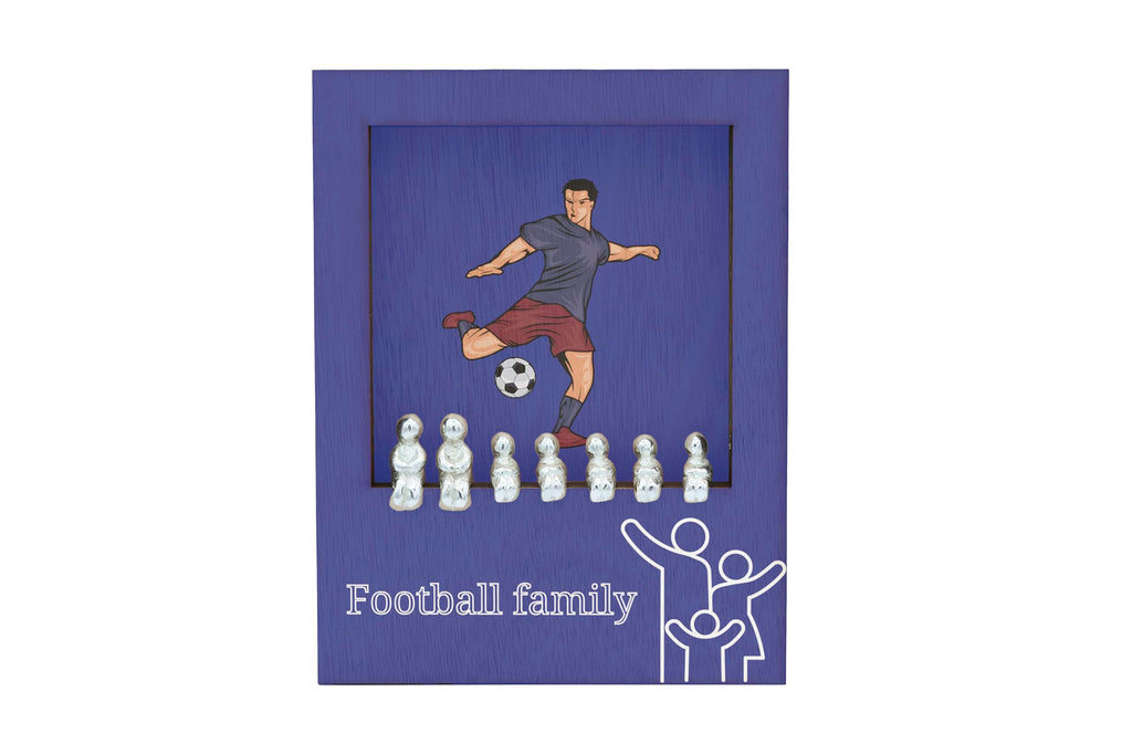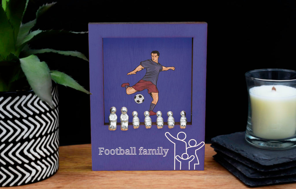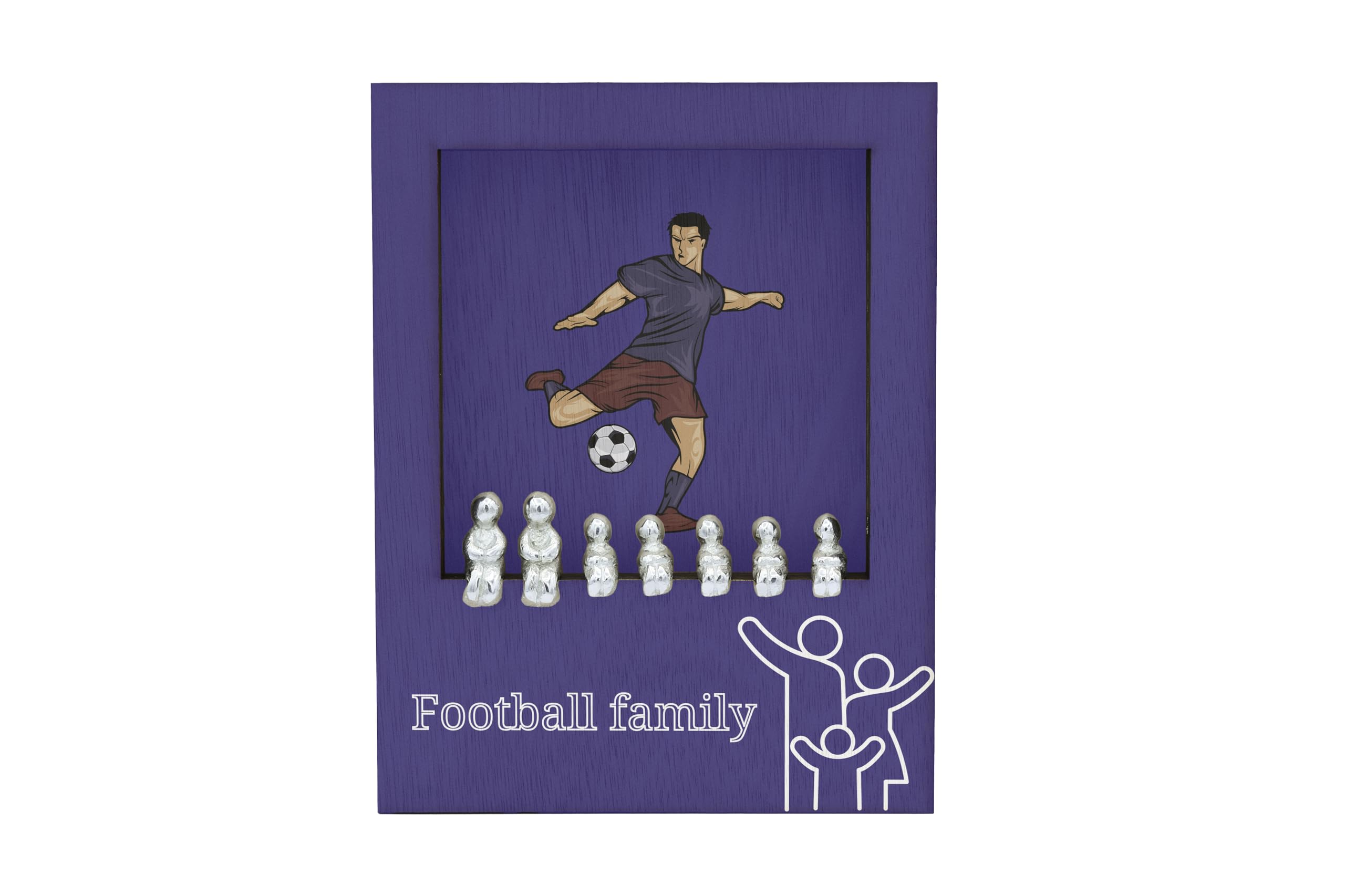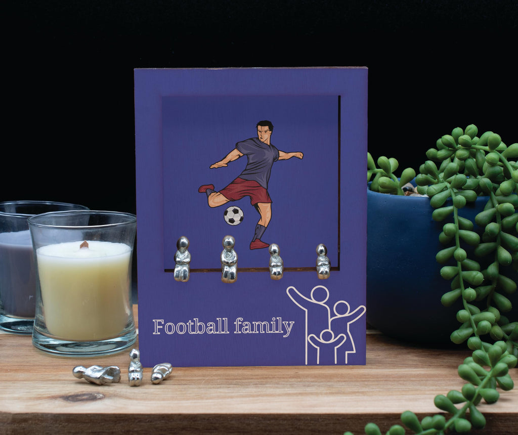 Introducing the Football Family - Family Plywood Ornament, a perfect way to commemorate your love for football and your precious family memories! This customisable photo frame is designed to be a centre piece in your home, serving as a beautiful family ornament and a testament to your football fandom. Made from quality plywood and printed in full colour, this frame features a vibrant purple background with white writing and an image of a footballer. Customise this frame to your own family combination as it comes with a set of 7 metal people that fit perfectly into the frame. It's free-standing, allowing you to display it anywhere in your home. Give this frame as a thoughtful gift to a fellow football fan or as a cherished addition to your own home decor. Cherish your football family memories with this unique and eye-catching photo frame!