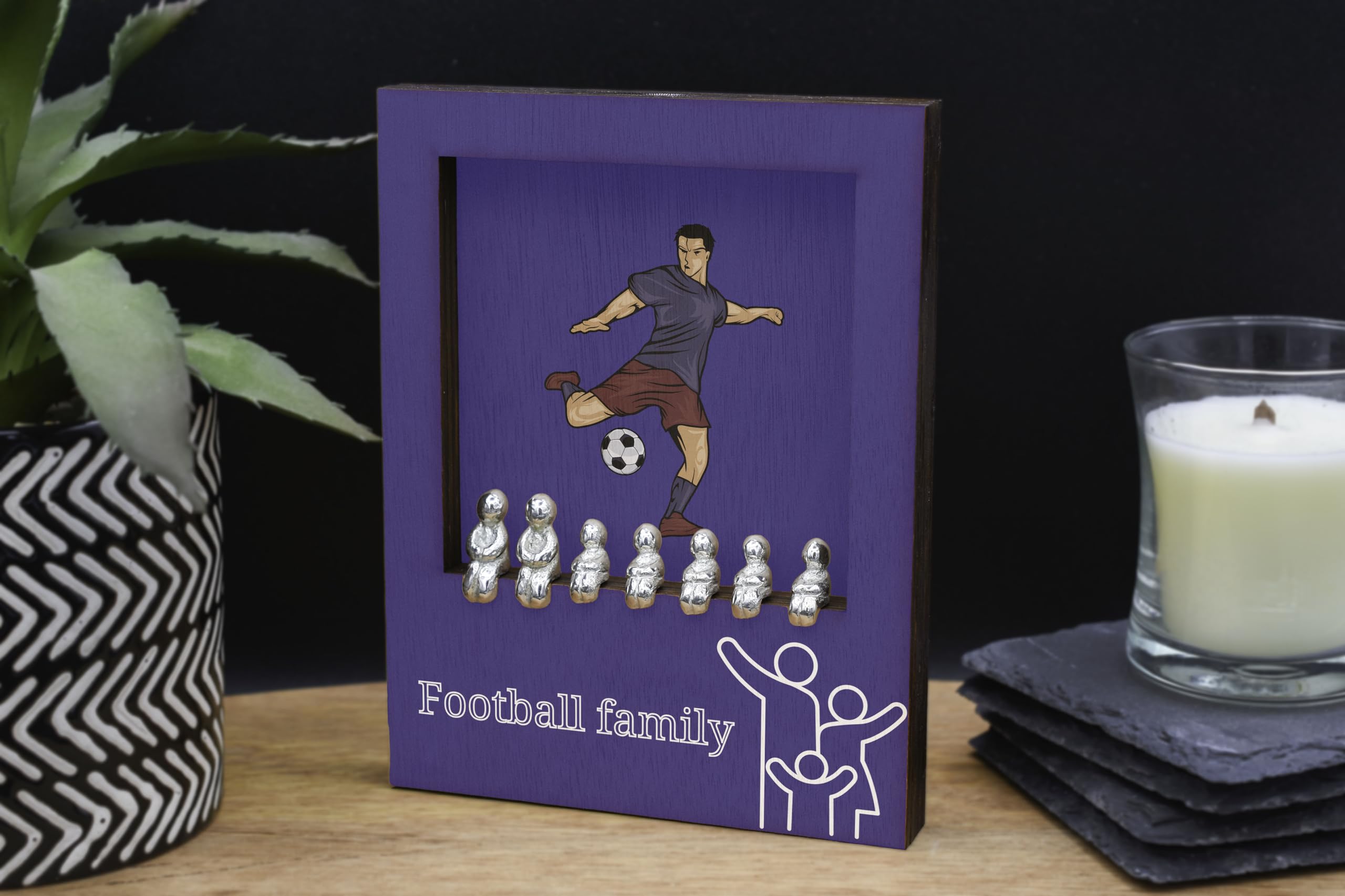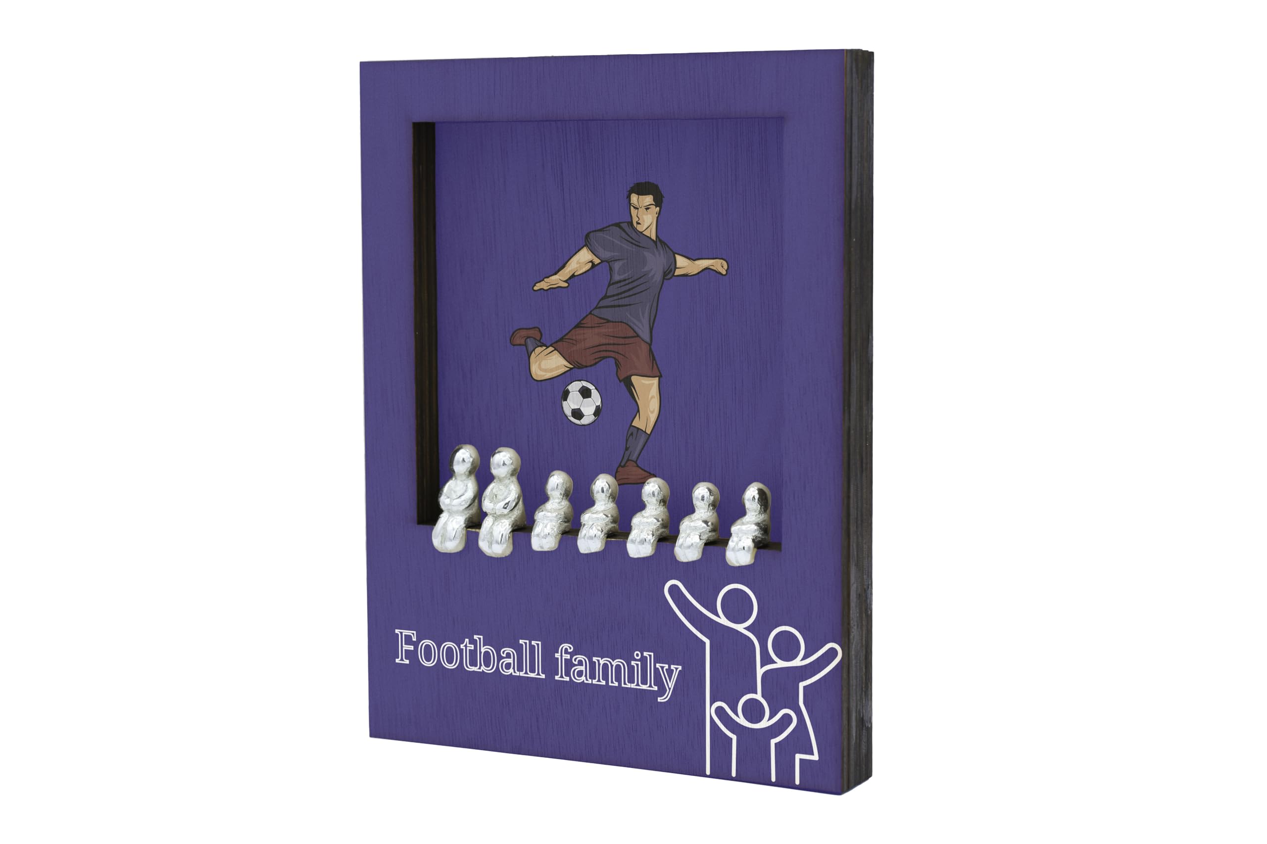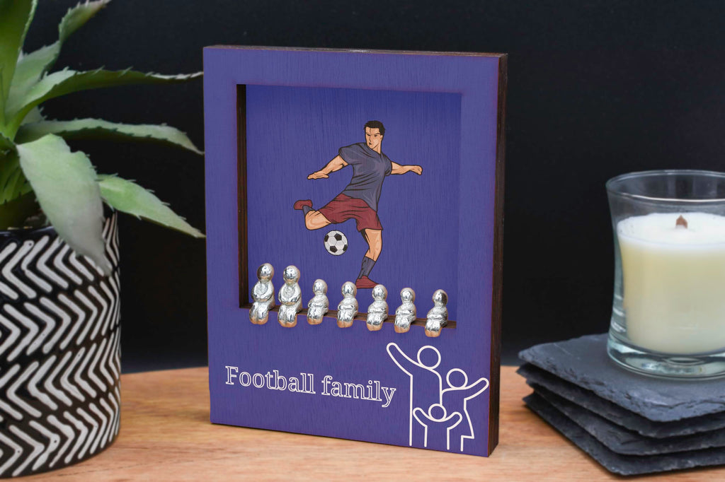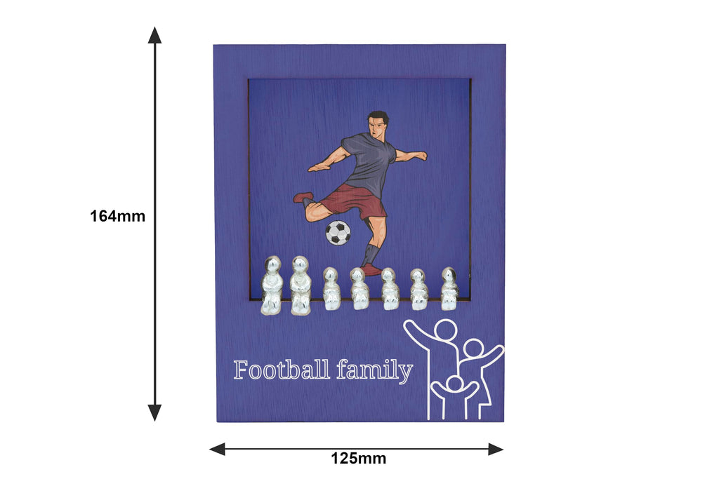 Introducing the Football Family - Family Plywood Ornament, a perfect way to commemorate your love for football and your precious family memories! This customisable photo frame is designed to be a centre piece in your home, serving as a beautiful family ornament and a testament to your football fandom. Made from quality plywood and printed in full colour, this frame features a vibrant purple background with white writing and an image of a footballer. Customise this frame to your own family combination as it comes with a set of 7 metal people that fit perfectly into the frame. It's free-standing, allowing you to display it anywhere in your home. Give this frame as a thoughtful gift to a fellow football fan or as a cherished addition to your own home decor. Cherish your football family memories with this unique and eye-catching photo frame!