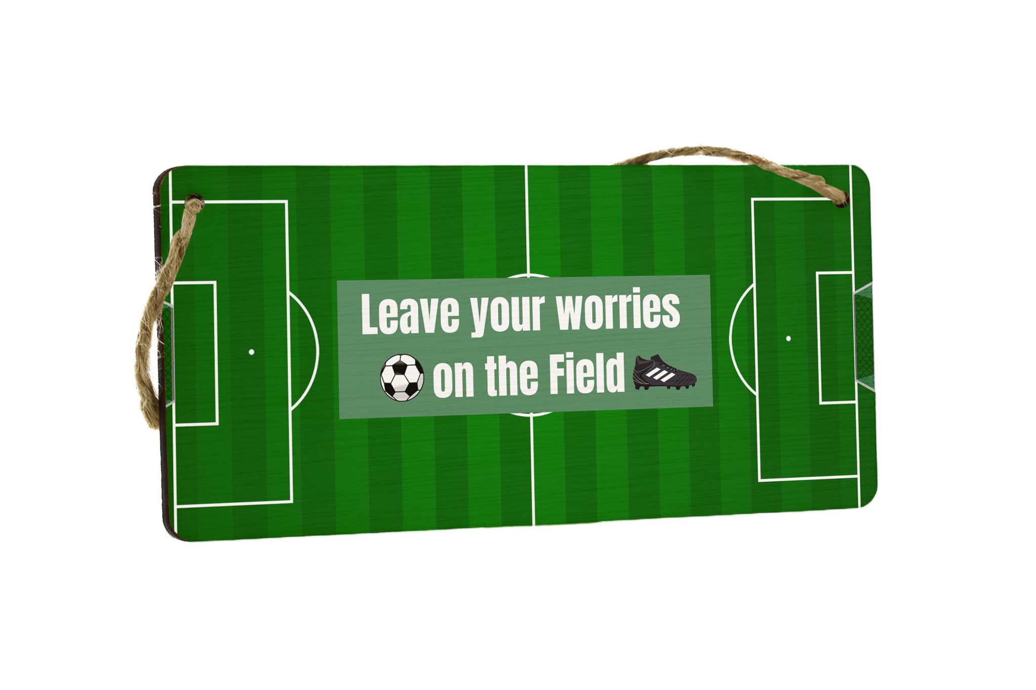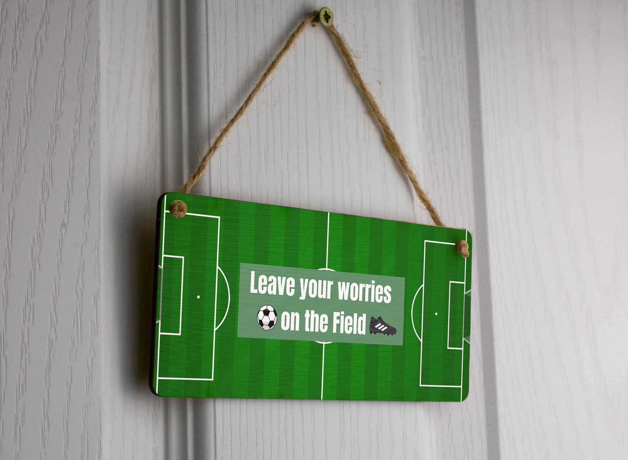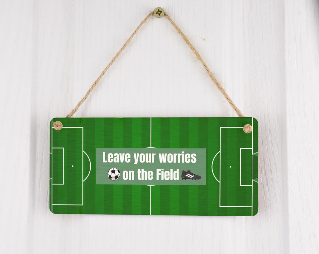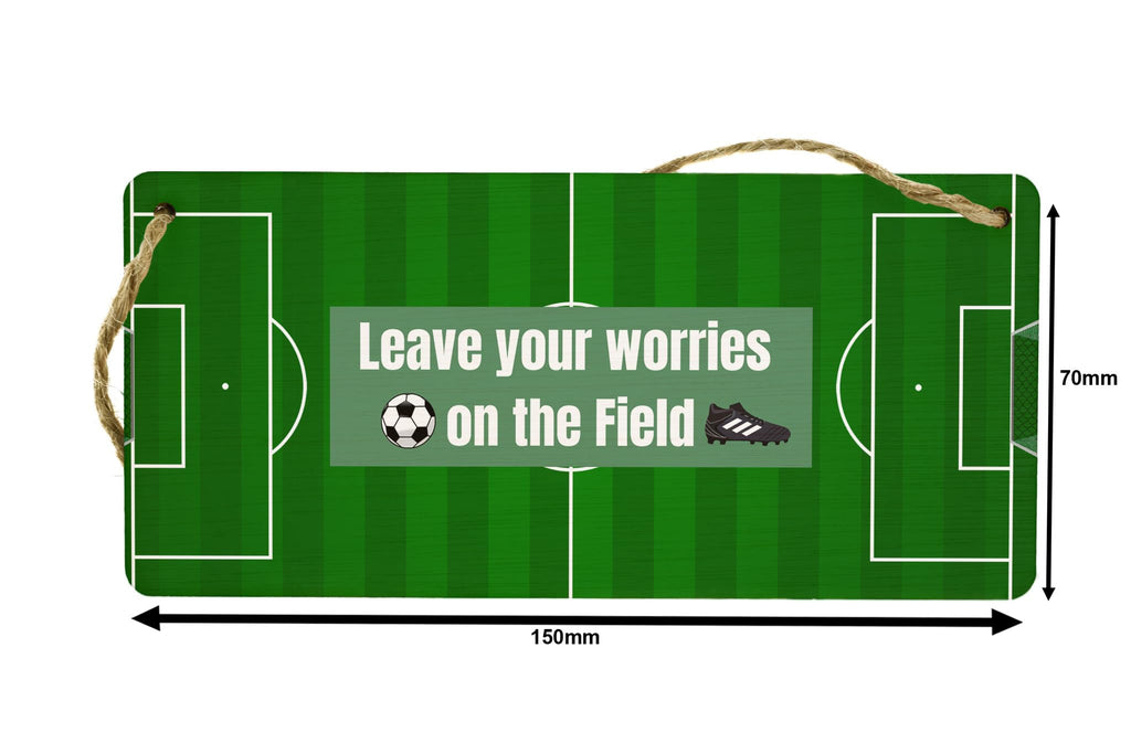 Add a touch of football inspiration to your home decor with this beautiful full colour plywood hanging sign. Whether you're a passionate football lover or looking for a gift for someone special, this sign is sure to impress. With its positive message, 'Leave Your Worries on the Field', it serves as a constant reminder to stay positive and let go of stress. Crafted from quality plywood, this durable sign is designed to last. Hang it in your living room, bedroom, or even your office, and let the football theme bring a sense of joy and motivation to your surroundings. This sign is a perfect addition to any football lover's collection. Whether you're treating yourself or surprising a loved one, this sign is a great gift for both him and her.