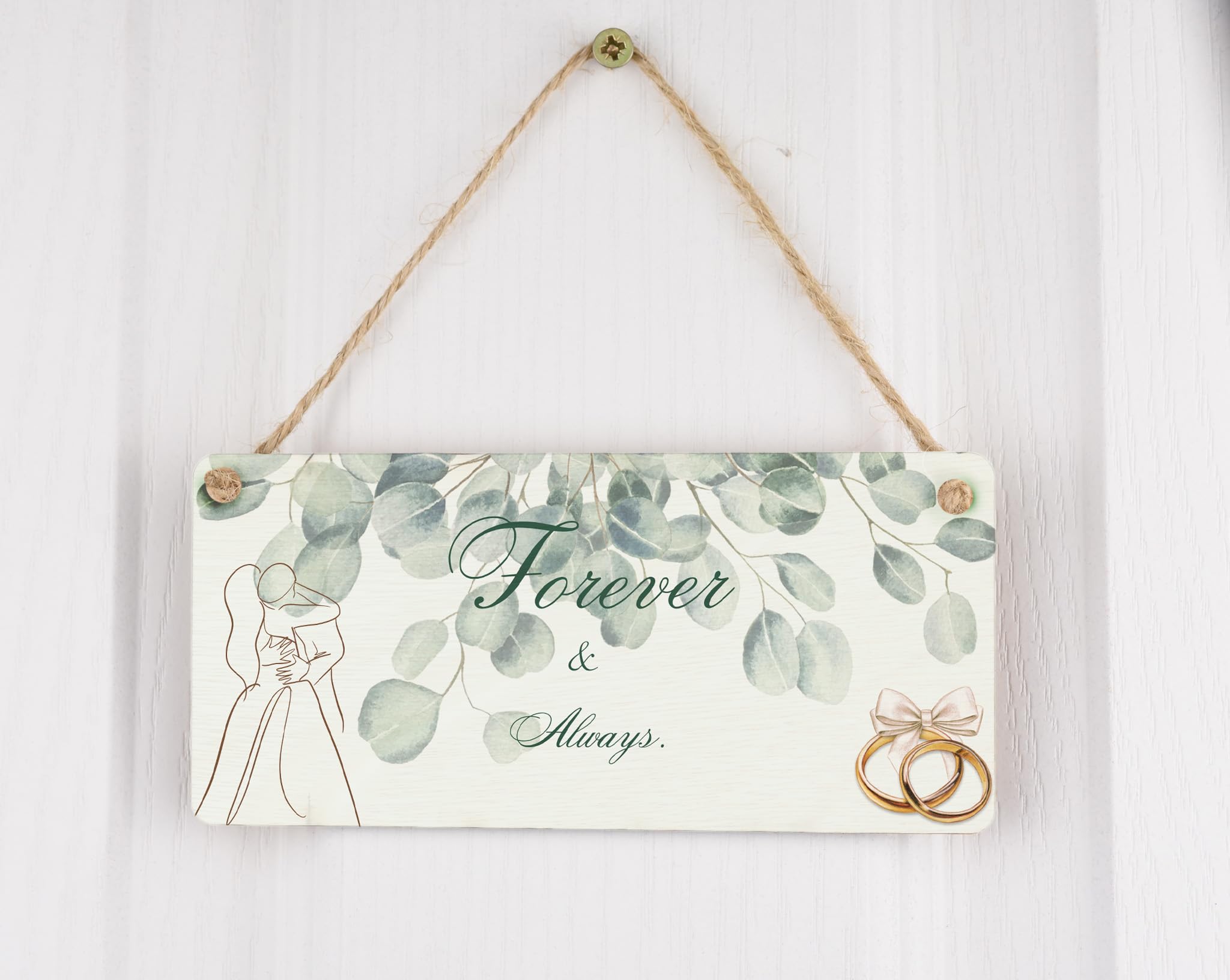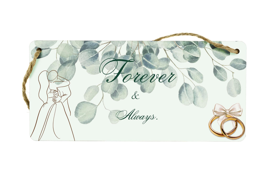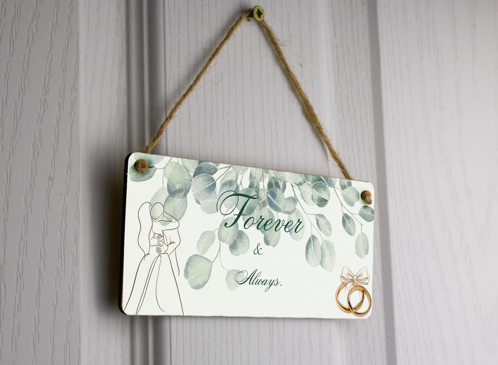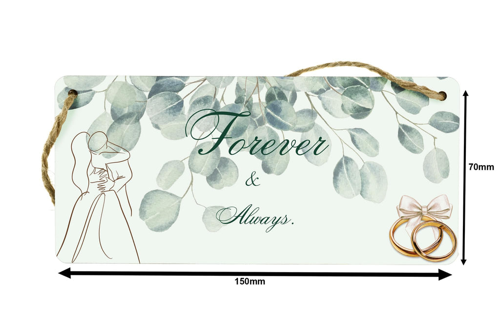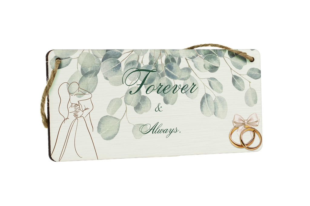 Add a touch of elegance to your wedding venue or home with this beautiful Forever and Always Hanging Wedding Sign. Made from quality plywood, this sign is durable and long-lasting. The sign features a stunning full-colour design that will catch everyone's attention. It reads 'Forever and Always', making it the perfect symbol for everlasting love. Hang it on a wall or in a prominent spot to create a focal point in your space. Whether you're a newlywed or celebrating years of marriage, this sign is a must-have addition to your home and wedding decor. Prioritise your love and showcase your commitment with this charming hanging wedding sign.