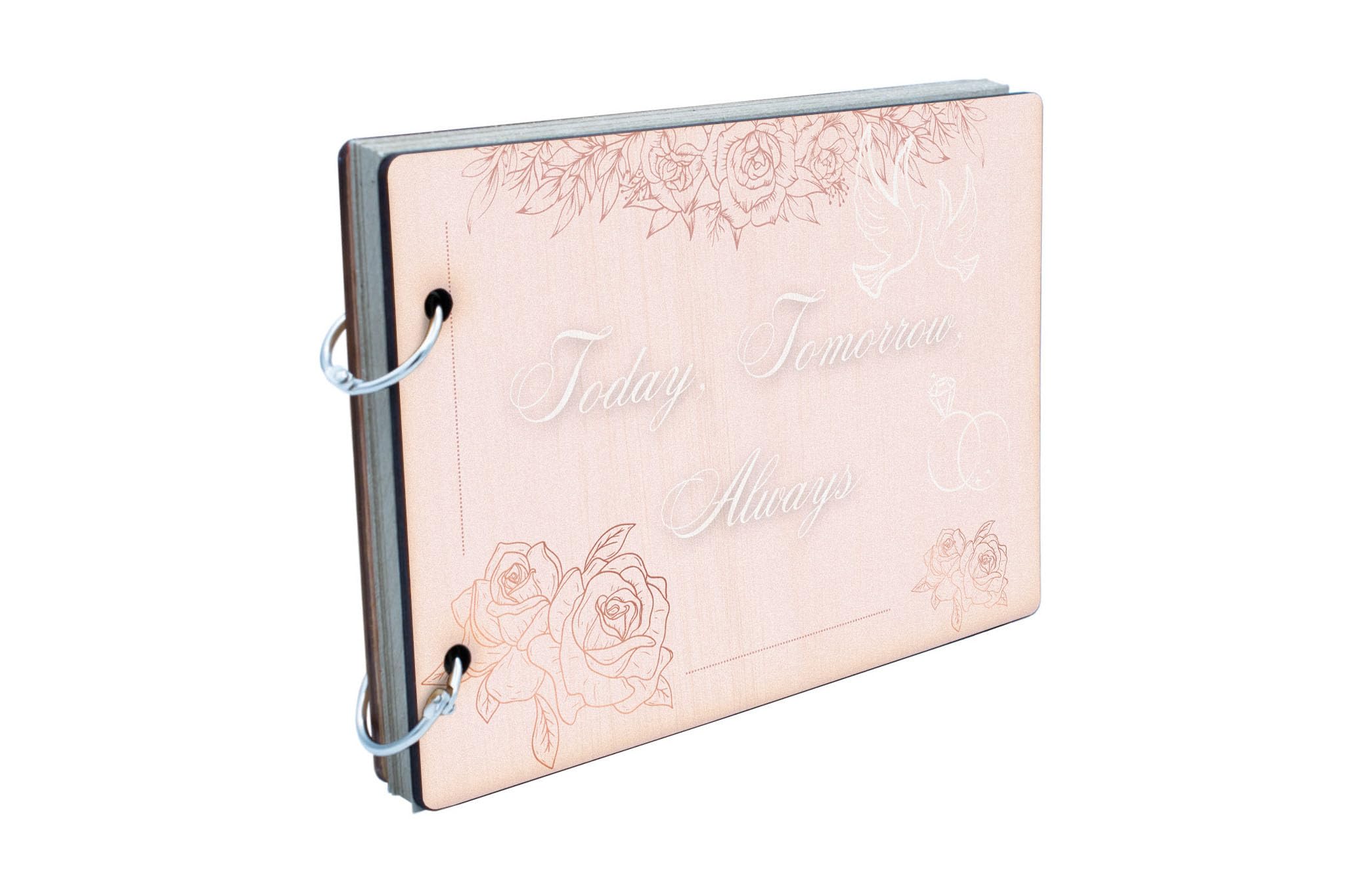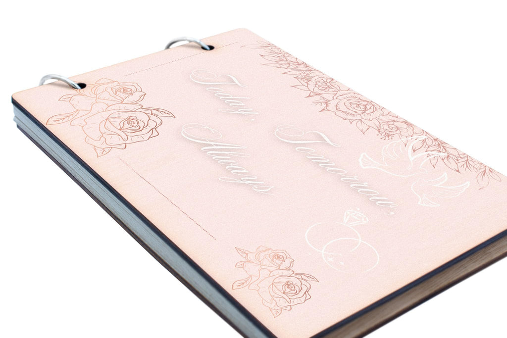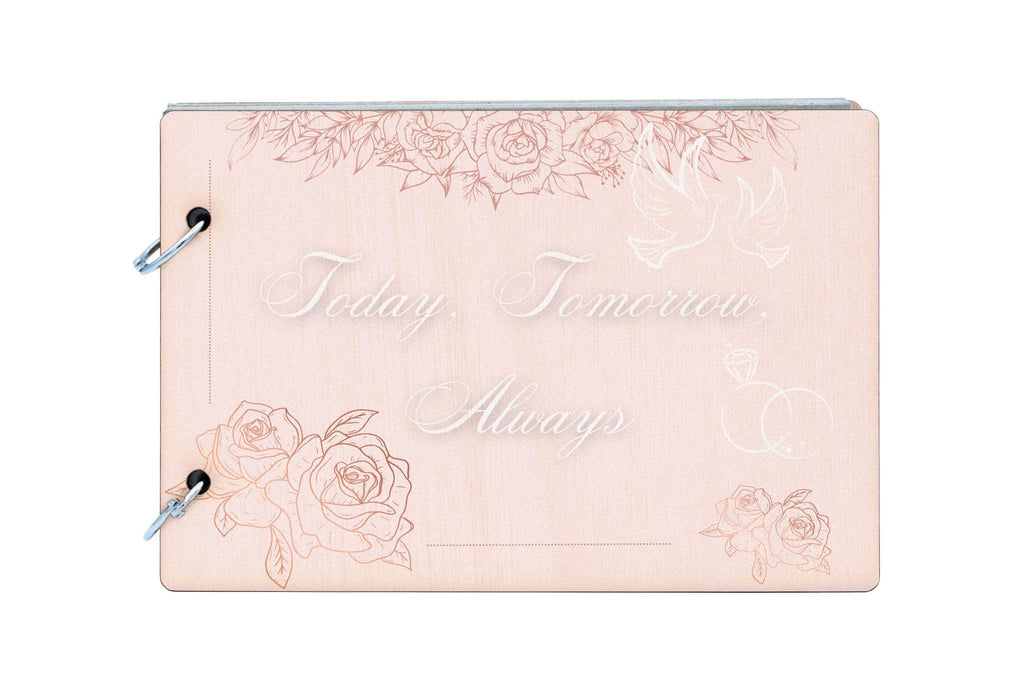 Capture and cherish your wedding memories with our Forever Love Wedding Memory Album. This elegant memory album is the perfect romantic keepsake to commemorate your special occasion. Whether you're looking to create a celebration book of your love story, or a novelty item to remember your cherished moments, this bridal scrapbook is ideal for any couple. This anniversary gift features an elegant wooden cover with a timeless love design, making it the perfect forever moments gift for engagements, weddings, or anniversaries. The album contains 25 recycled pages, each echoing the sentiment of 'today - tomorrow - always'. The full-colour front cover displays a soft pink romantic design, making it an elegant addition to any couple's scrapbook collection.