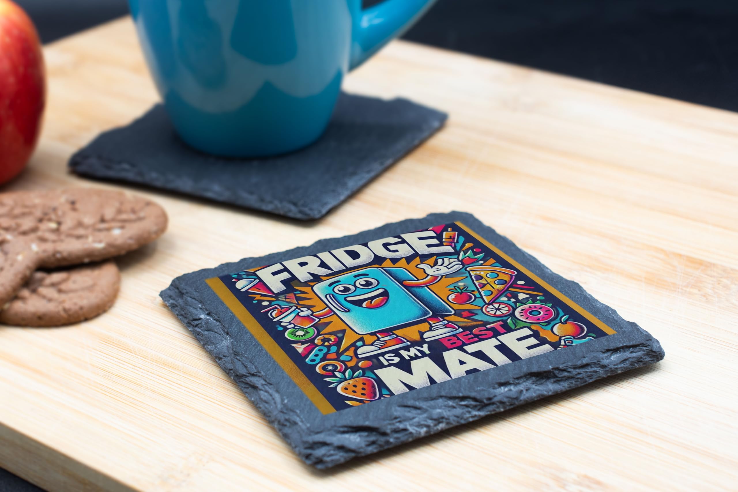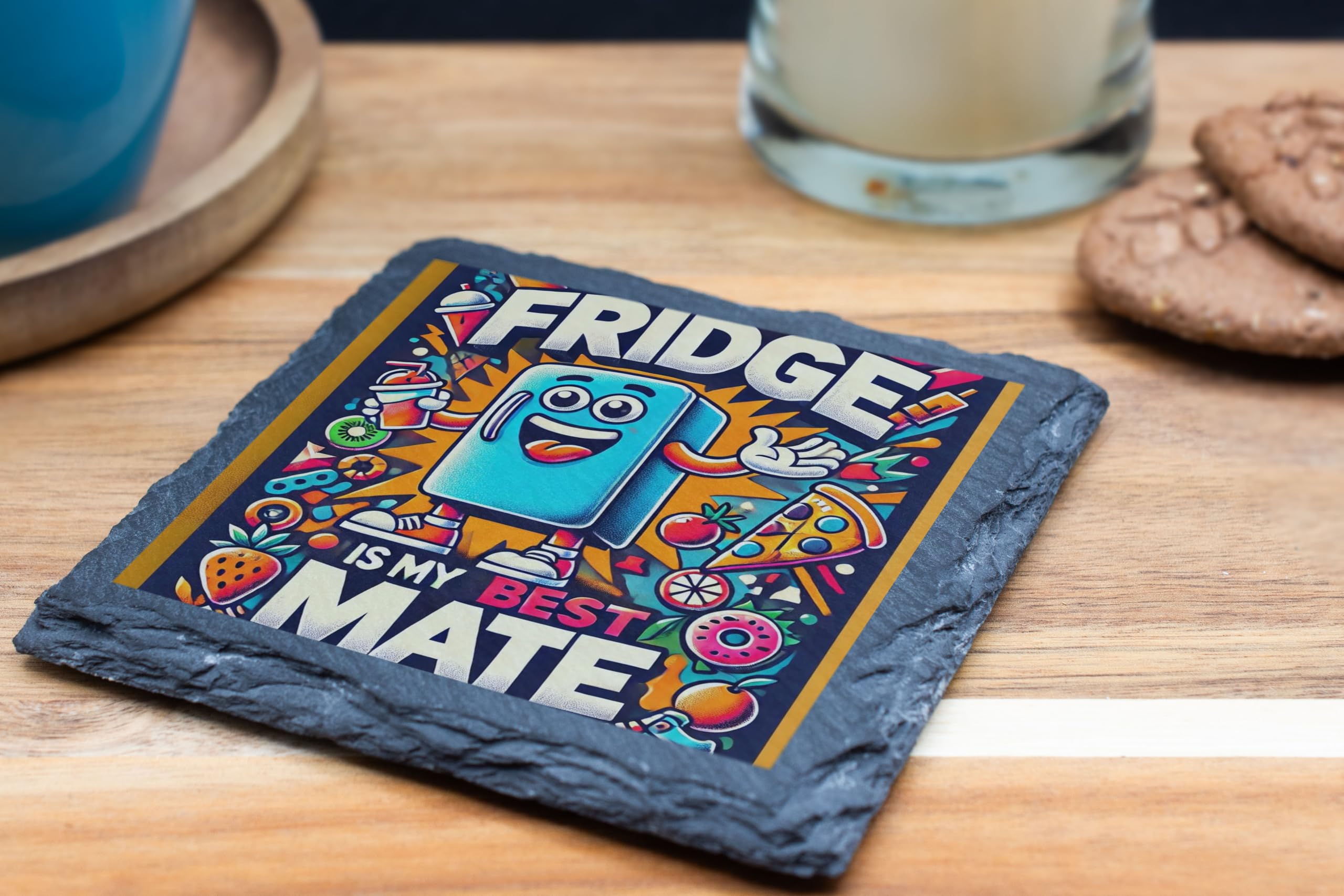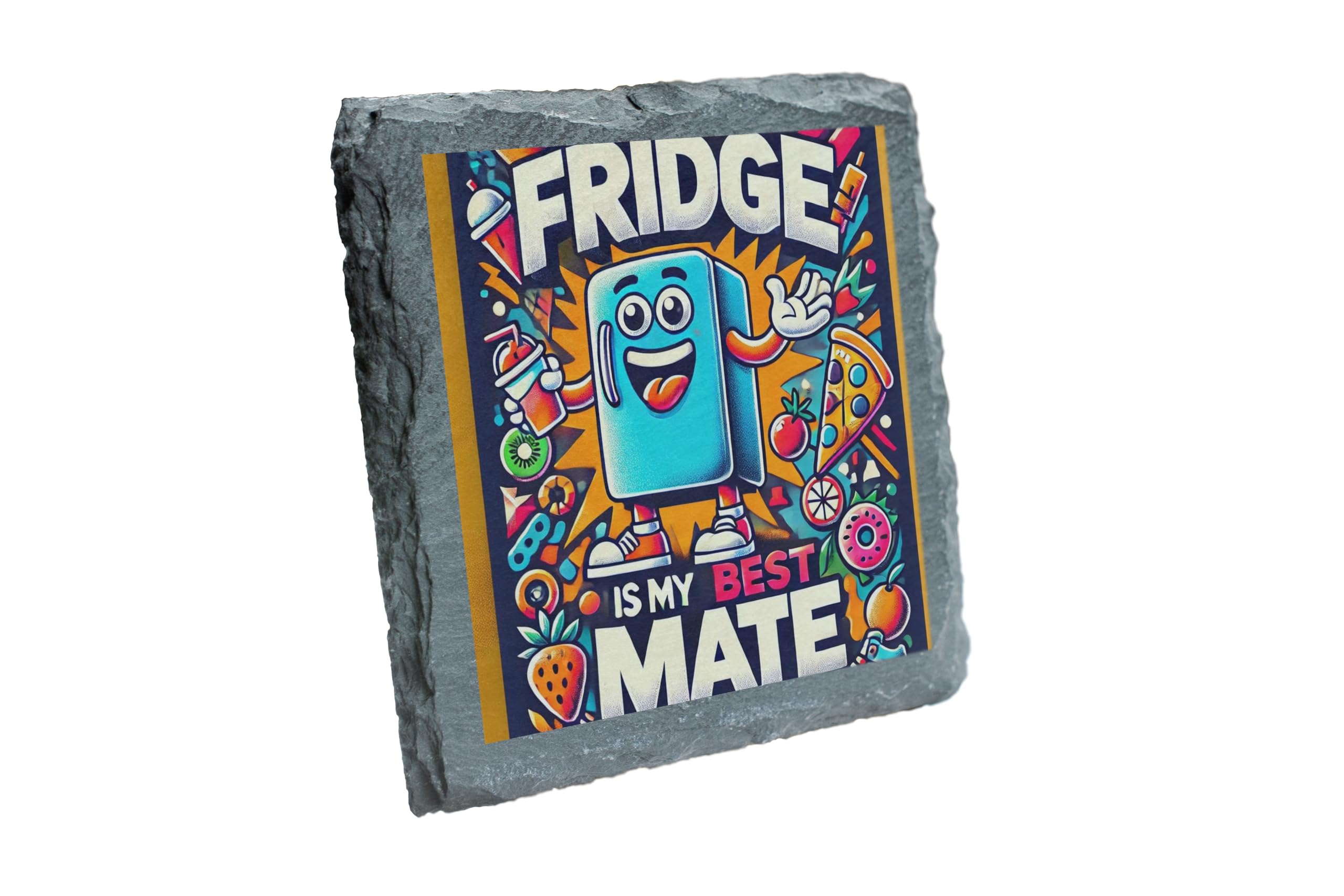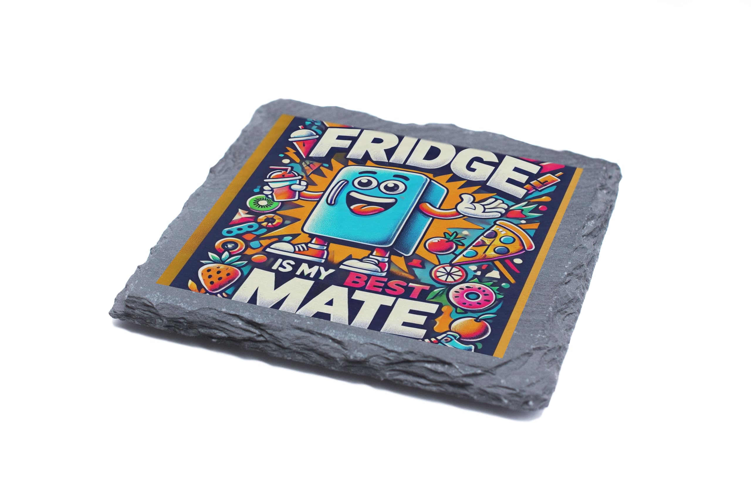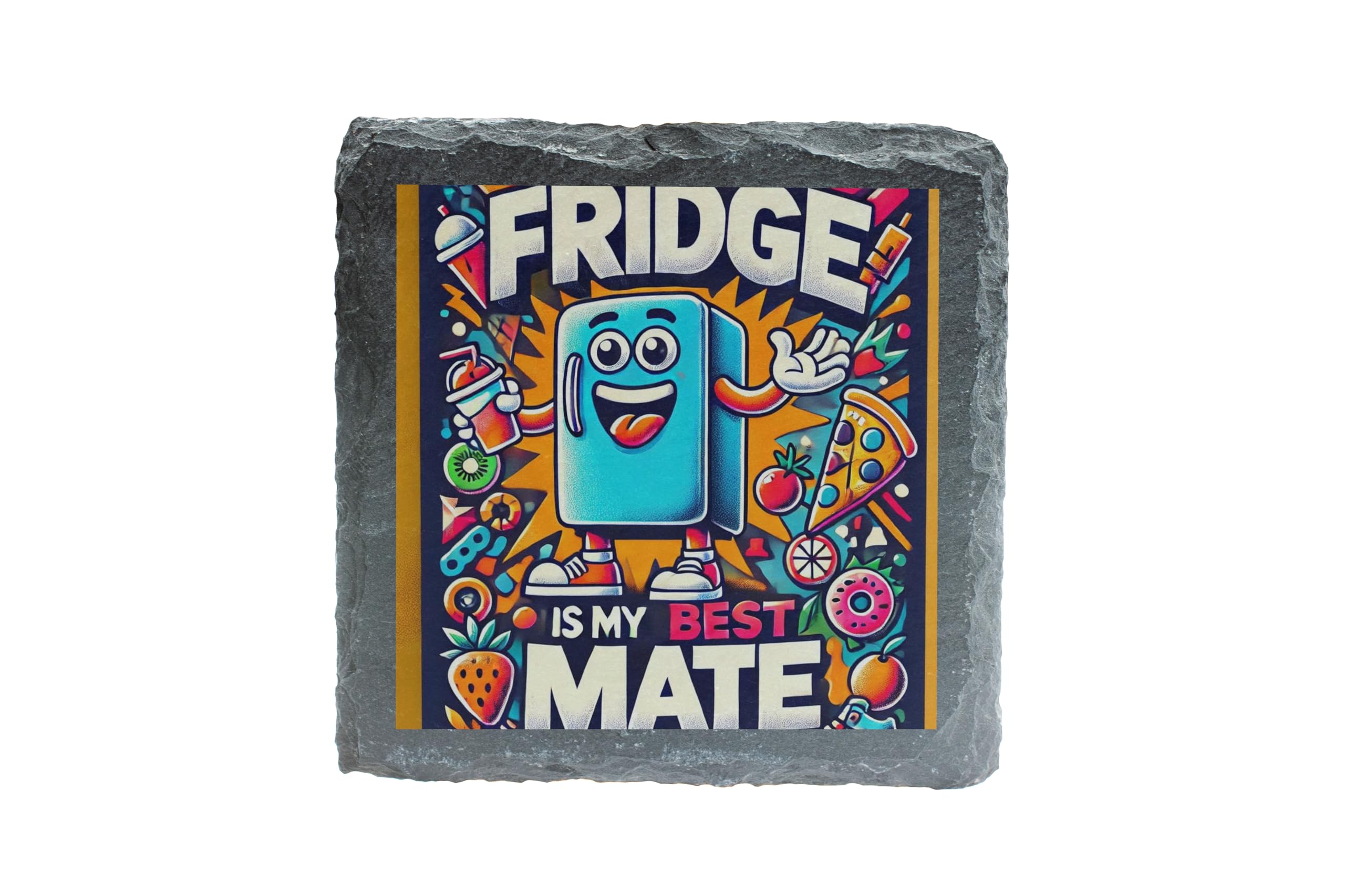 Add a dash of humor to your home with the "Fridge Is My Best Mate" slate coaster. This lively design features a cheerful fridge surrounded by colorful food illustrations, making it a standout accessory for any kitchen or dining area. Crafted from durable slate, this coaster not only looks great but also protects your surfaces from heat and spills. It's the perfect gift for foodies, humor enthusiasts, or anyone who loves unique and practical decor. Brighten up your space and keep it tidy with this eye-catching slate coaster!