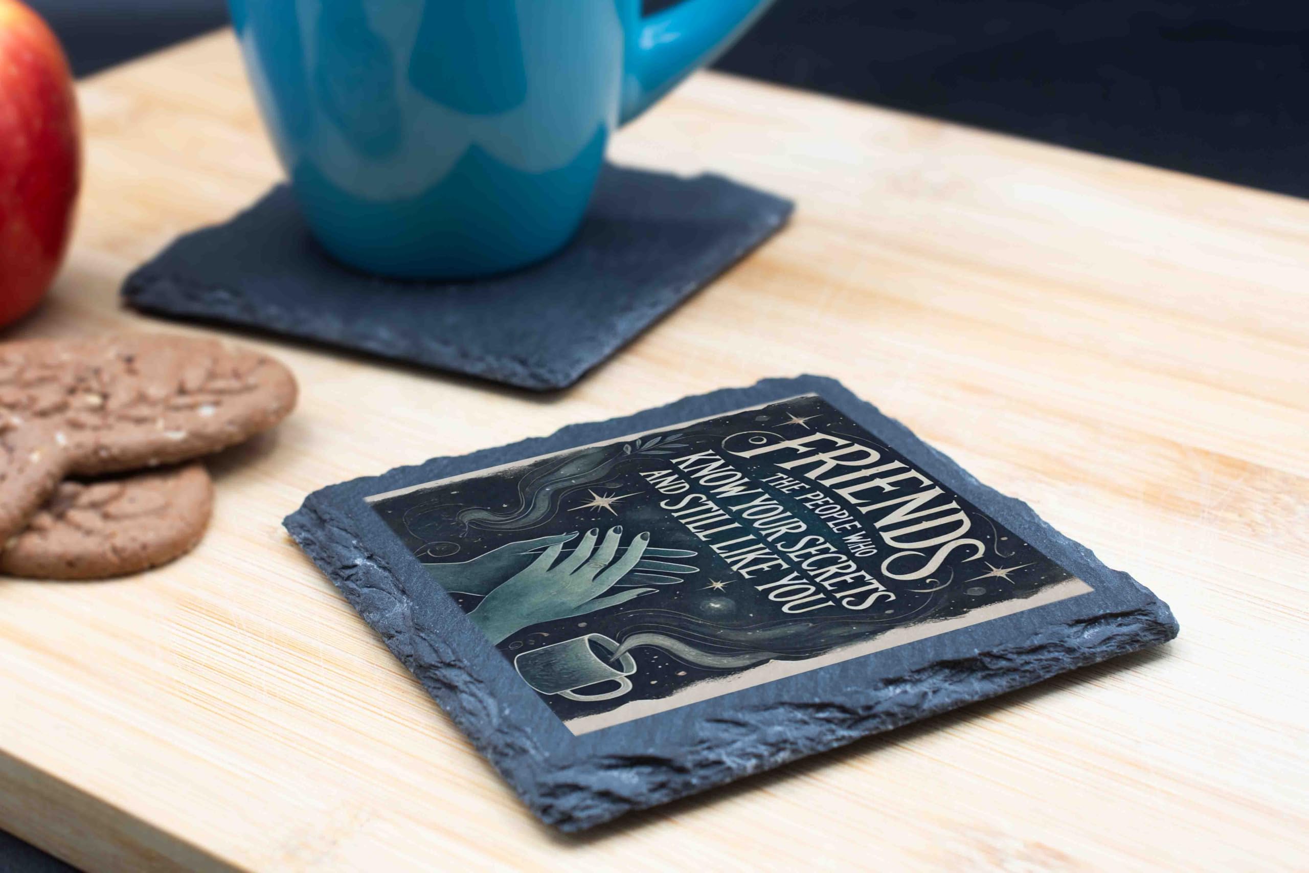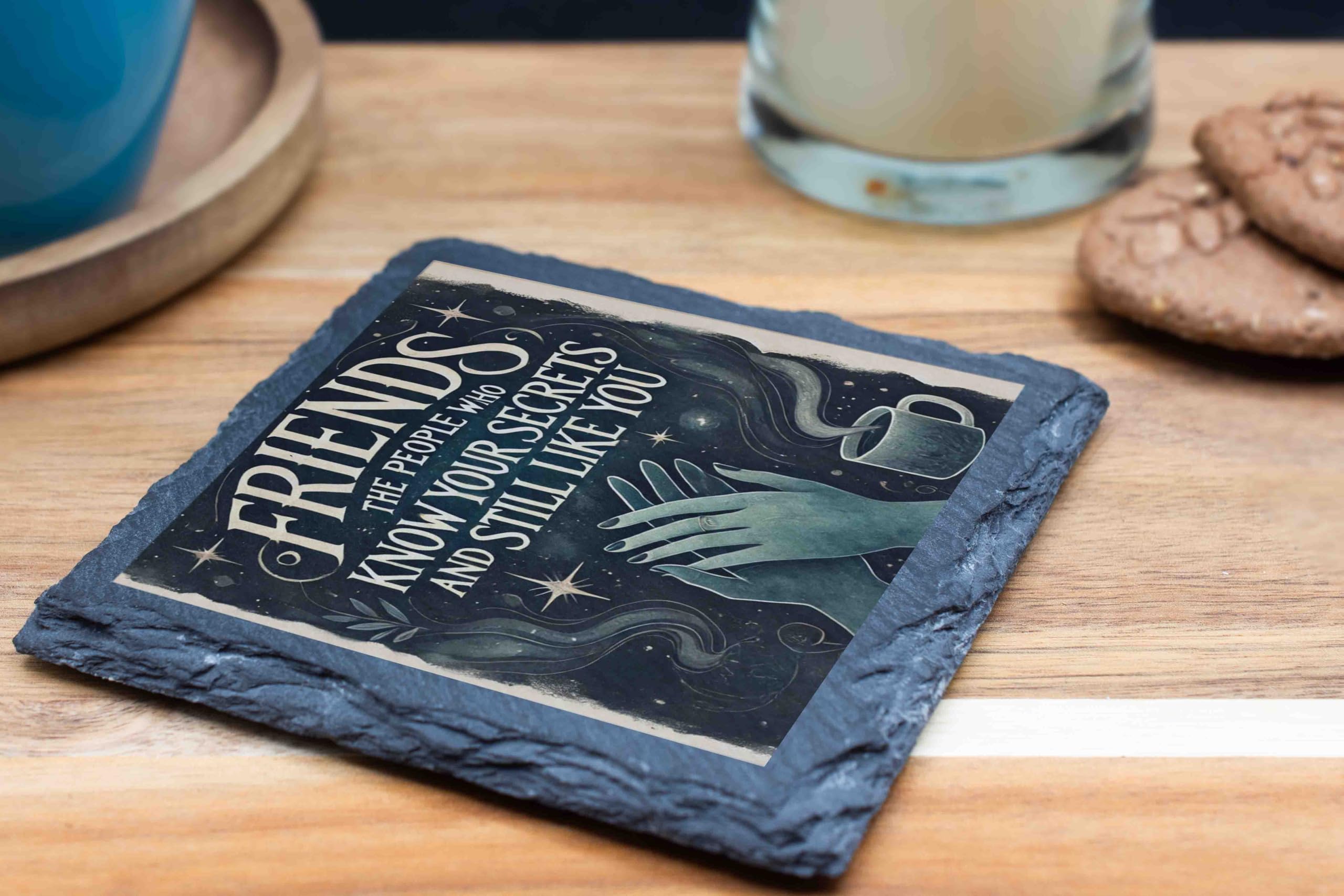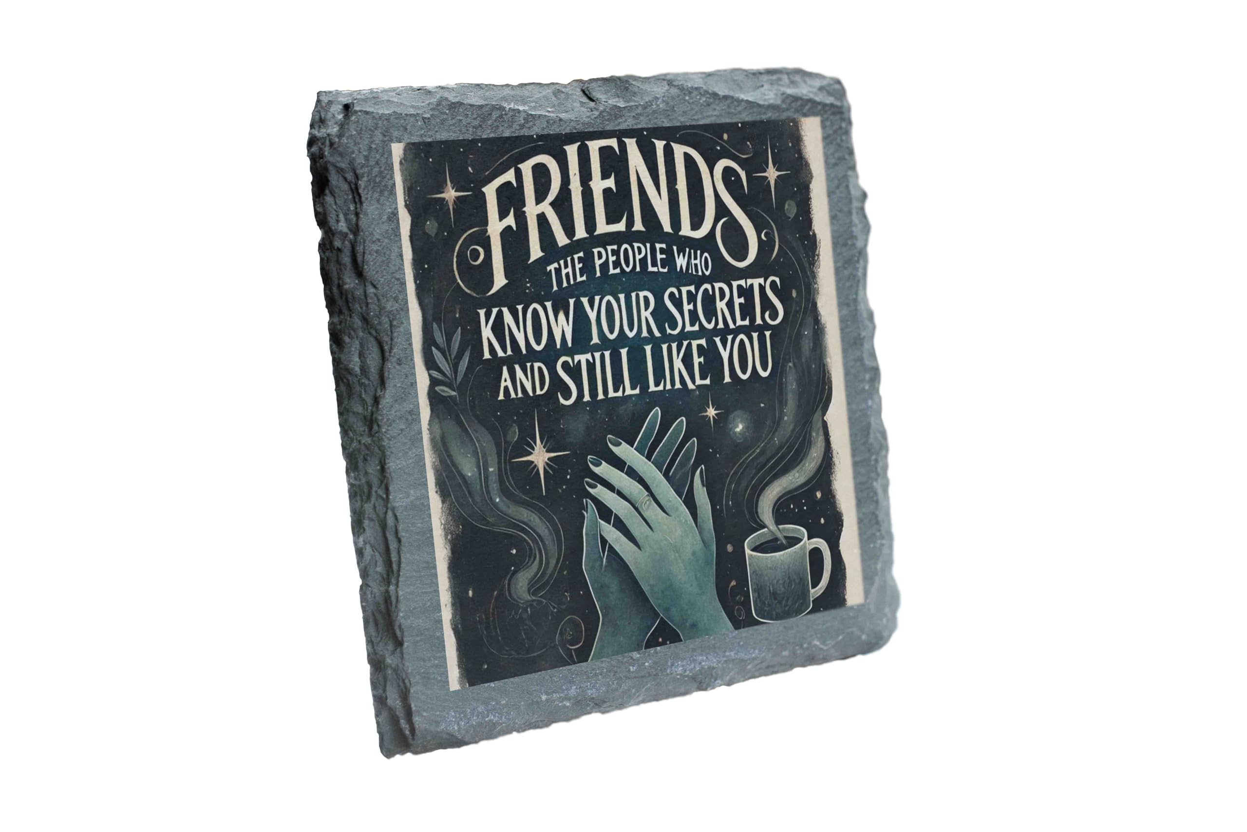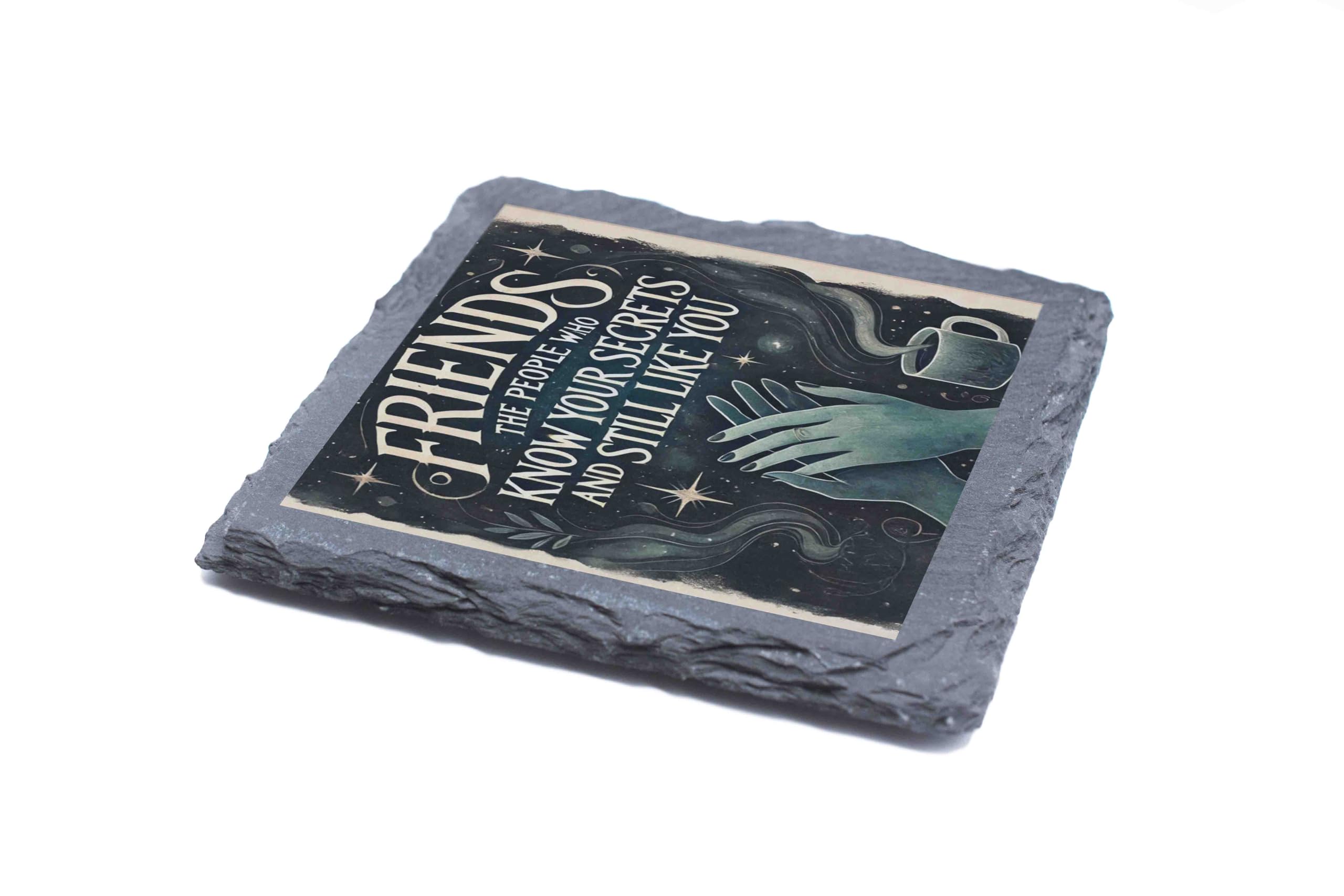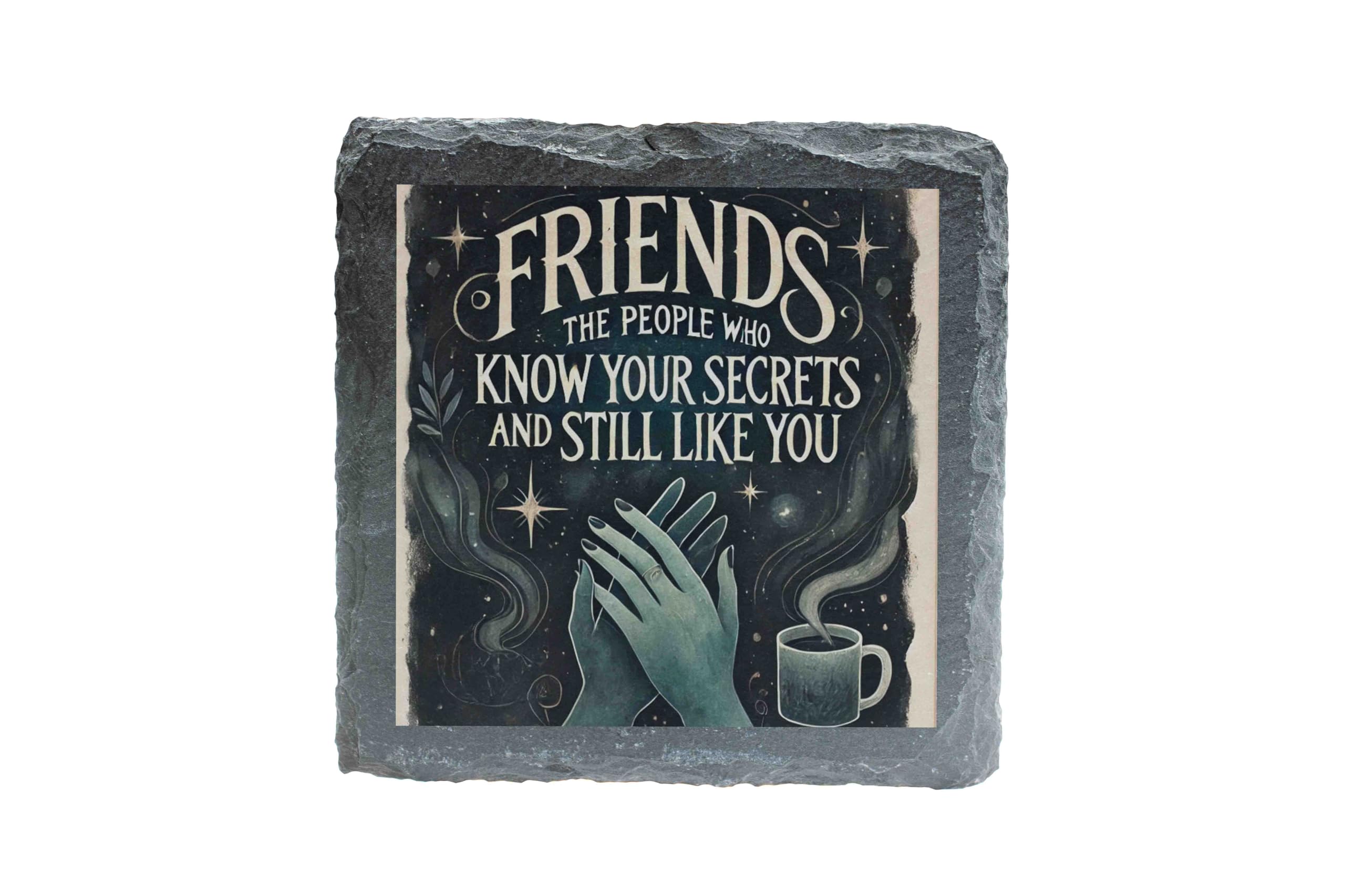 Celebrate the essence of true friendship with this beautifully crafted slate coaster. Showcasing the heartfelt message, "Friends: The people who know your secrets and still like you," this piece combines humor and sentiment, making it a perfect keepsake. The celestial design with its dreamy green hues and starry details adds an enchanting touch to any setting. Made from high-quality natural slate, this coaster is not just practical but also a decorative accent for your coffee table or desk. Whether as a token of appreciation for a cherished friend or a stylish addition to your home, this coaster is sure to bring smiles and warm memories.