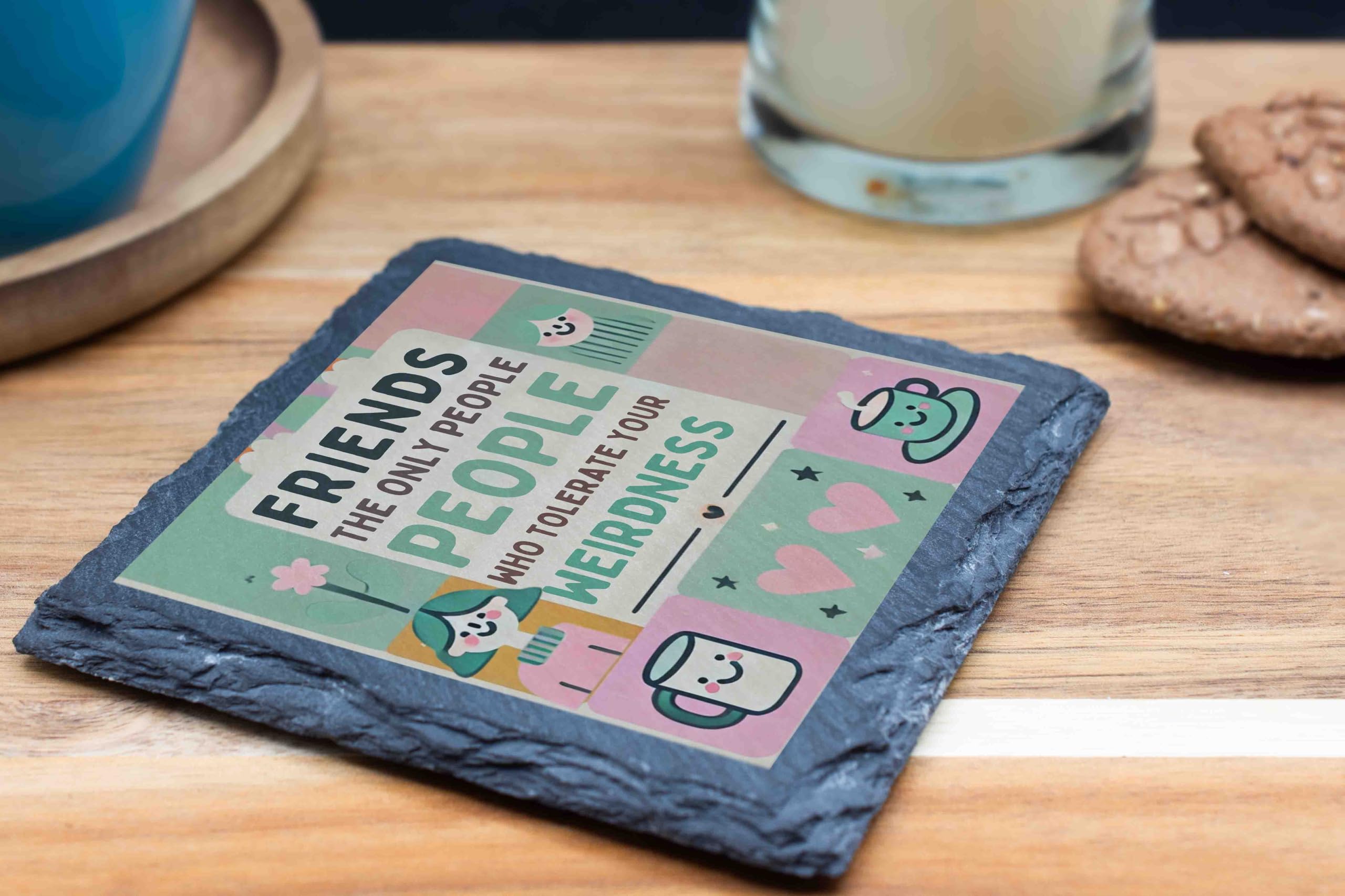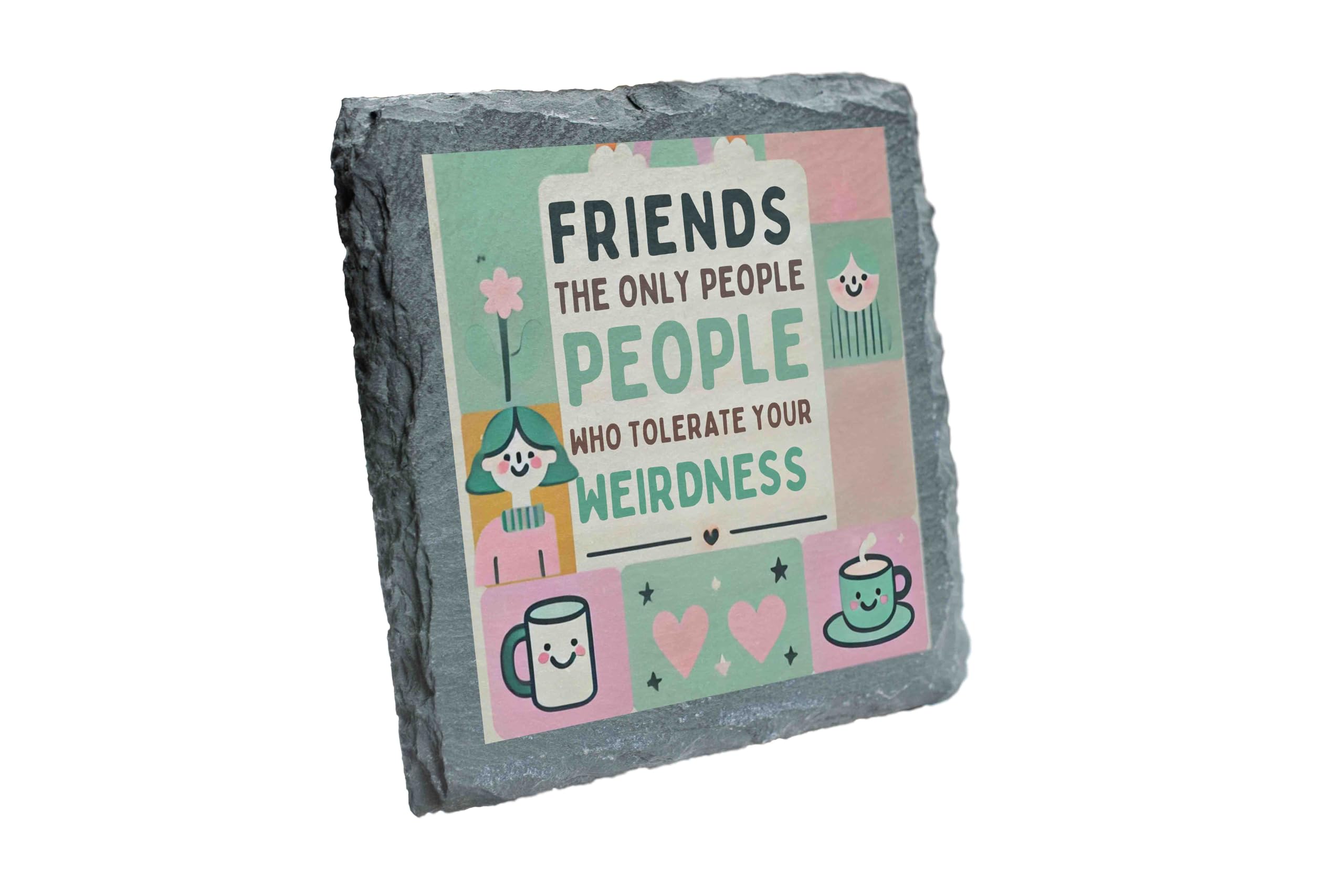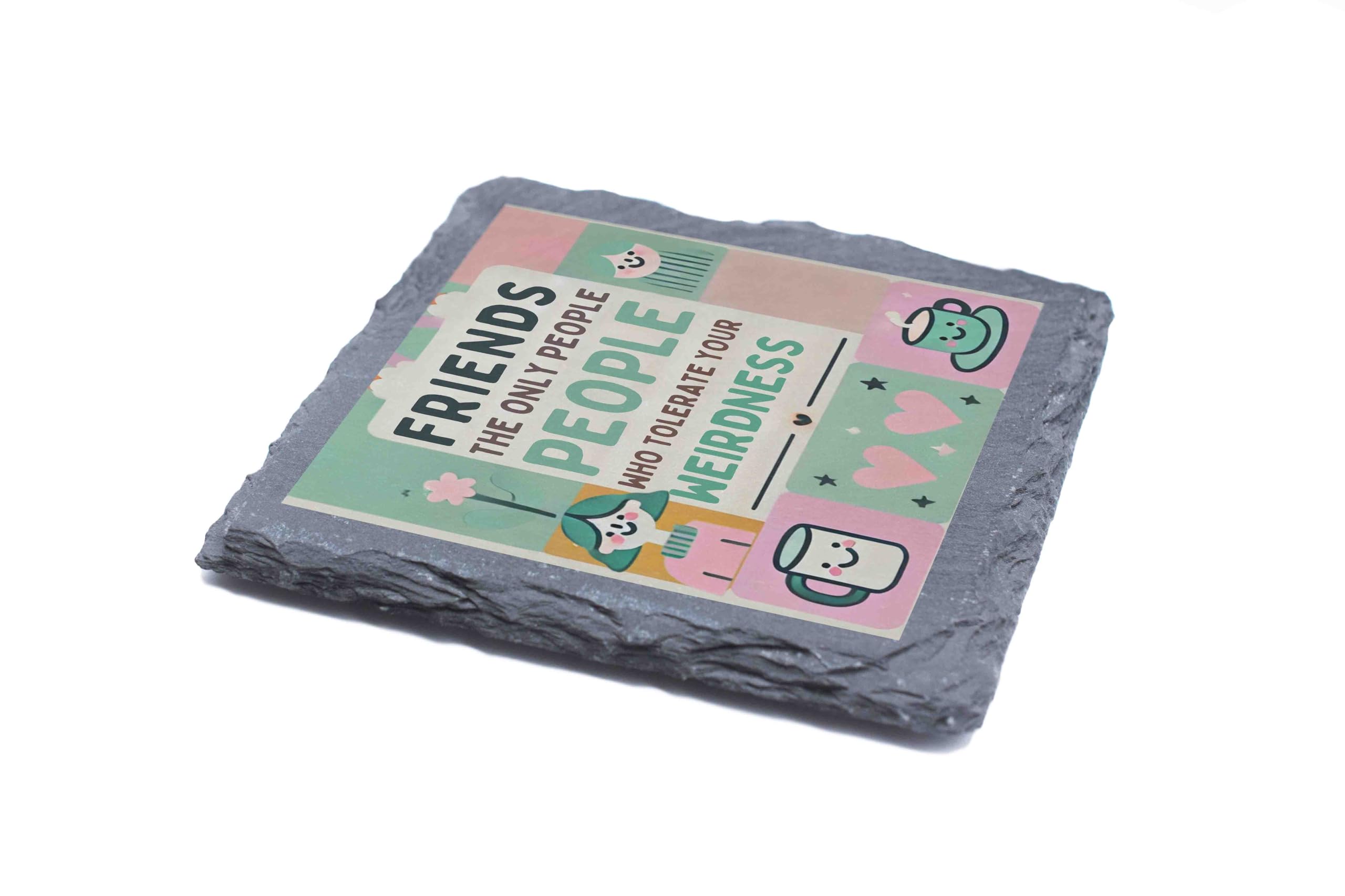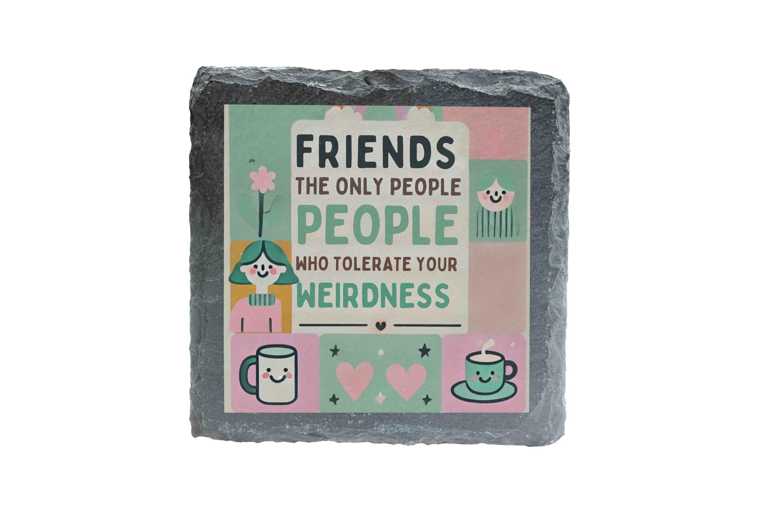 Celebrate the beauty of friendship with this delightful slate coaster! The charming design combines a playful quote, "Friends: The Only People Who Tolerate Your Weirdness," with whimsical artwork in soft pastel tones. Made from high-quality natural slate, this coaster is a perfect blend of functionality and fun. Designed to protect your surfaces from heat and scratches, it comes with a soft backing for added care. This coaster is not only a practical accessory but also a wonderful conversation starter. Ideal as a gift for your best friend, sibling, or anyone who embraces their quirks, it's a little token of love and laughter to brighten up any space!