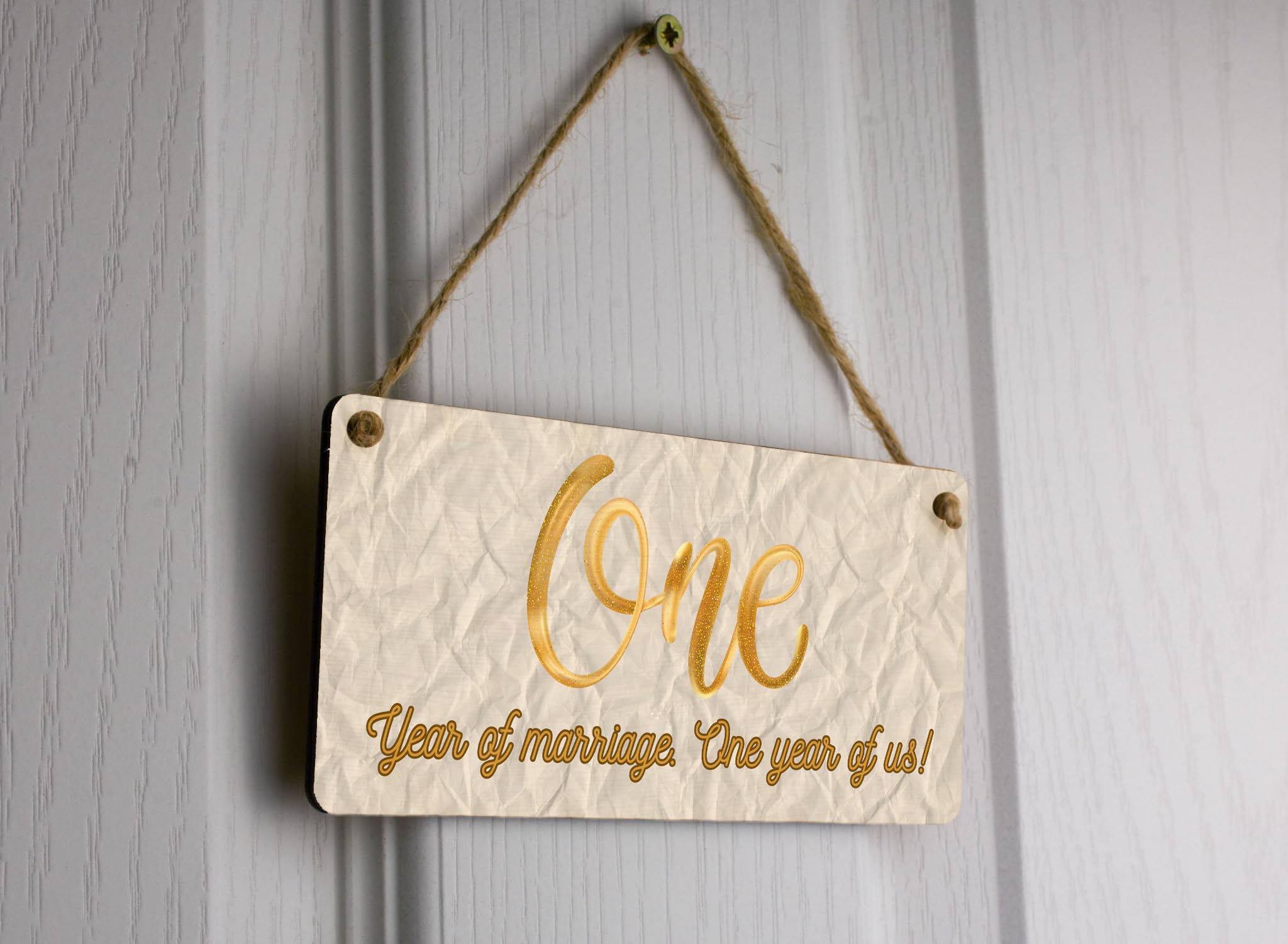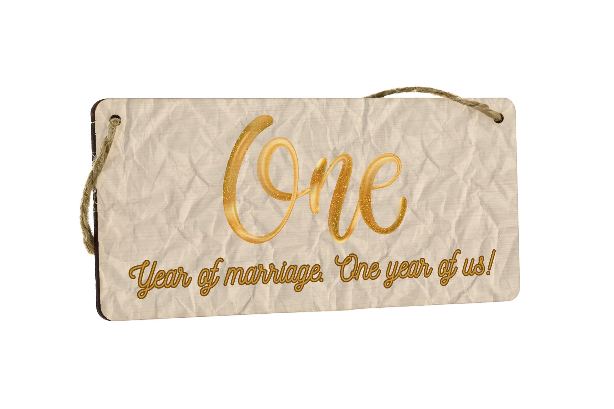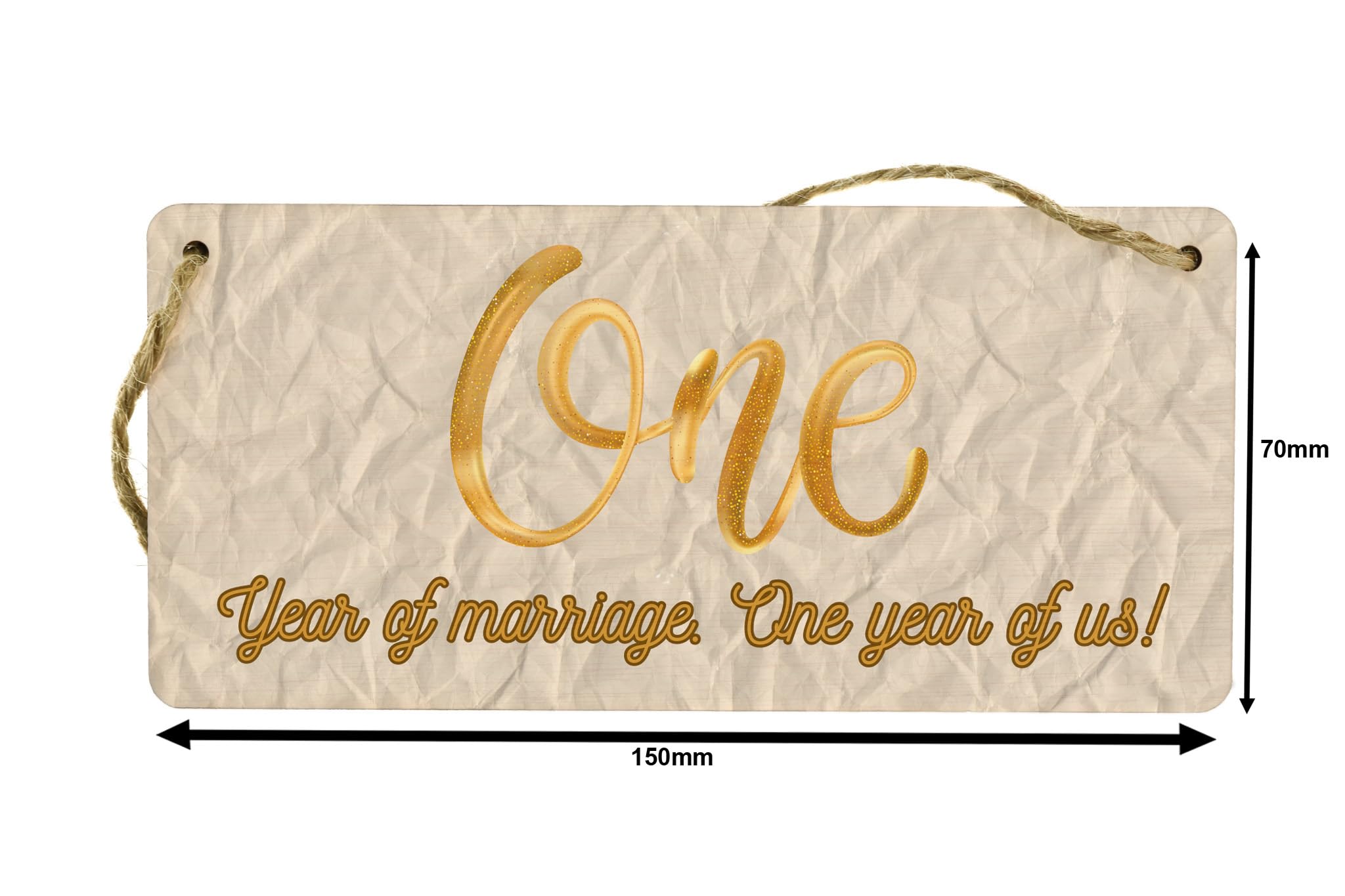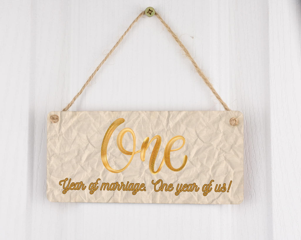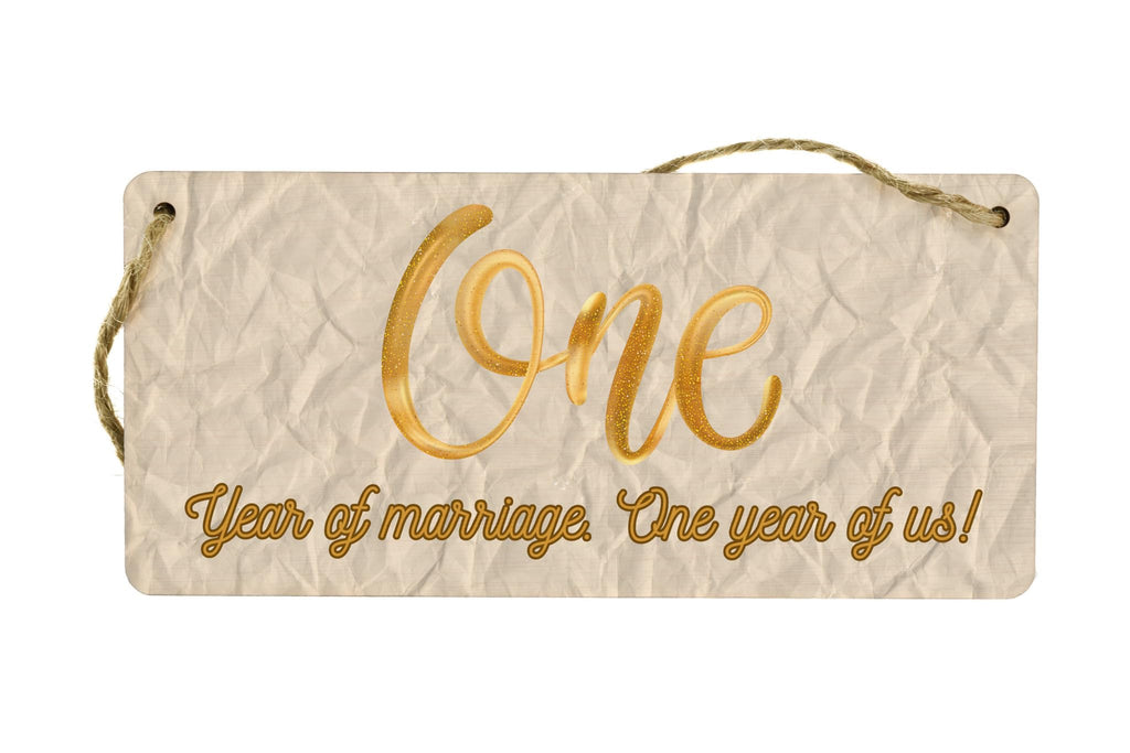 Add a touch of charm to your home decor with this beautiful Full Colour Plywood Hanging Sign. Designed specifically for first anniversary celebrations, this sign reads 'One Year of Marriage, One Year of Us' - a perfect sentiment for celebrating the milestone of your first year of marriage. Made from quality plywood, this hanging sign features vibrant colours that will brighten up any space in your home. Whether you hang it in your living room, bedroom, or even in your backyard, this sign is sure to be a conversation starter and a cherished reminder of your special first anniversary. Celebrate your paper wedding anniversary in style with this unique and meaningful home decor piece.