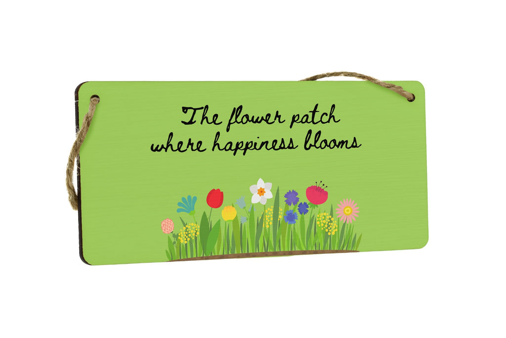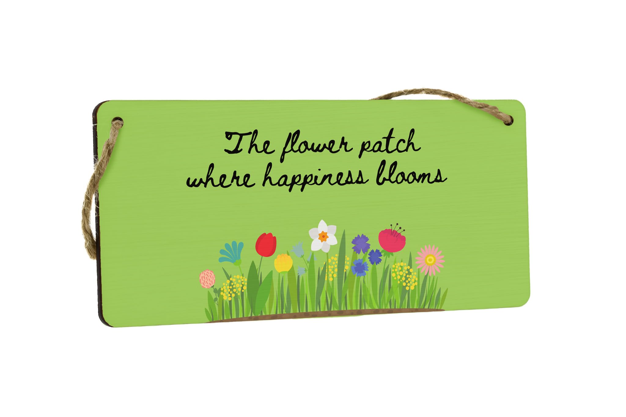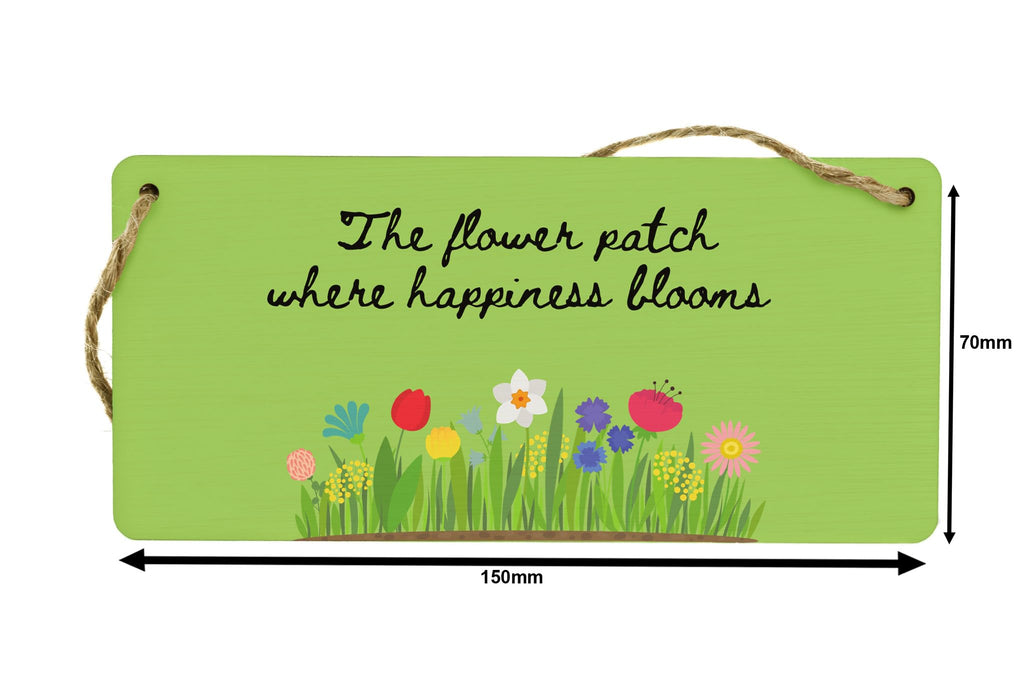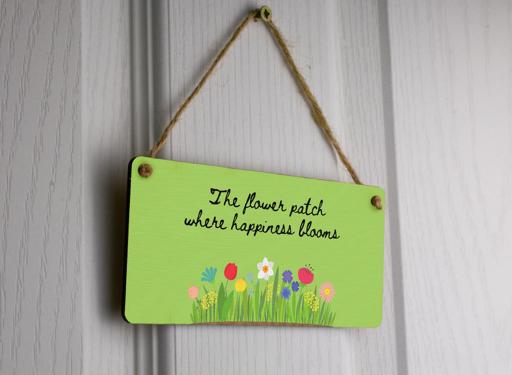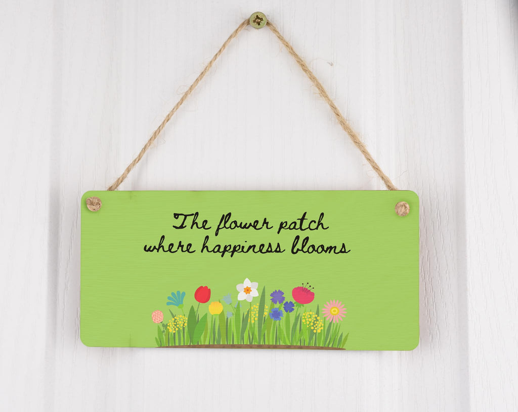 Full Colour Plywood Hanging Sign: Reads 'The Flower Patch Where Happiness Blooms' - Perfect Garden Sign and Home Decor Ideas for Her or Any Gardener!