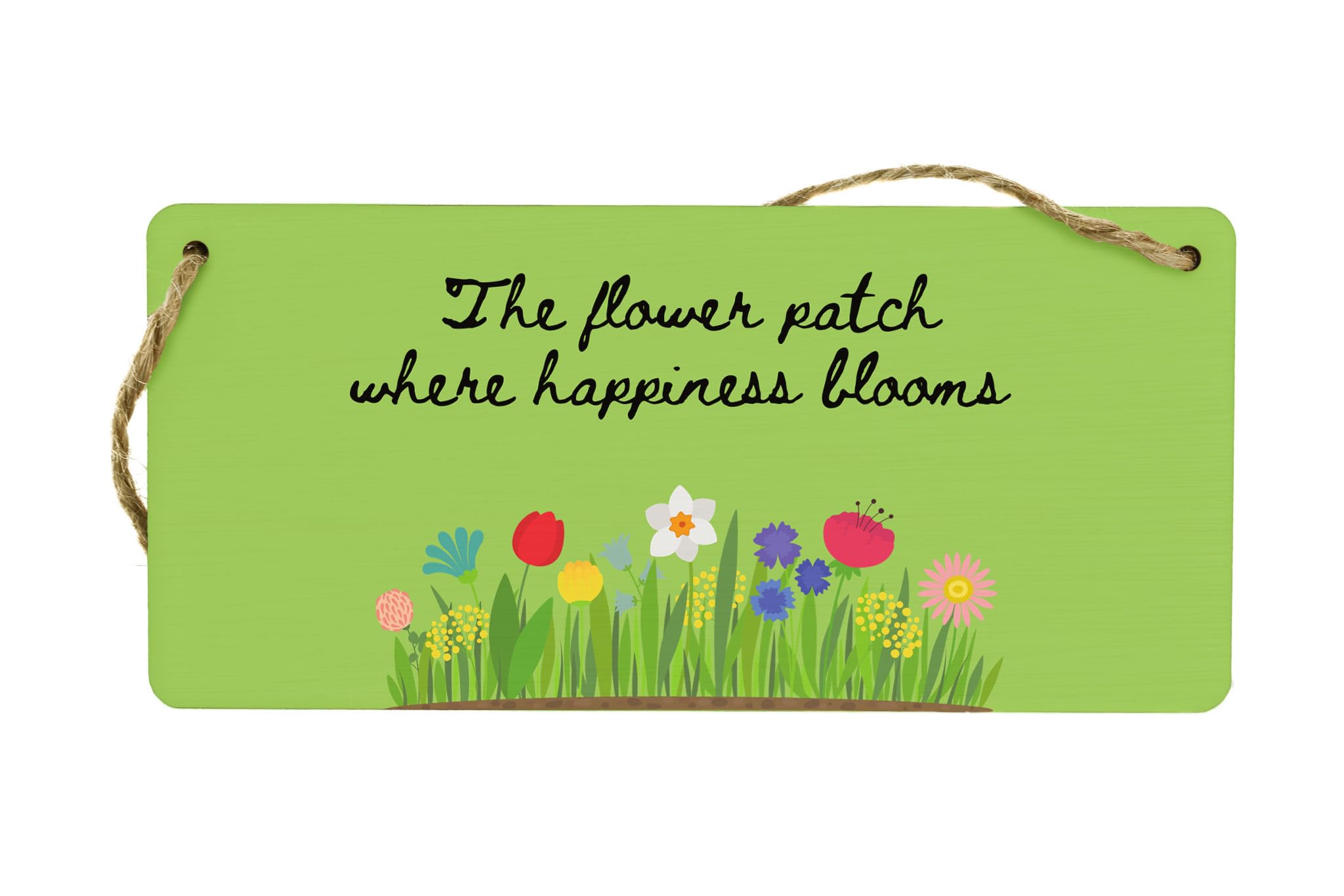 • Features a cheerful message 'The Flower Patch Where Happiness Blooms'