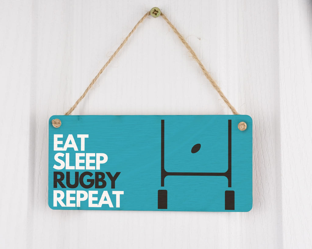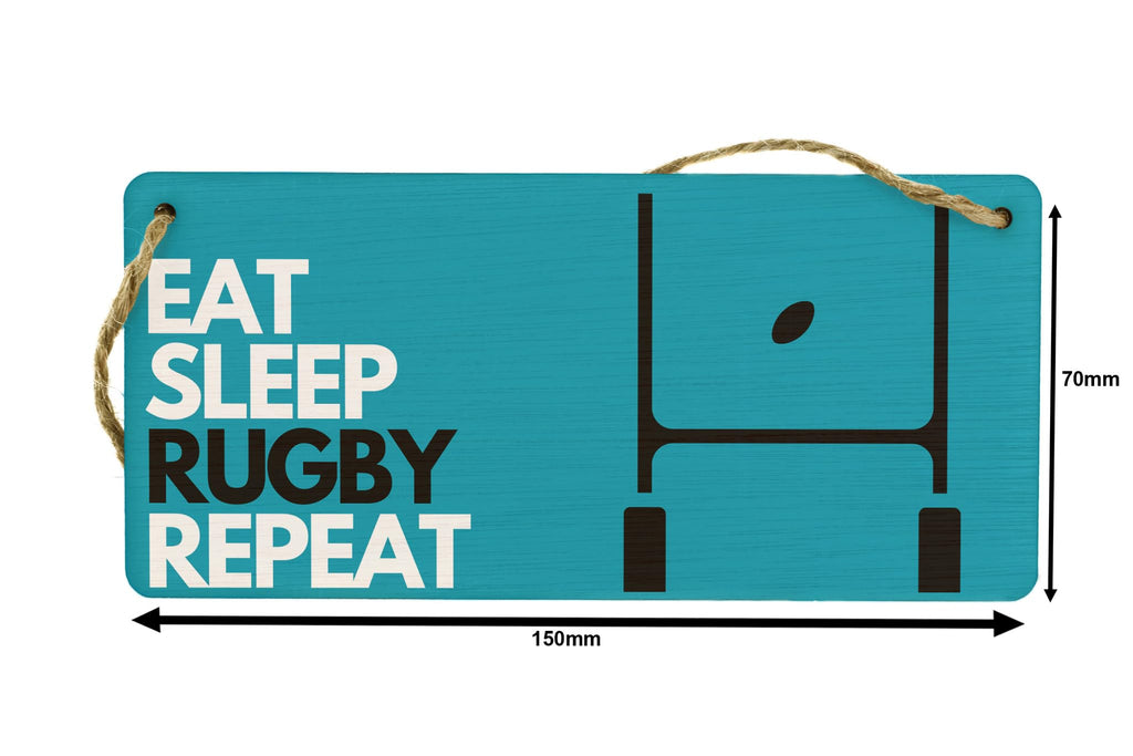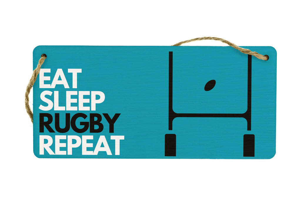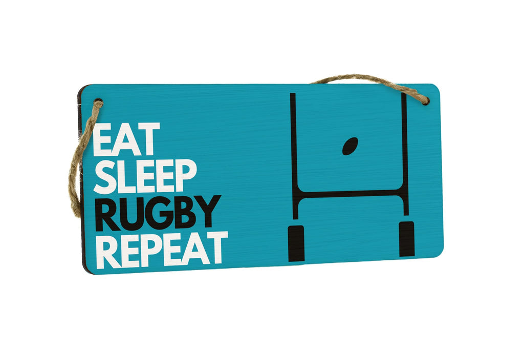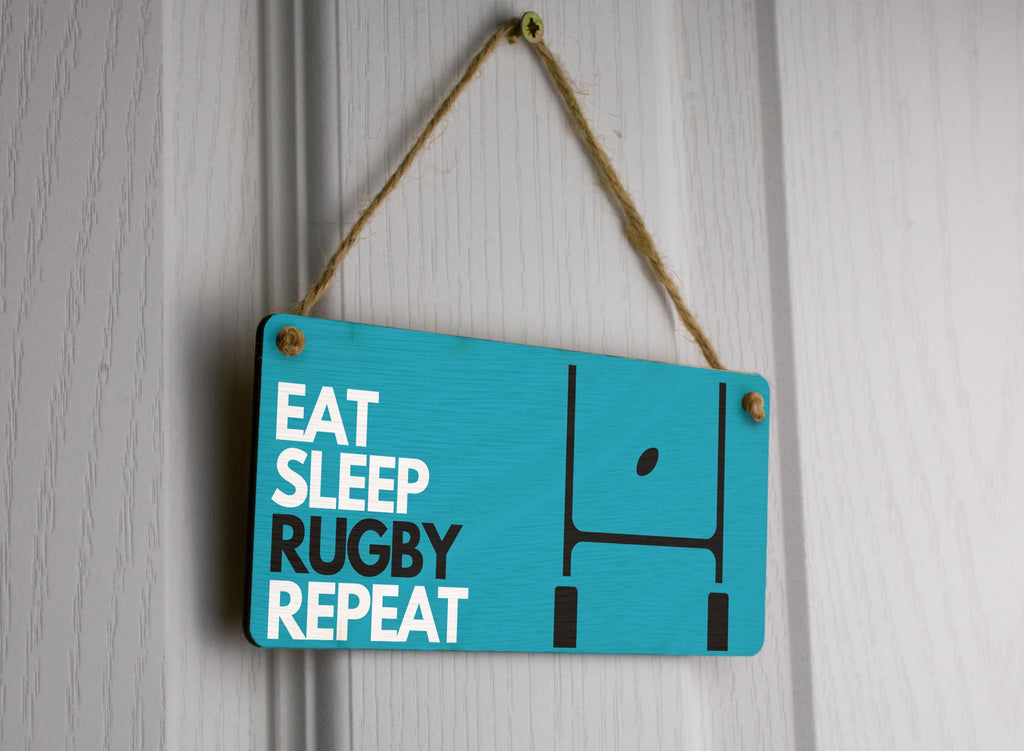 Enhance the atmosphere in your rugby-lover's room or gym with this Full Colour Rugby Hanging Sign. Made from quality plywood, this rugby sign is durable and long-lasting. Its vibrant colours and motivational message 'Eat Sleep Rugby Repeat' will inspire and energize any rugby enthusiast. Hang this rugby room decor on a wall or door to instantly transform your space into a sports-themed haven. Whether you're decorating your home, office, or workout area, this plywood rugby hanging sign is the perfect addition to your sports decor collection.