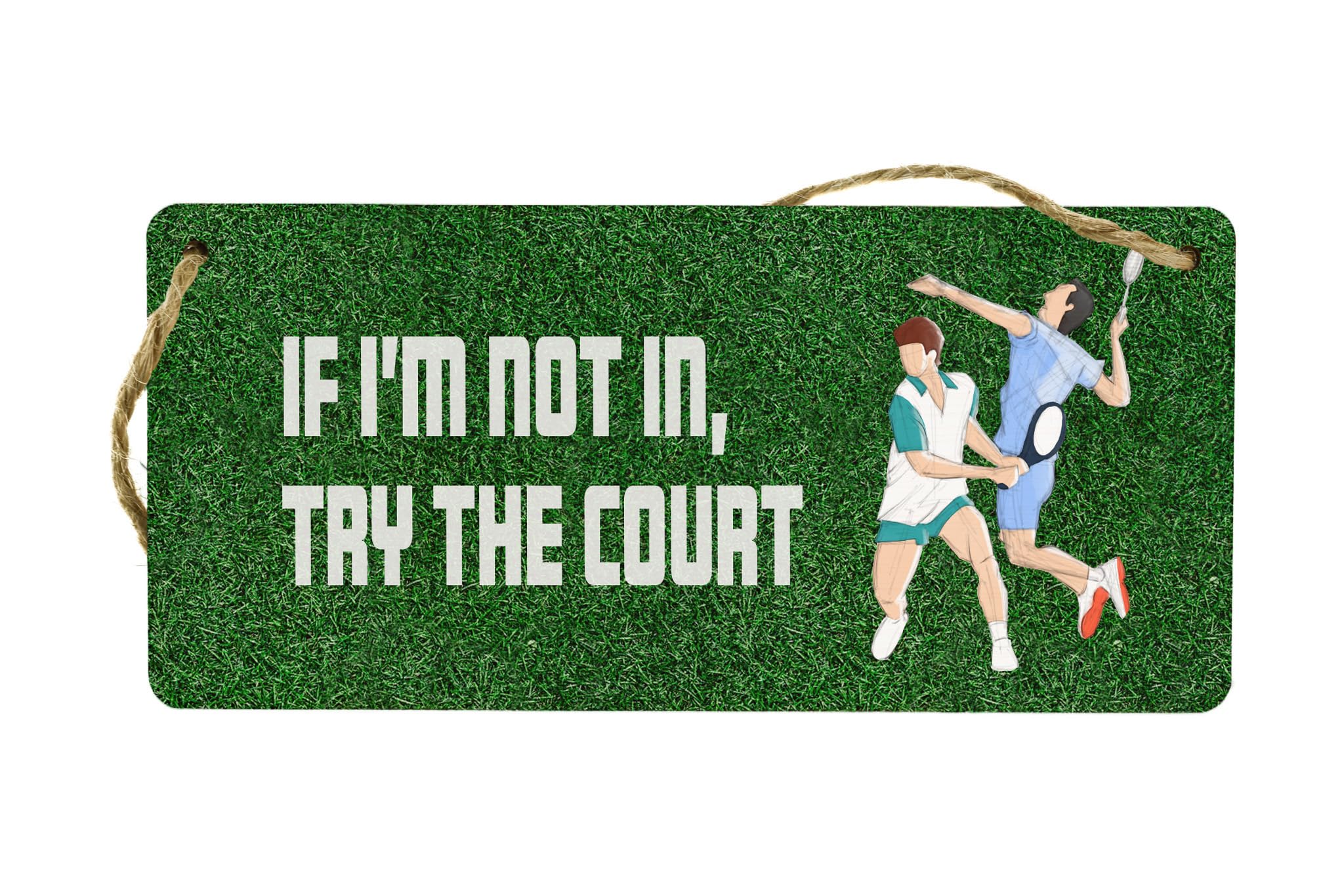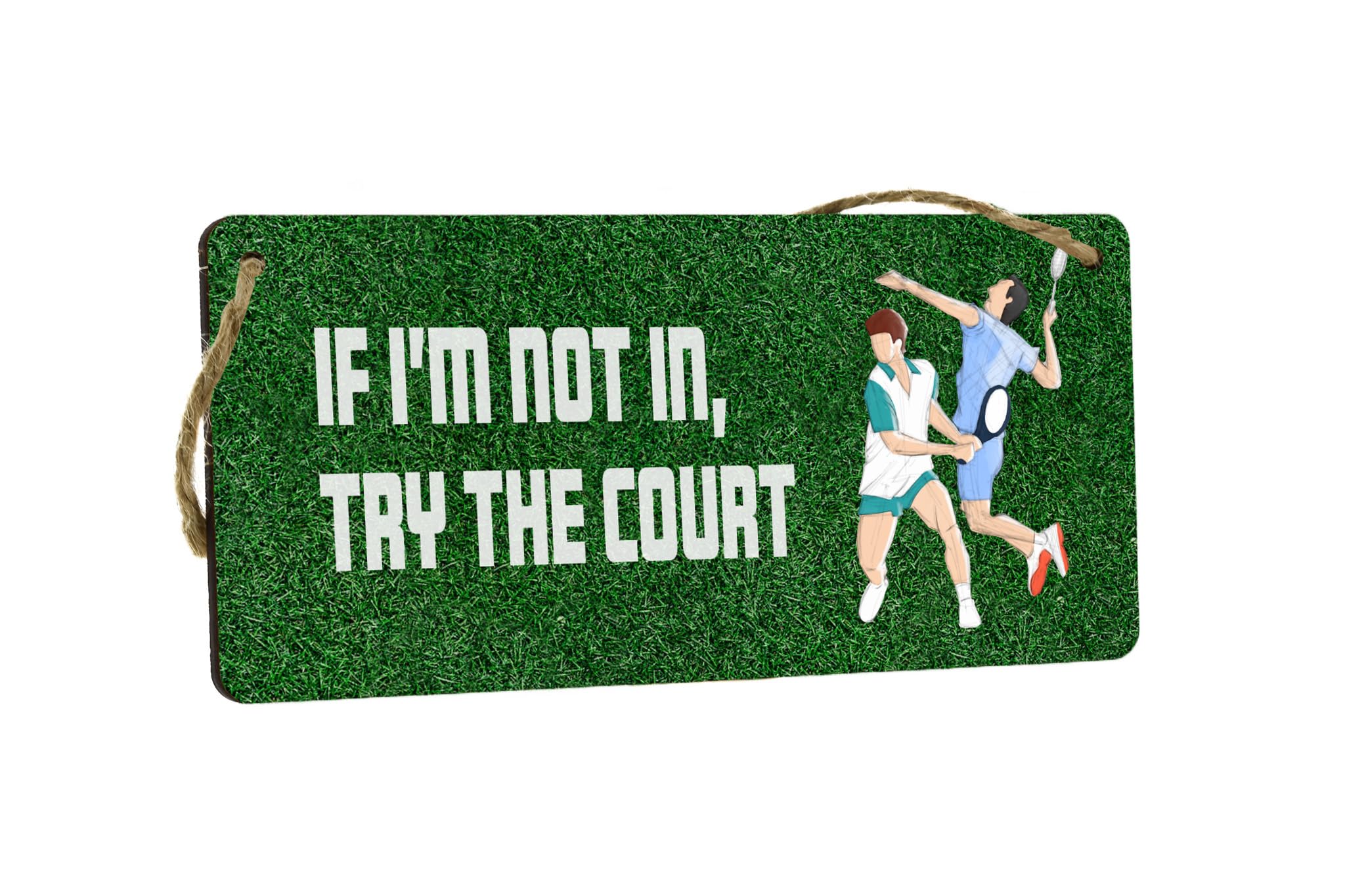 Add a touch of humor to your office or home decor with this full-color wooden plywood sign. Designed especially for tennis lovers, this hanging sign reads 'If I'm Not in, Try the Court'. Made from high-quality plywood, this sign features vibrant colors that are sure to catch the eye. Whether you're a tennis enthusiast or just looking for a funny wall sign, this sign is perfect for you. It can be easily hung on any wall in your home or office, making it a great addition to your tennis-themed decor or a unique gift for a tennis lover. Get this funny and charming tennis sign today and bring some joy to your space.