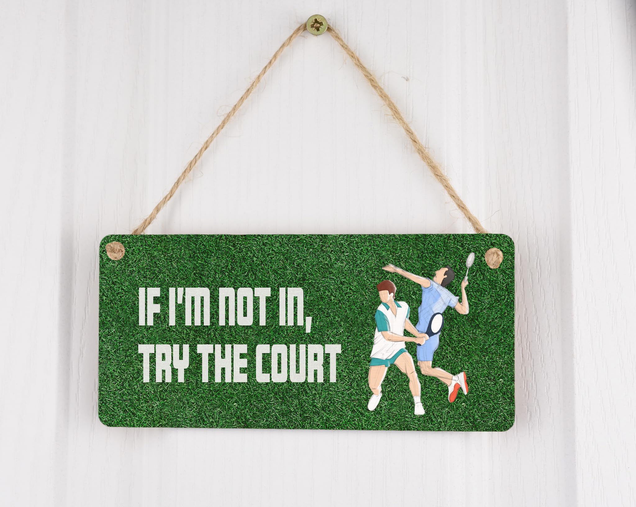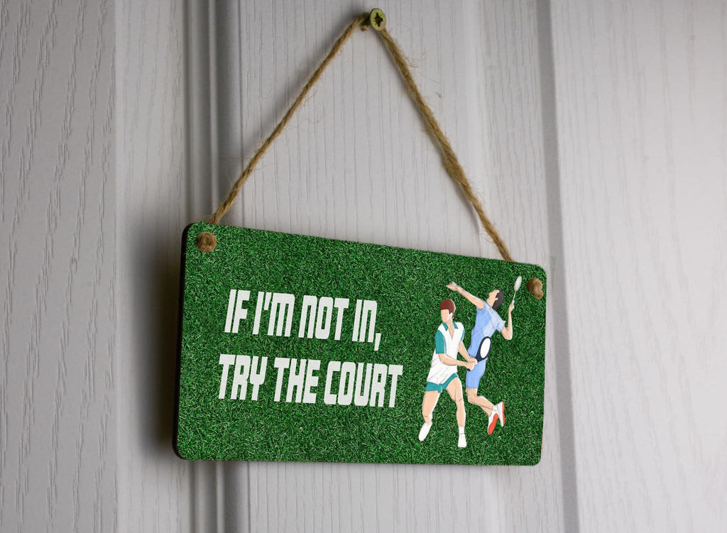 Full Colour Wooden Plywood Sign: Funny Tennis Lover Hanging Sign for Office and Home Decor - Reads 'If I'm Not in, Try the Court'