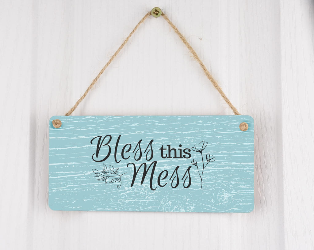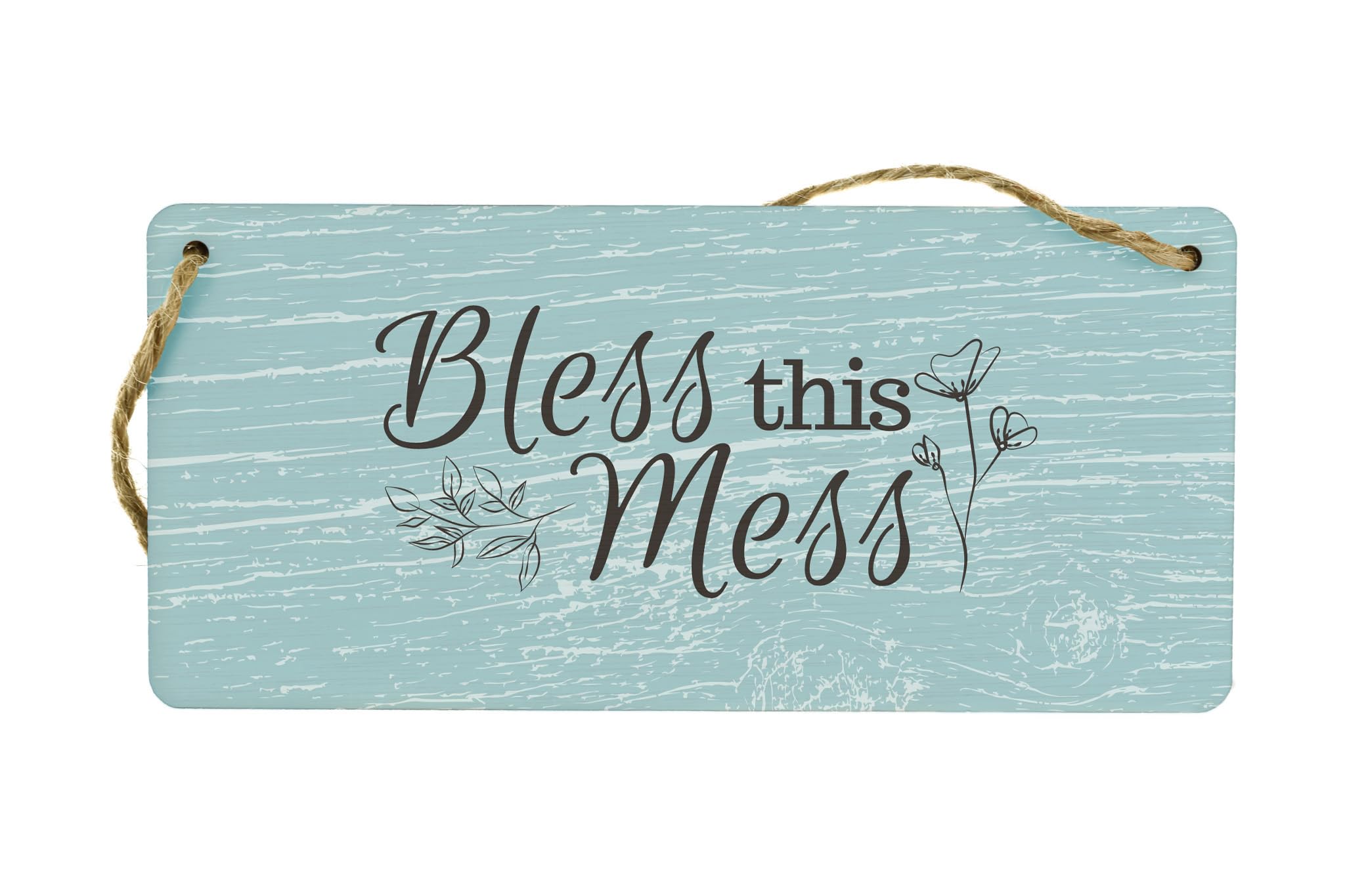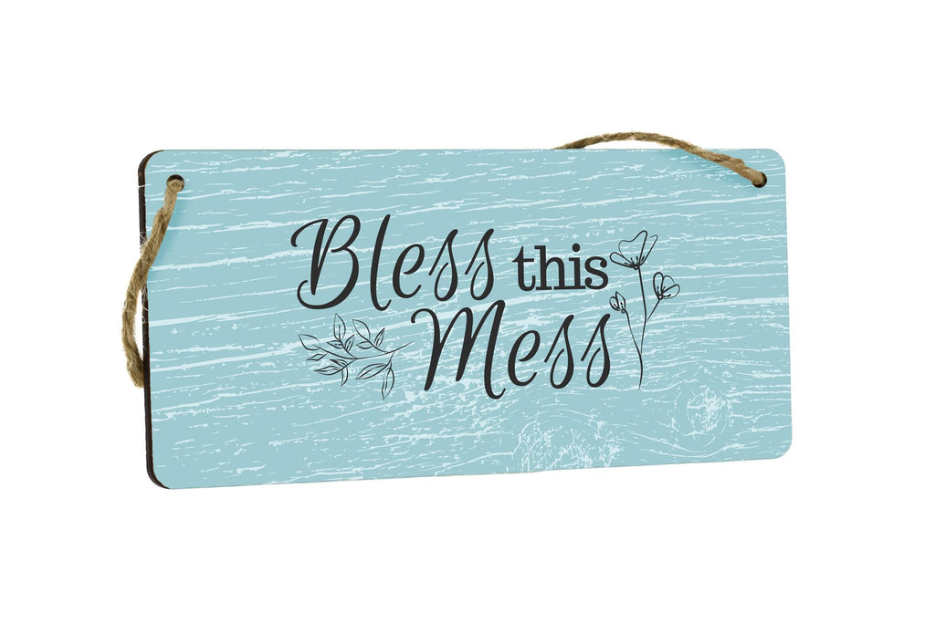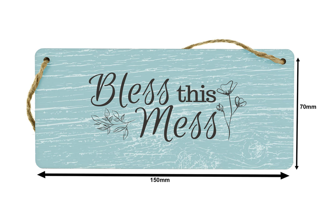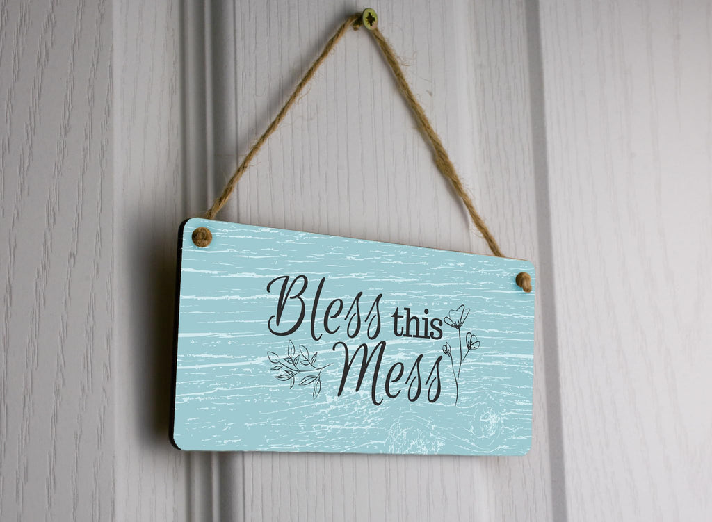 Brighten up your home with this fun and modern 'Bless This Mess' plywood hanging sign. Made from high-quality plywood, this sign features a beautiful blue modern design that will add a pop of color to any room. The sign comes with a sturdy rope for easy hanging. The perfect gift for mum or a friend who loves to add a touch of fun to their home decor. Whether you have a messy house or just want to embrace the chaos, this sign is a playful reminder to appreciate the imperfect moments in life. Bring a smile to your face every time you pass by this unique and affordable home sign.