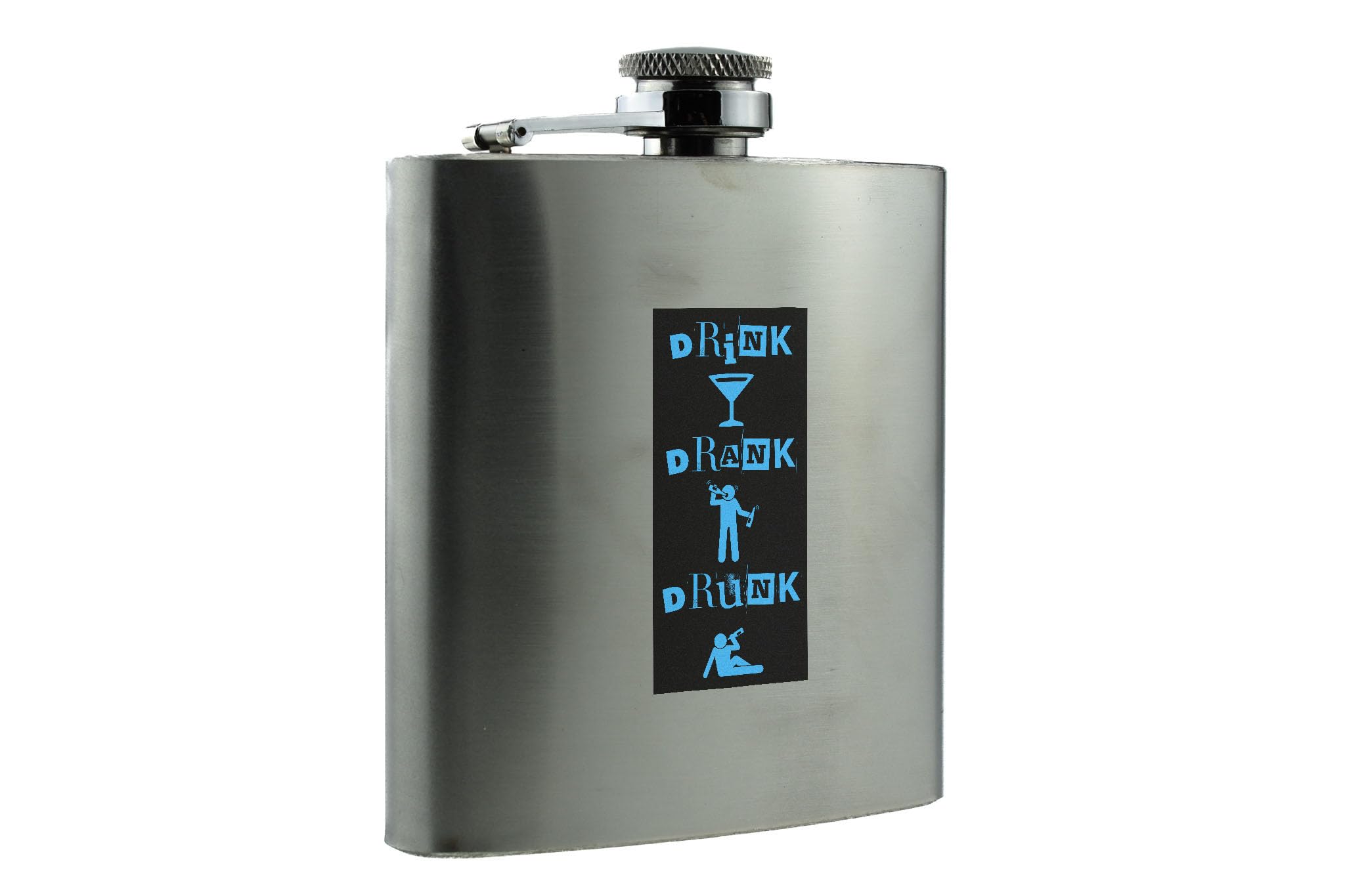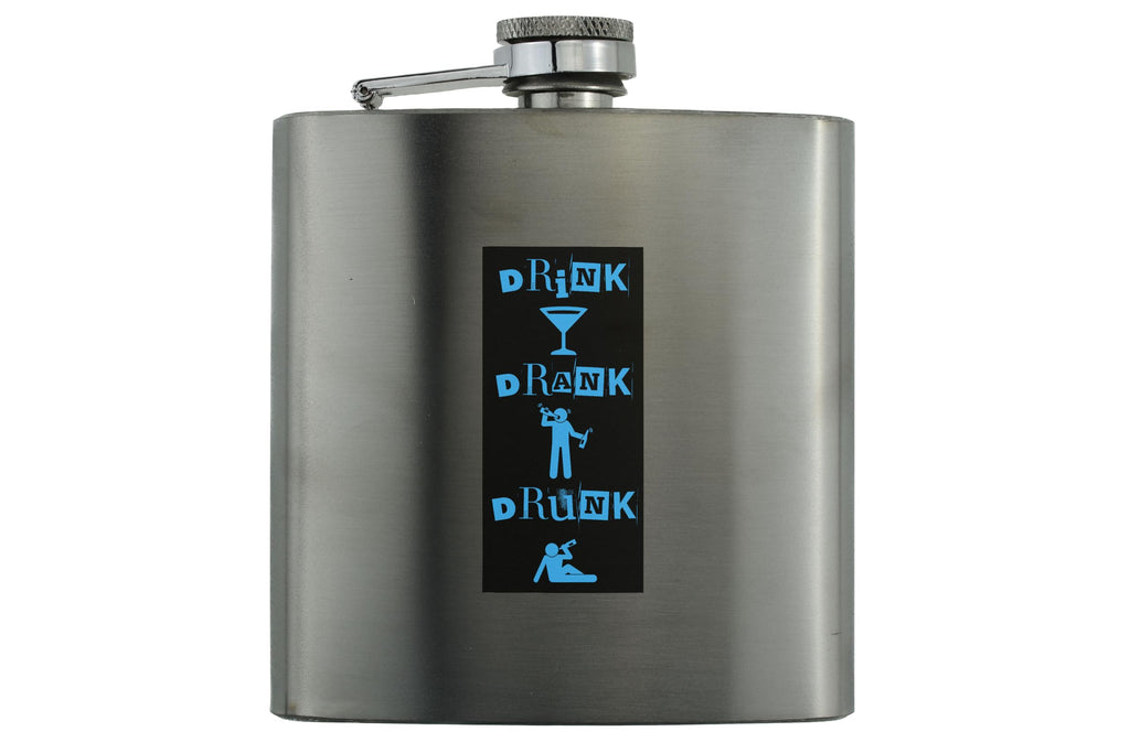 • Stainless steel flask with a fun 'drink drank drunk' UV printed design in blue and black colours