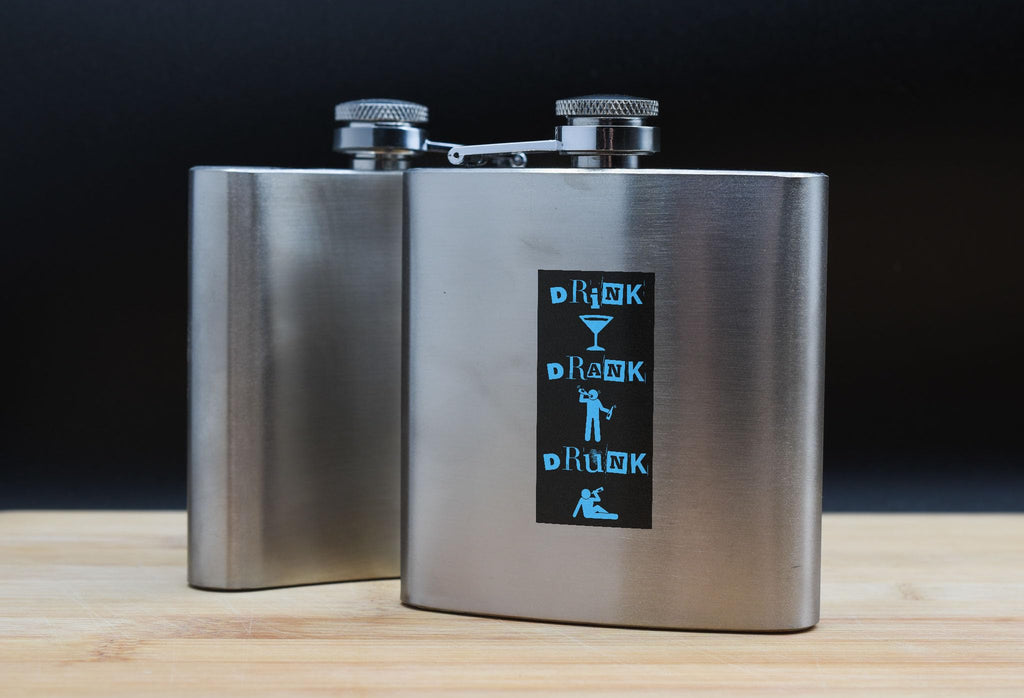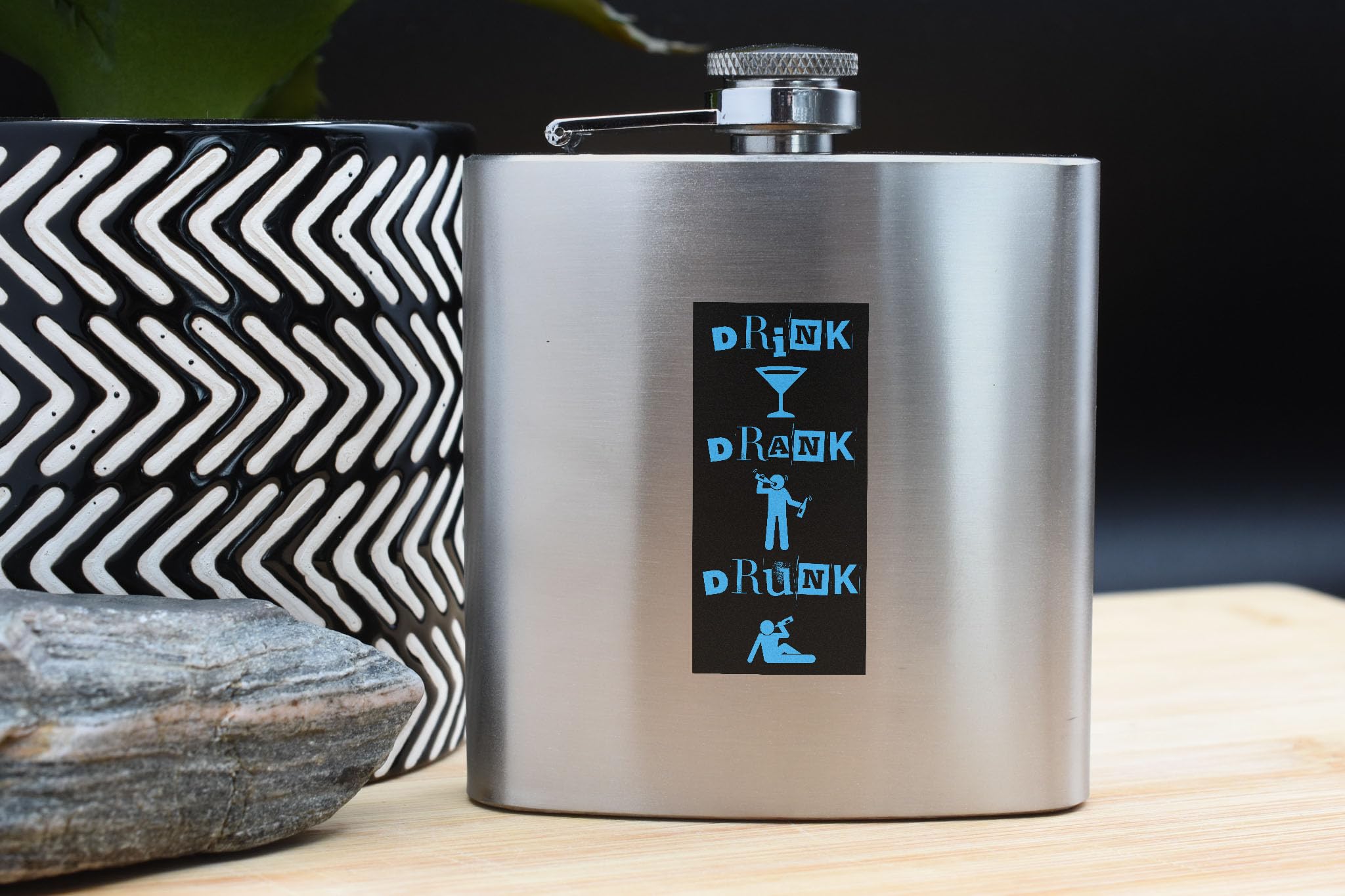 Introducing our Fun Drink Drank Drunk Stainless Steel Flask - Blue and Black Design! This party flask is perfect for anyone who enjoys a good laugh while sipping on their favourite beverage. Made of quality stainless steel, this flask features a lighthearted design in blue and black colours that will surely bring a smile to your face. Whether you're heading to a celebration, game night, or just enjoying a casual drink, this novelty flask is a must-have bar accessory. It also makes a great gift for bachelor parties or anyone who appreciates a good alcohol joke. The UV printed 'drink drank drunk' design adds a touch of humour to your drinking stages. Get your hands on this full-colour printed flask today and elevate your drinking experience!