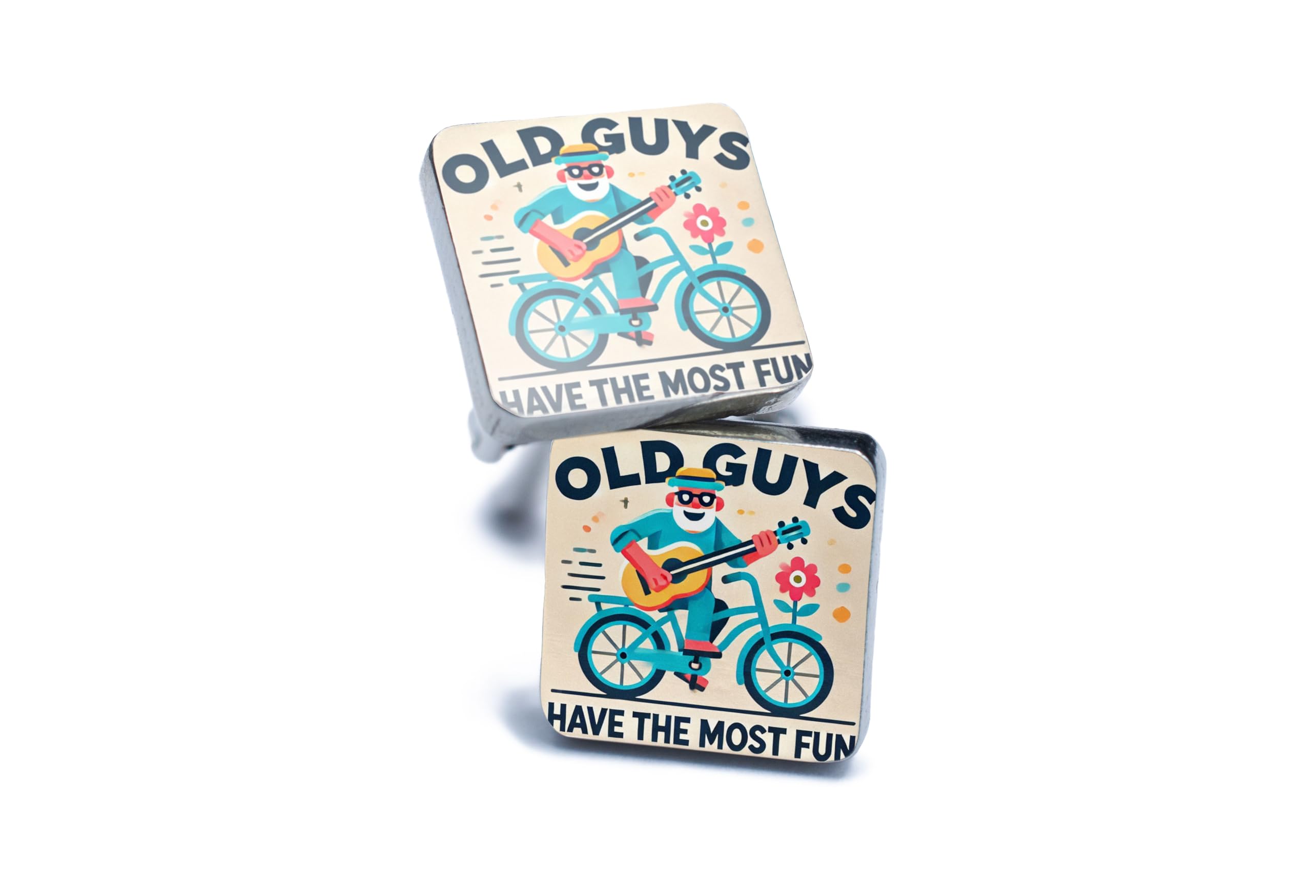 Celebrate the joy of life with these charming ?Old Guys Have the Most Fun? Cufflinks. Featuring a delightful and humorous design of a guitar-playing cyclist, these cufflinks are perfect for men who live life to the fullest and always find time for fun. Made from durable materials with a polished finish, these cufflinks combine style and humor to create a standout accessory for any occasion. Whether for a family gathering, party, or day at the office, they add a playful touch to any outfit. Looking for the perfect gift? These cufflinks are an excellent choice for dads, grandfathers, or friends who bring laughter and light to your life. Show them how much you appreciate their spirit with this unique and fun accessory!