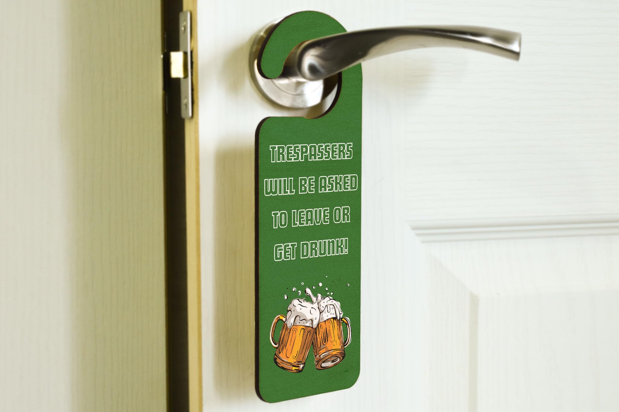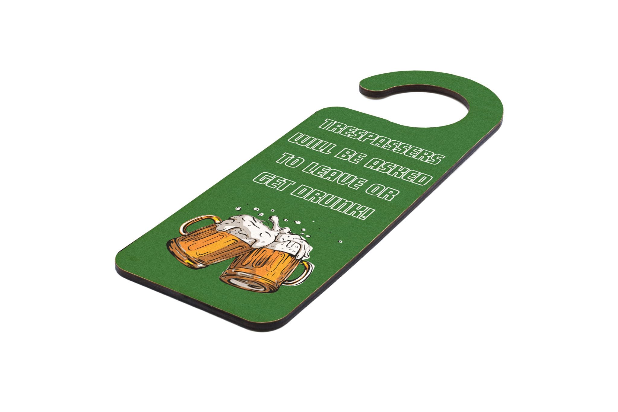 - Handcrafted laser-cut plywood door hanger with a funny beer mug design