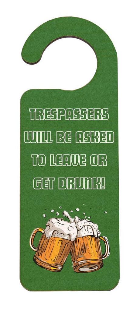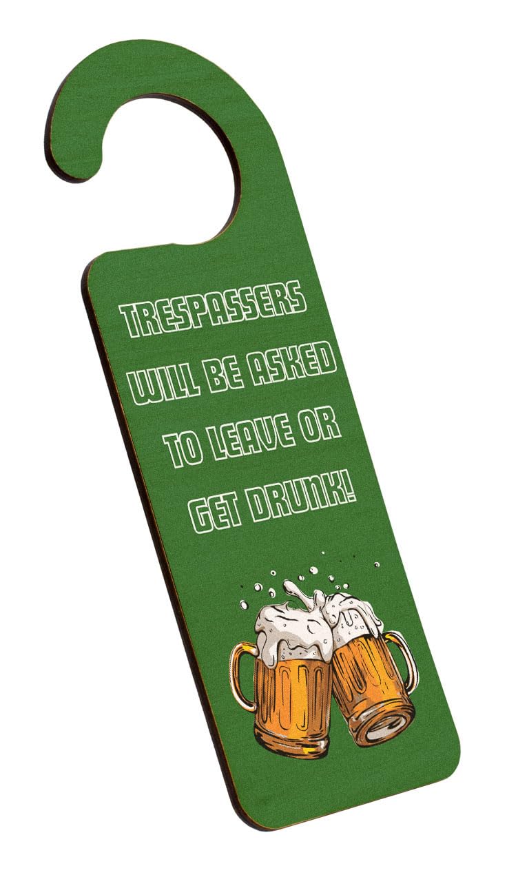 Add a touch of humour to your man cave or party zone with this Funny Beer Mug Man Cave Do Not Enter Private Area Green Door Hanger. This handcrafted laser-cut plywood product is perfect for anyone who loves drinking jokes and quirky messages. The full-colour door hanger features a funny and witty cartoon-style design, making it a great addition to your home decor. This unique novelty sign reads 'Trespassers will be asked to leave or get drunk', giving a humorous warning to all who enter. Let everyone know that this area is a private space and not to be entered with this eye-catching and fun green door hanger.