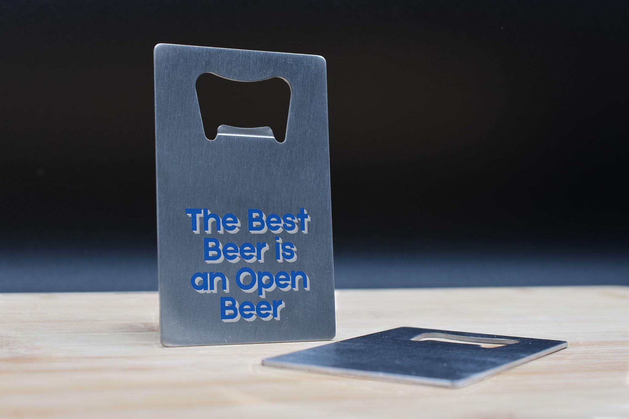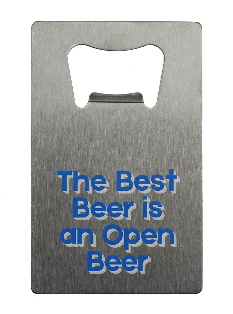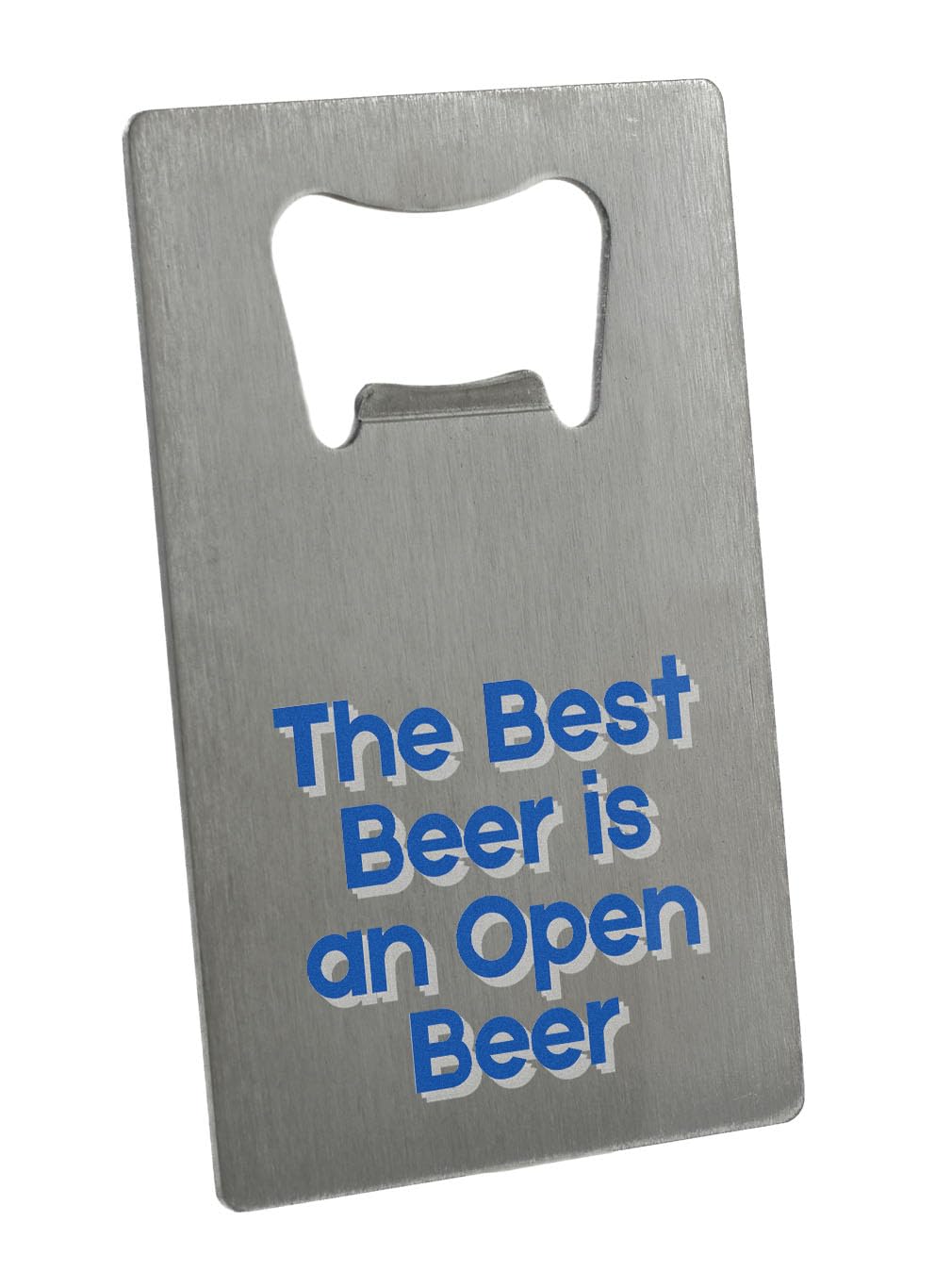 - Compact stainless steel bottle opener with a funny 'The Best Beer is an Open Beer' UV printed design
