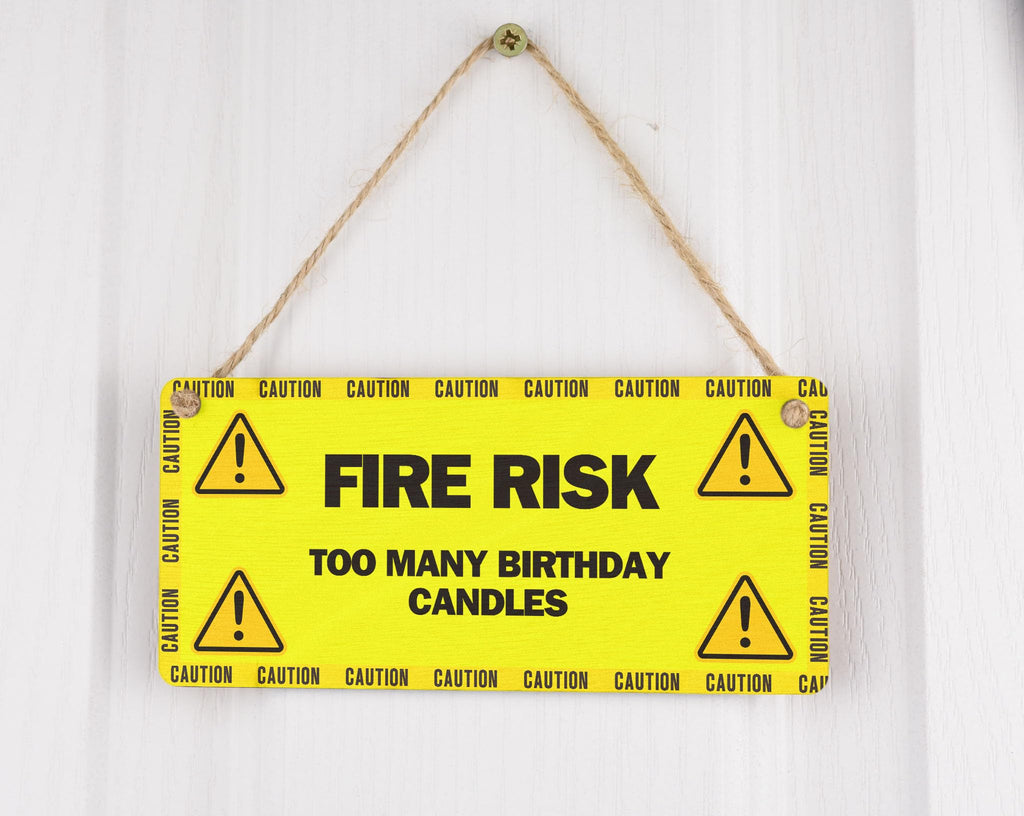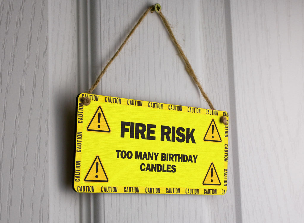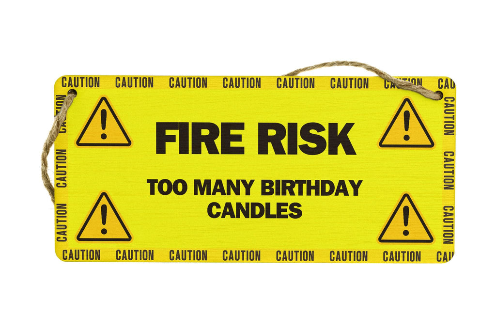 - Small hanging plaque with a humorous 'fire risk' warning for birthday celebrations