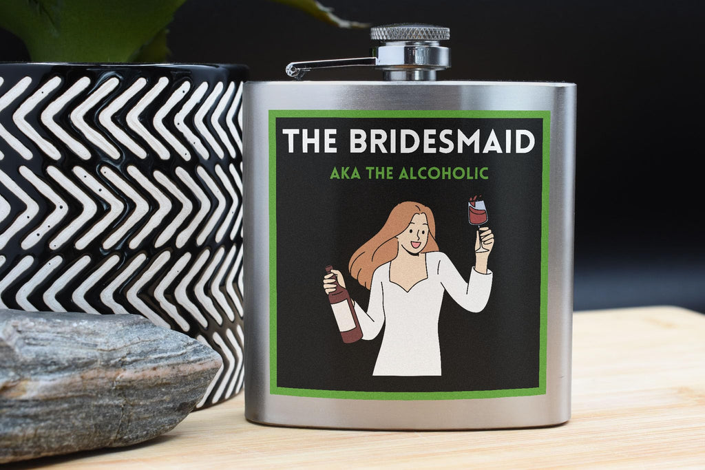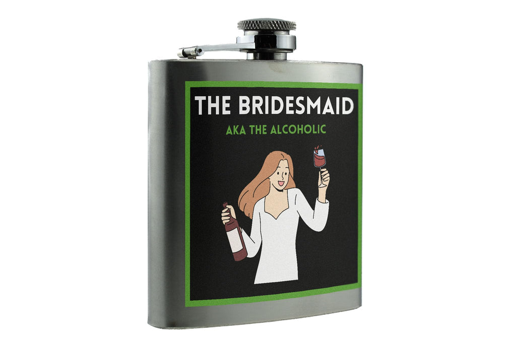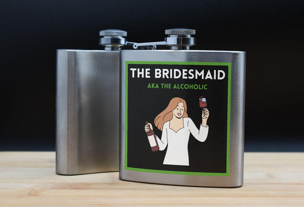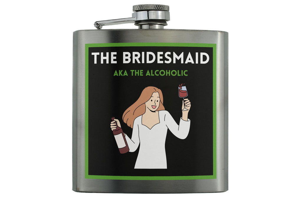 Introducing our Funny Bridesmaid Stainless Steel Hip Flask with Comical Design, the perfect gift for your wedding day or bachelorette party! This novelty drinkware is made of quality stainless steel, ensuring durability and long-lasting use. The portable size makes it easy to carry around, whether you're celebrating with friends or at a special occasion. The UV printed design features a humorous message that reads 'the bridesmaid aka the alcoholic', adding a fun touch to your drinking experience. This full-color printed hip flask is ideal for holding your favourite liquor and will surely be a hit at any party!