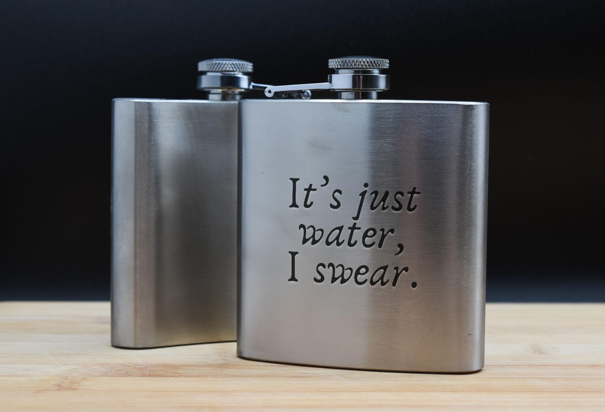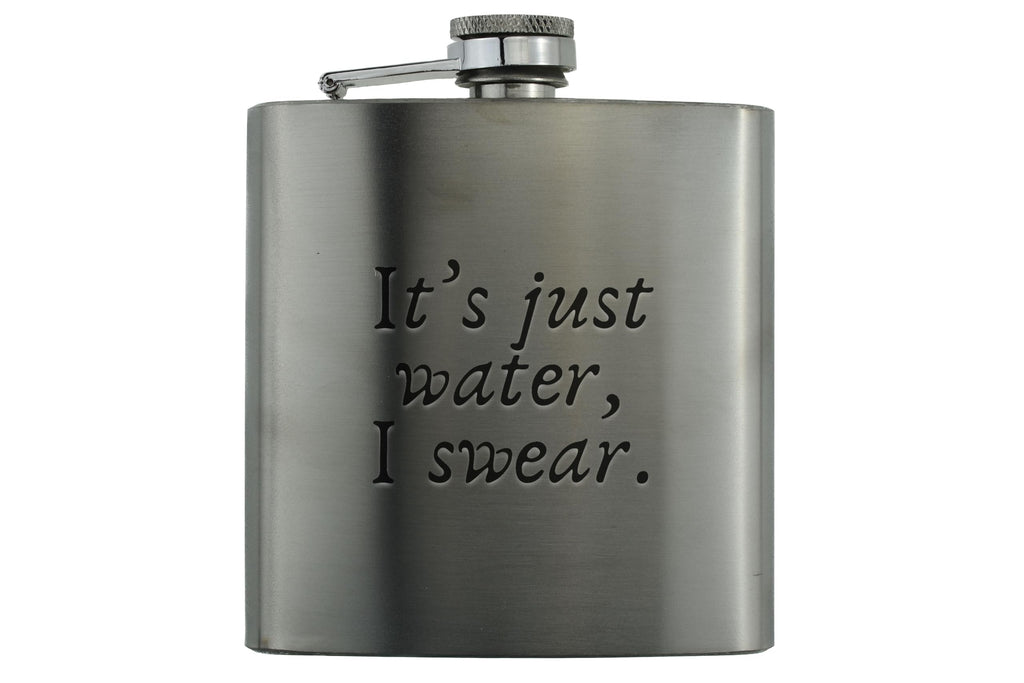 This Stainless Steel Flask is the perfect accessory for anyone looking to add a touch of humour to their barware collection. With its playful 'It's Just Water - I Swear' design, this quirky hip flask is sure to be a conversation starter at any gathering. Whether you're looking for a secret drink container for drinking on the go or a fun alcohol accessory to bring to parties, this humour-themed flask has got you covered. Made from lightweight stainless steel, this portable beverage holder is ideal for those who prioritise both style and convenience.
