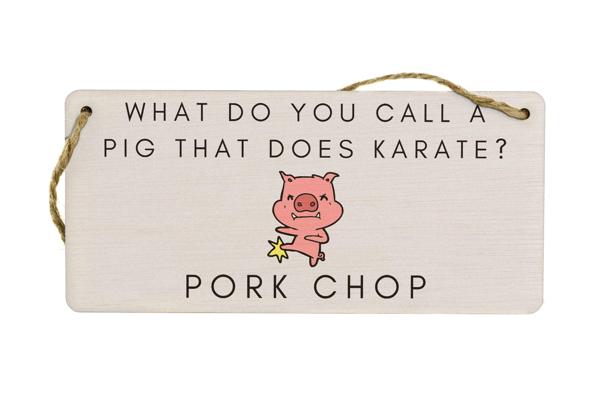- Reads 'what do you call a pig that does karate? Pork chop'