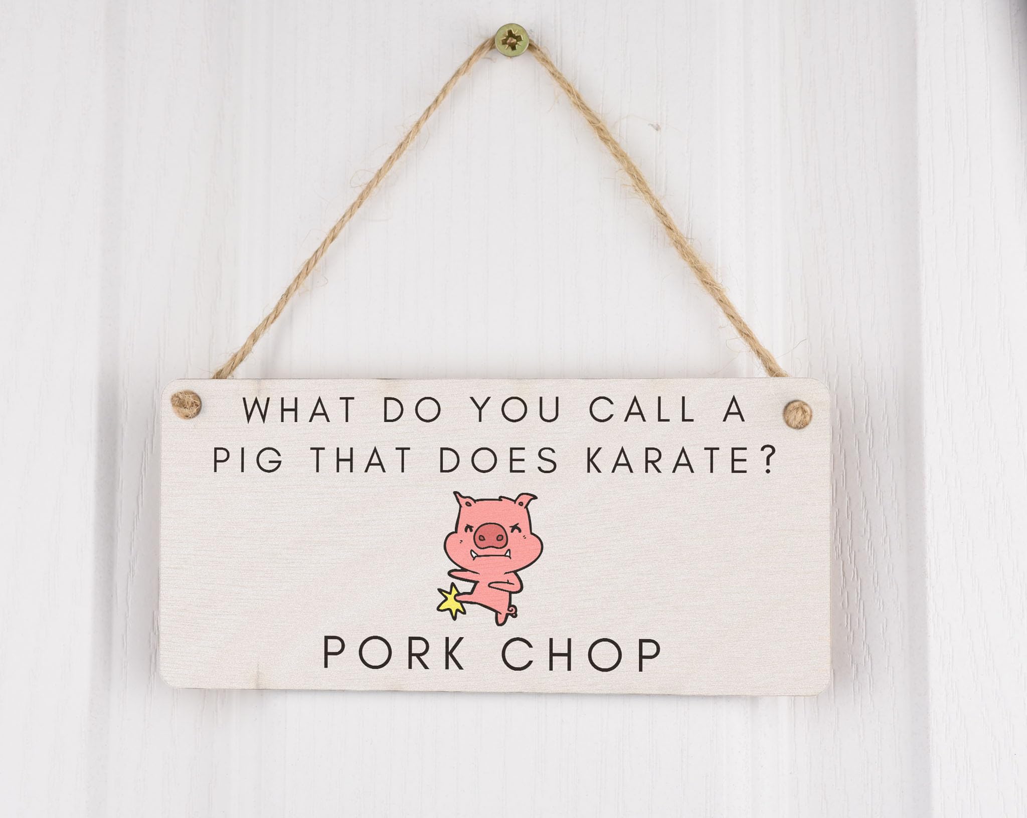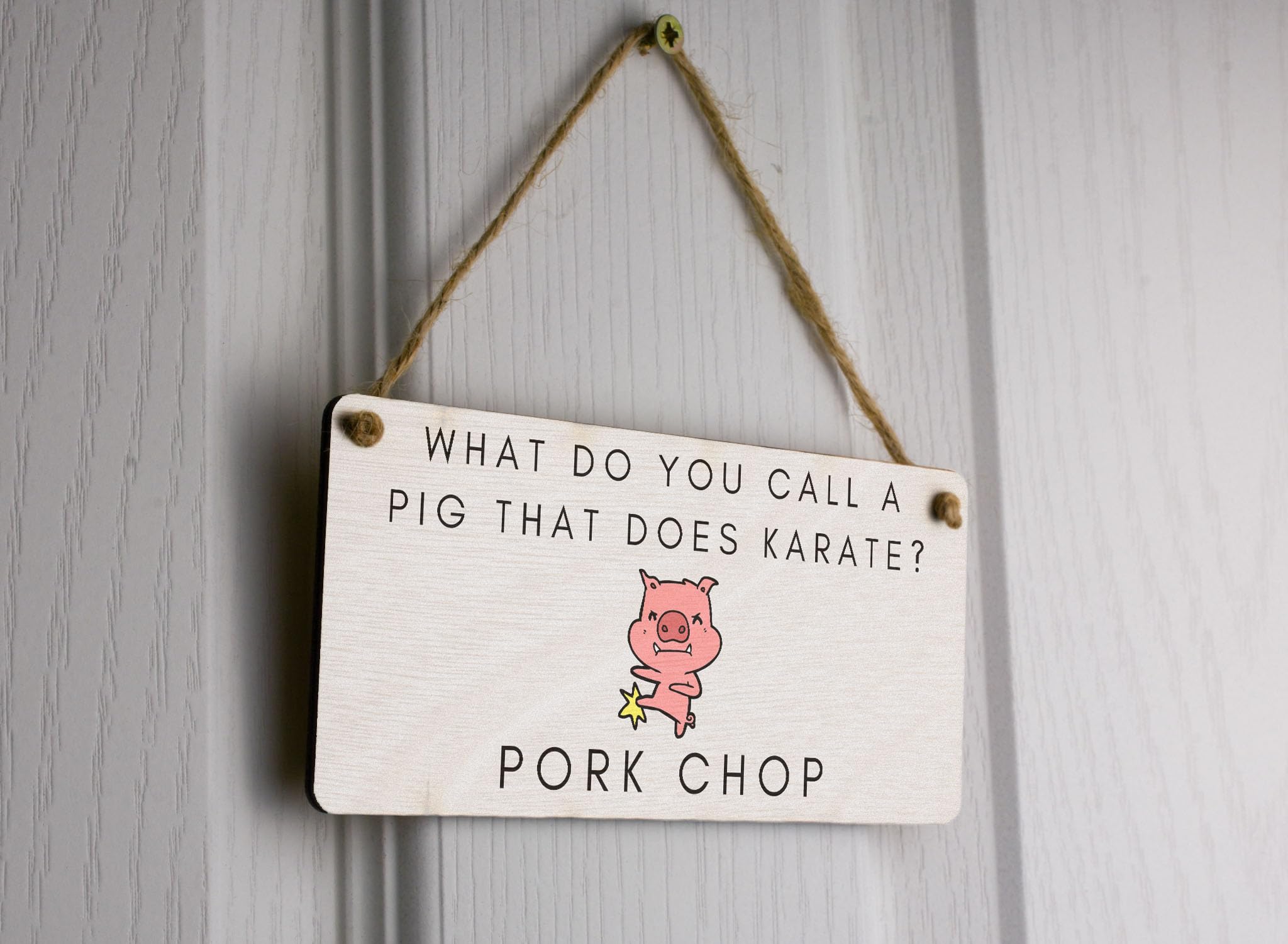 Add a touch of whimsy and humour to your kitchen decor with this Funny Pig Joke Karate Pork Chop Sign. This quirky wall art is perfect for those who love animal-themed decor and enjoy a good laugh. Handcrafted from laser-cut plywood, this humorous plaque features a cute pig design and a punny joke that reads 'what do you call a pig that does karate? Pork chop'. The full colour printed sign is UV printed for durability and comes with twine for easy hanging. This novelty item is a great gift for chefs, or anyone who appreciates playful decor and gag gifts. Bring some laughter into your home with this fun and unique joke wall hanging.